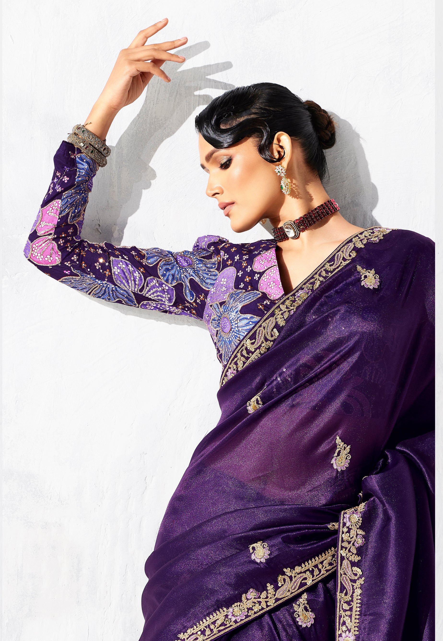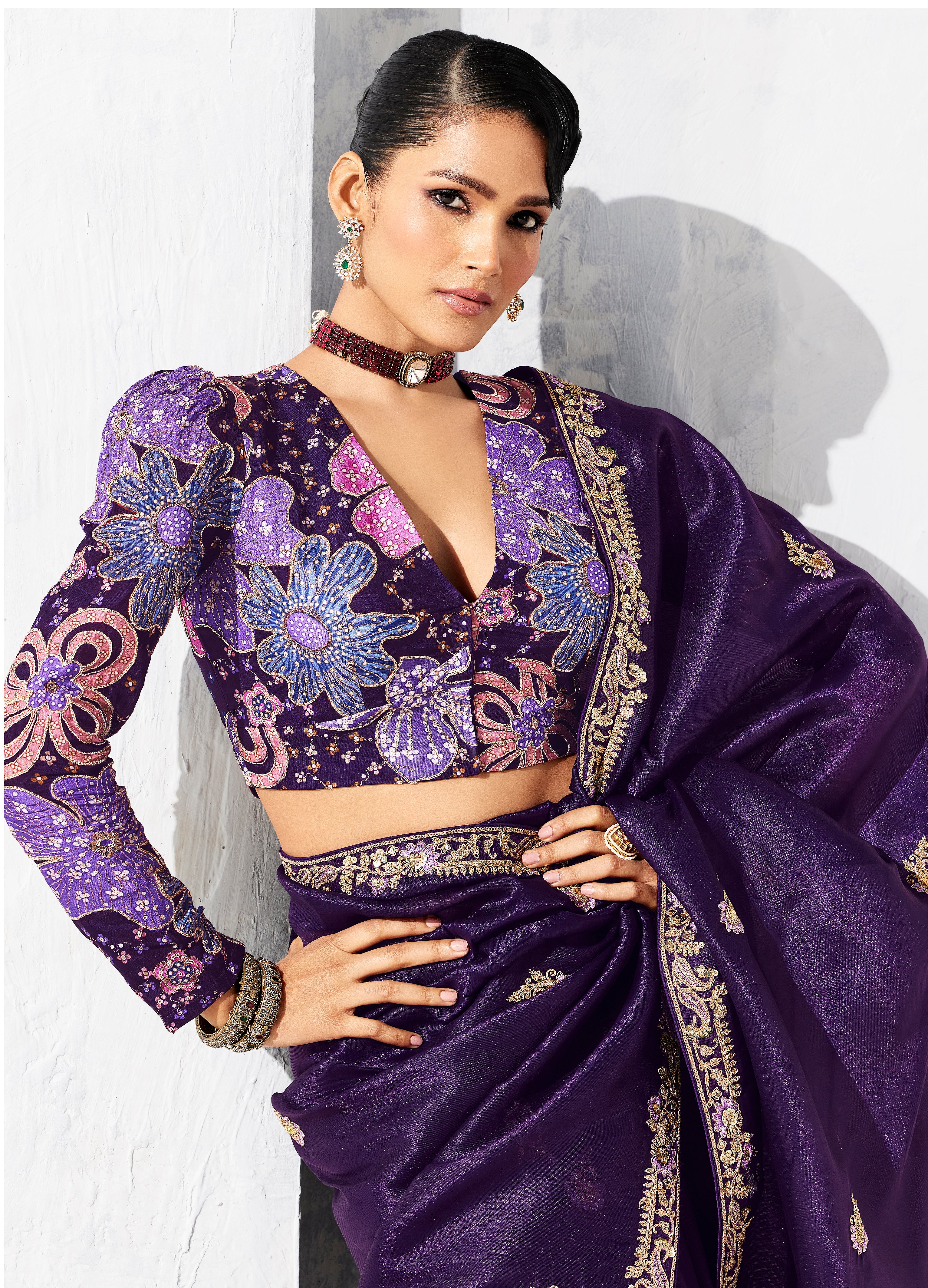 Elevate your ethnic style with this Designer Purple Fancy Tissue Saree Blouse Party Wear. Crafted from fancy fabric, this saree exudes a luxurious shine and smooth texture, making it the perfect choice for weddings, parties, receptions, and festive occasions. The saree is adorned with delicate golden motifs and a finely detailed embroidered border, adding a regal touch to your traditional look. Paired with a stunning blouse embellished with floral threadwork and sequin accents, this ensemble ensures you stand out with elegance and grace. Whether you’re attending a wedding ceremony, festive gathering, or special celebration.