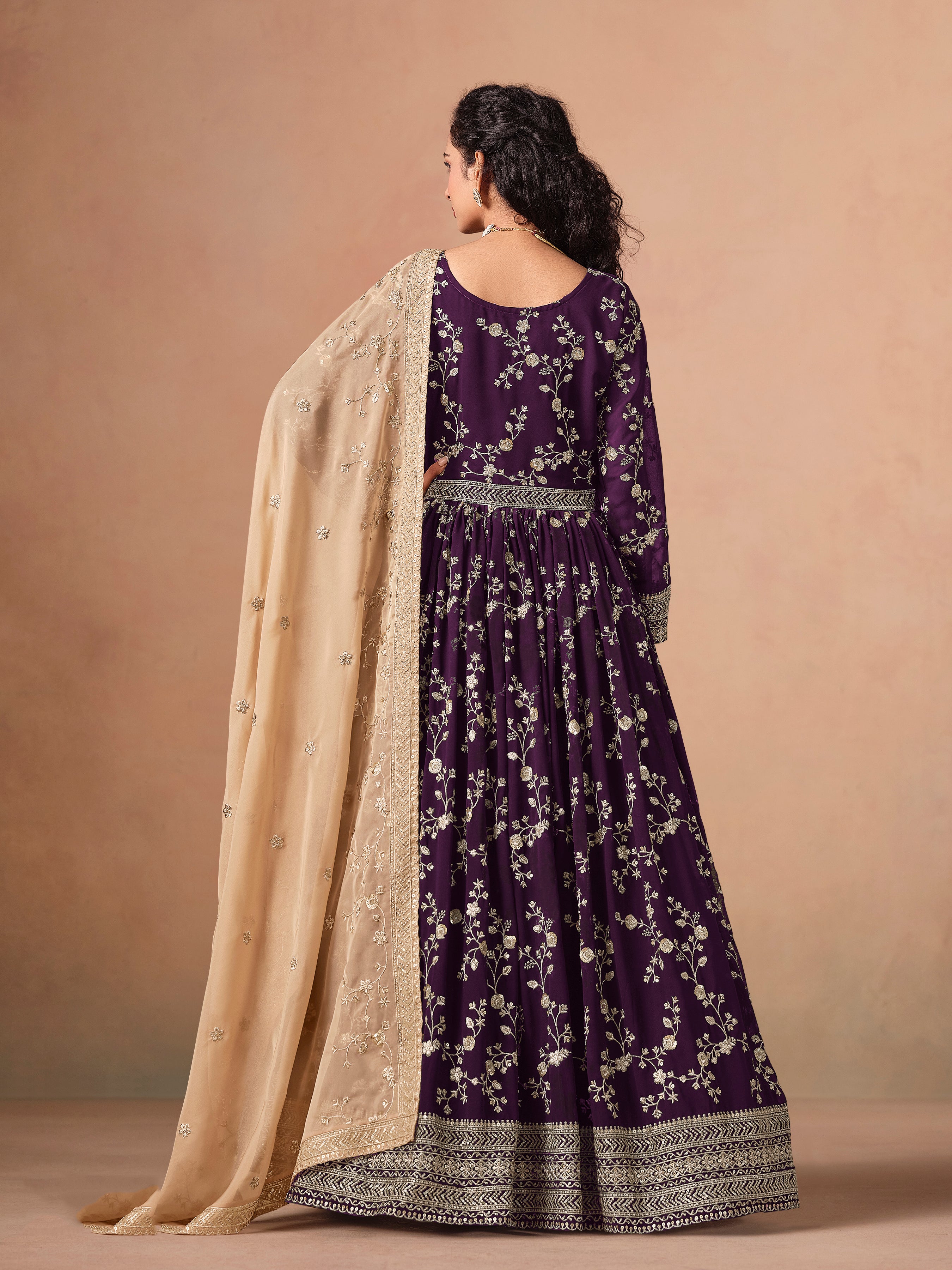 Real magnificence can come out through the dressing trend with this Purple Georgette anarkali salwar suit. The gorgeous sequins, thread and zari work a vital attribute of this attire. Comes with matching bottom and dupatta. (Slight variation in color, fabric & work is possible. Model images are only representative.)