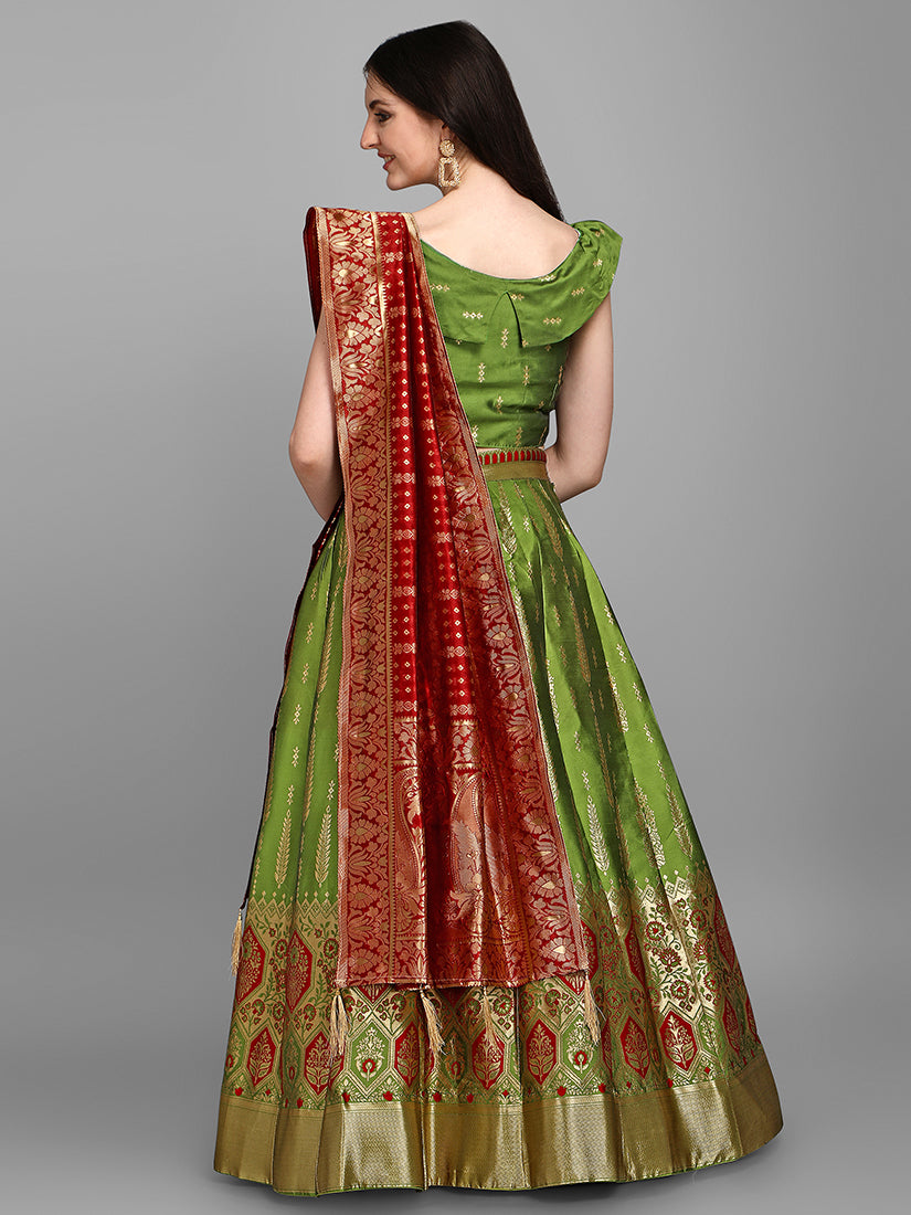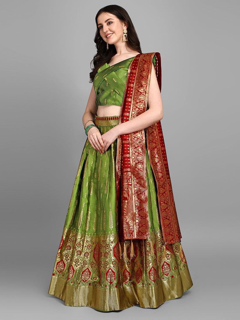 Be an angel and create and establish a smashing impression on for every person by carrying this Green Colour Jacquard trendy lehenga choli. The ethnic Woven work at the clothing adds a sign of attractiveness statement with your look. Comes with matching choli and red banarasi dupatta. The stitched lehenga Free Size and unstitched choli bust size can be customized from 34 to 42 inches.