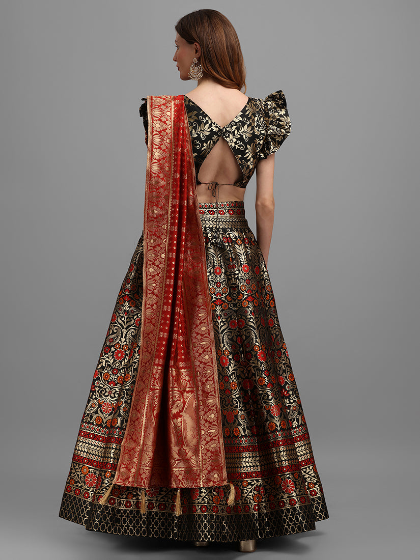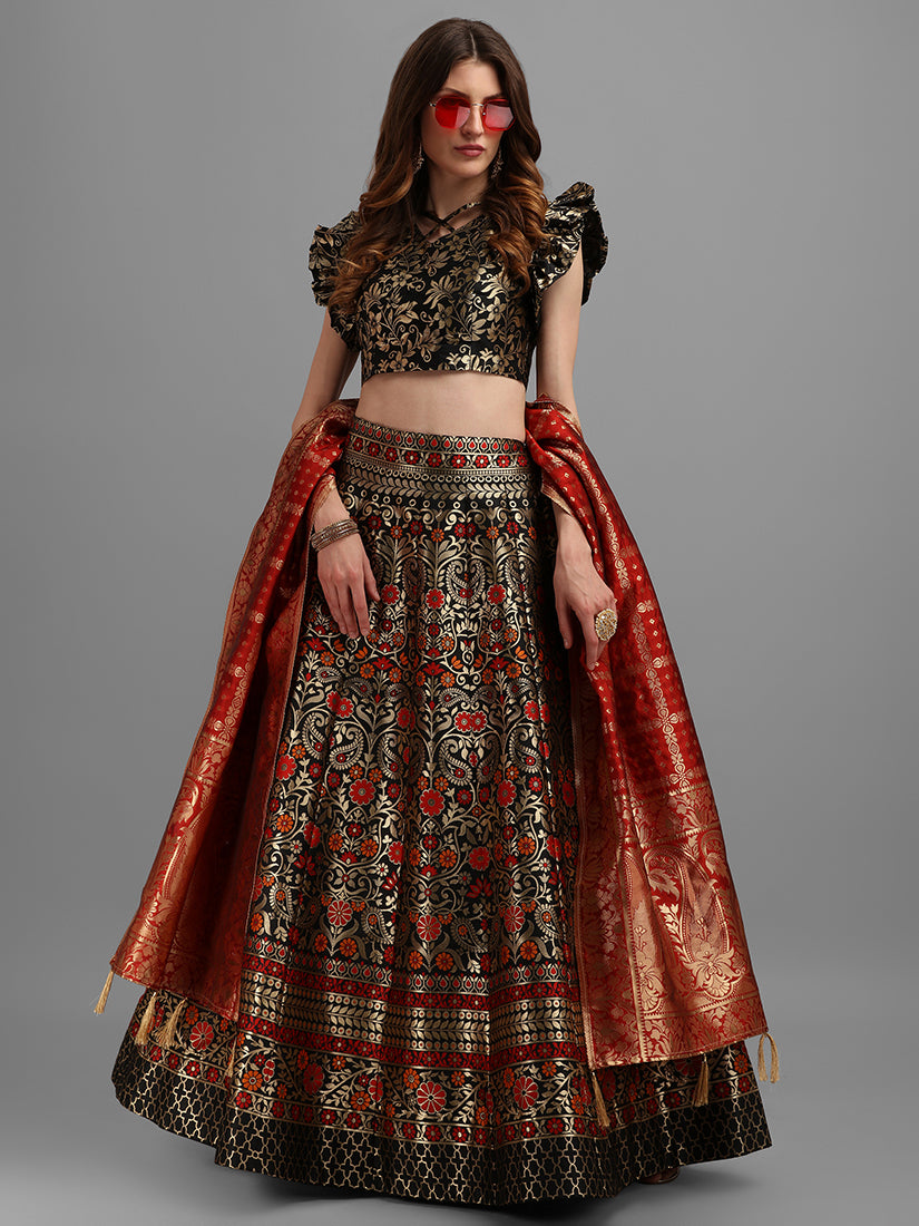 Everyone Will Admire You When You Wear This Clad To Elegant Affairs. Real Beauty Comes Out From Your Dressing Style With This Black Colour Jacquard Long Choli Lehenga. This Ravishing Attire Is Amazinglyi Work Banarasi Zari Woven Work. Comes With Matching Jacquard Choli And Red Banarasi Dupatta. The Stitched Lehenga Choli Bust Size Can Be Customized From 34 To 42 Inches.