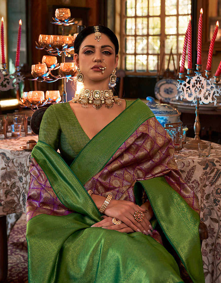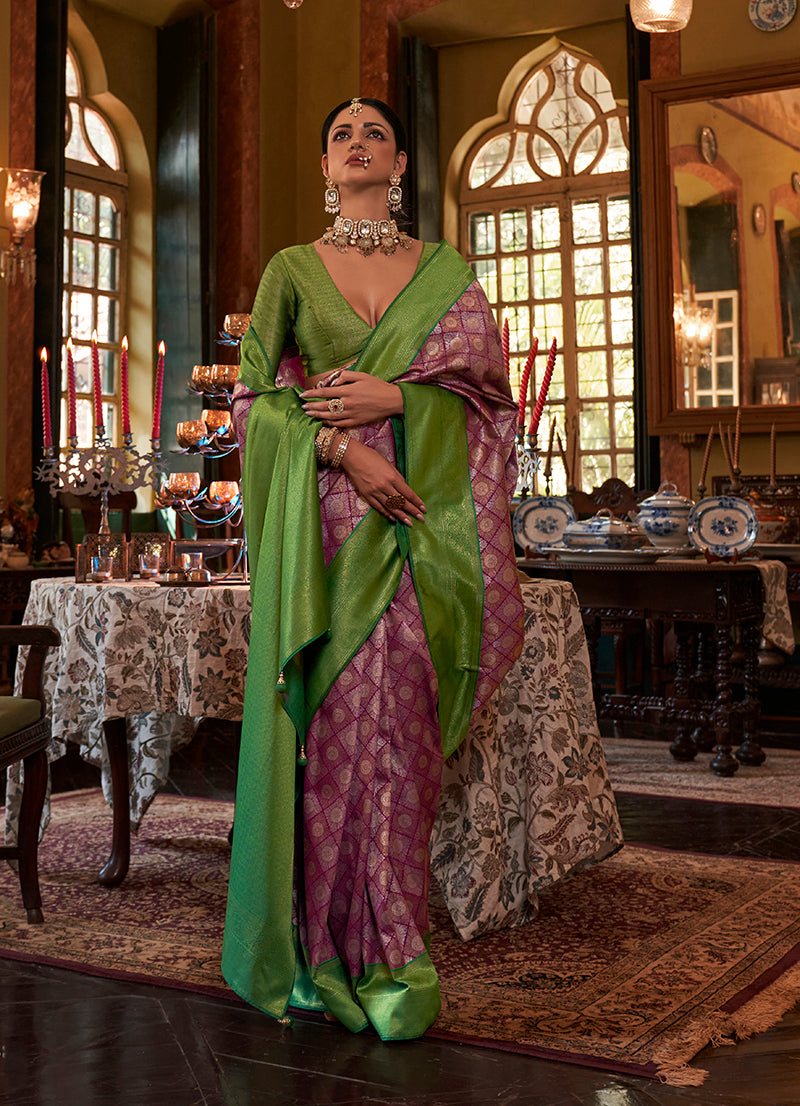 A celebration of timeless weaving, this Purple Kanjivaram silk saree is understated opulence. The rich hue is complemented by traditional gold zari detailing—ideal for those who appreciate quiet luxury with a cultural soul.