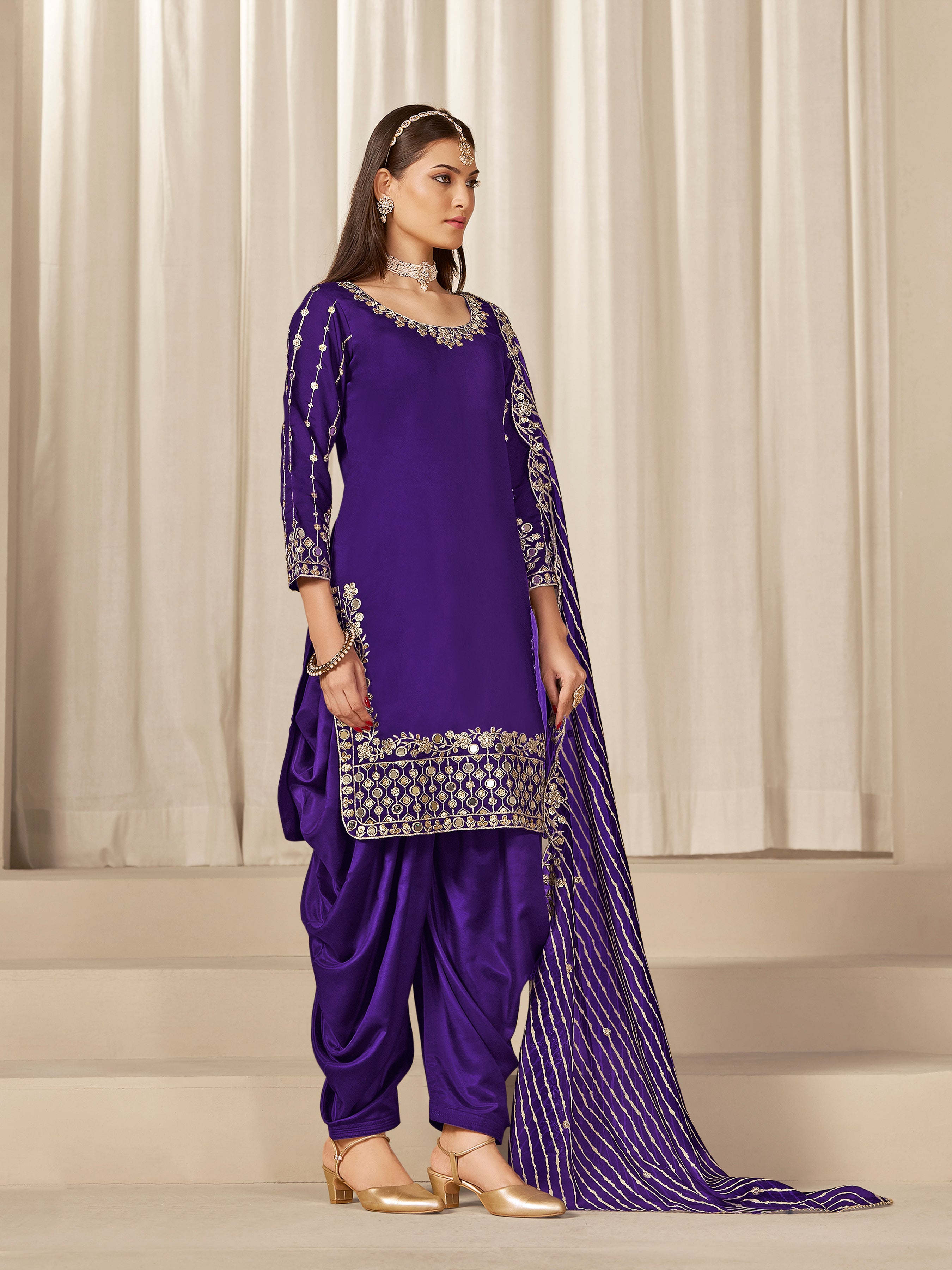 Real magnificence can come out through the dressing trend with this Purple roman silk patiala salwar suit. The gorgeous mirror, sequins, thread and zari work a vital attribute of this attire. Comes with matching bottom and dupatta. (Slight variation in color, fabric & work is possible. Model images are only representative.)