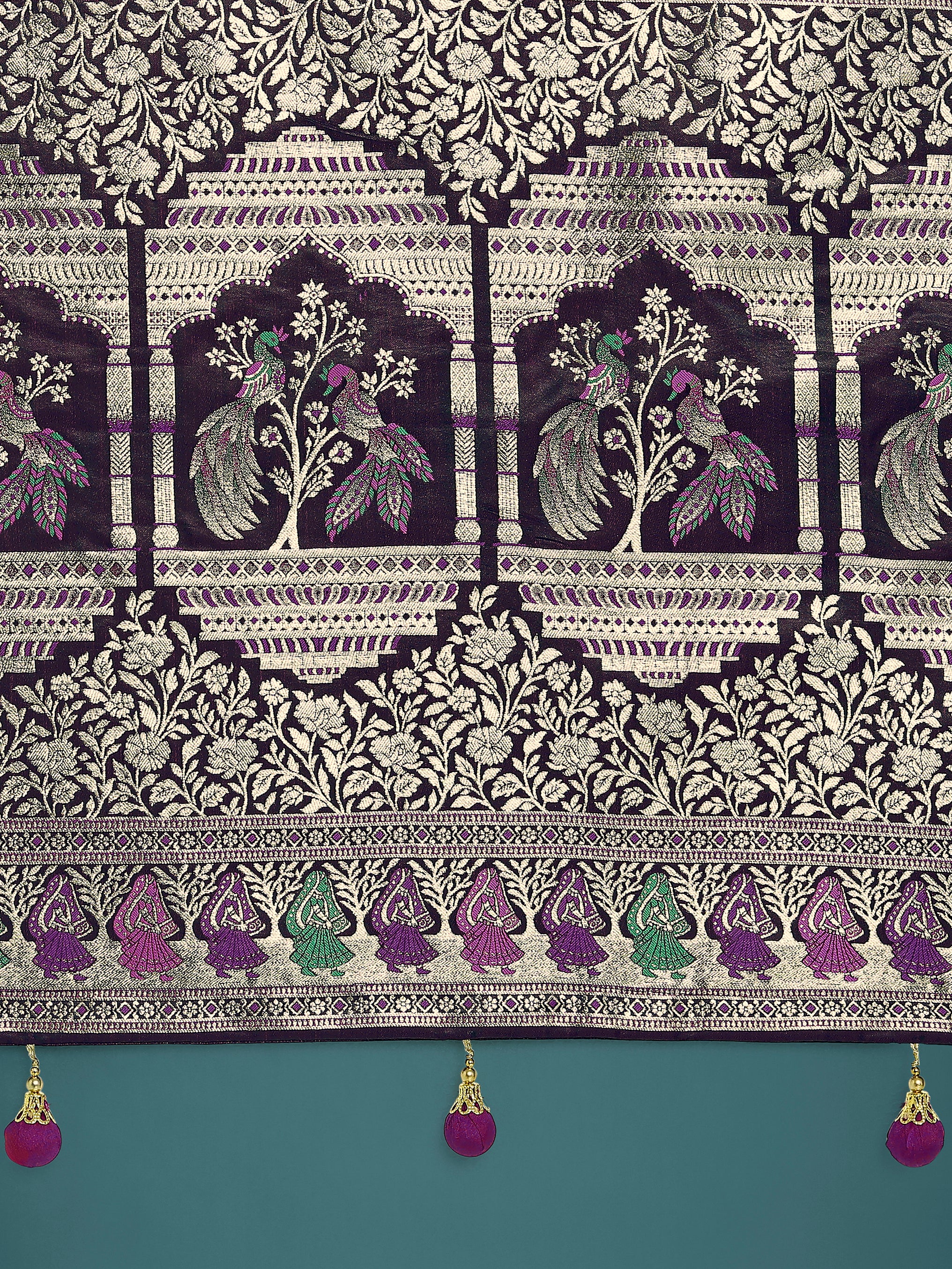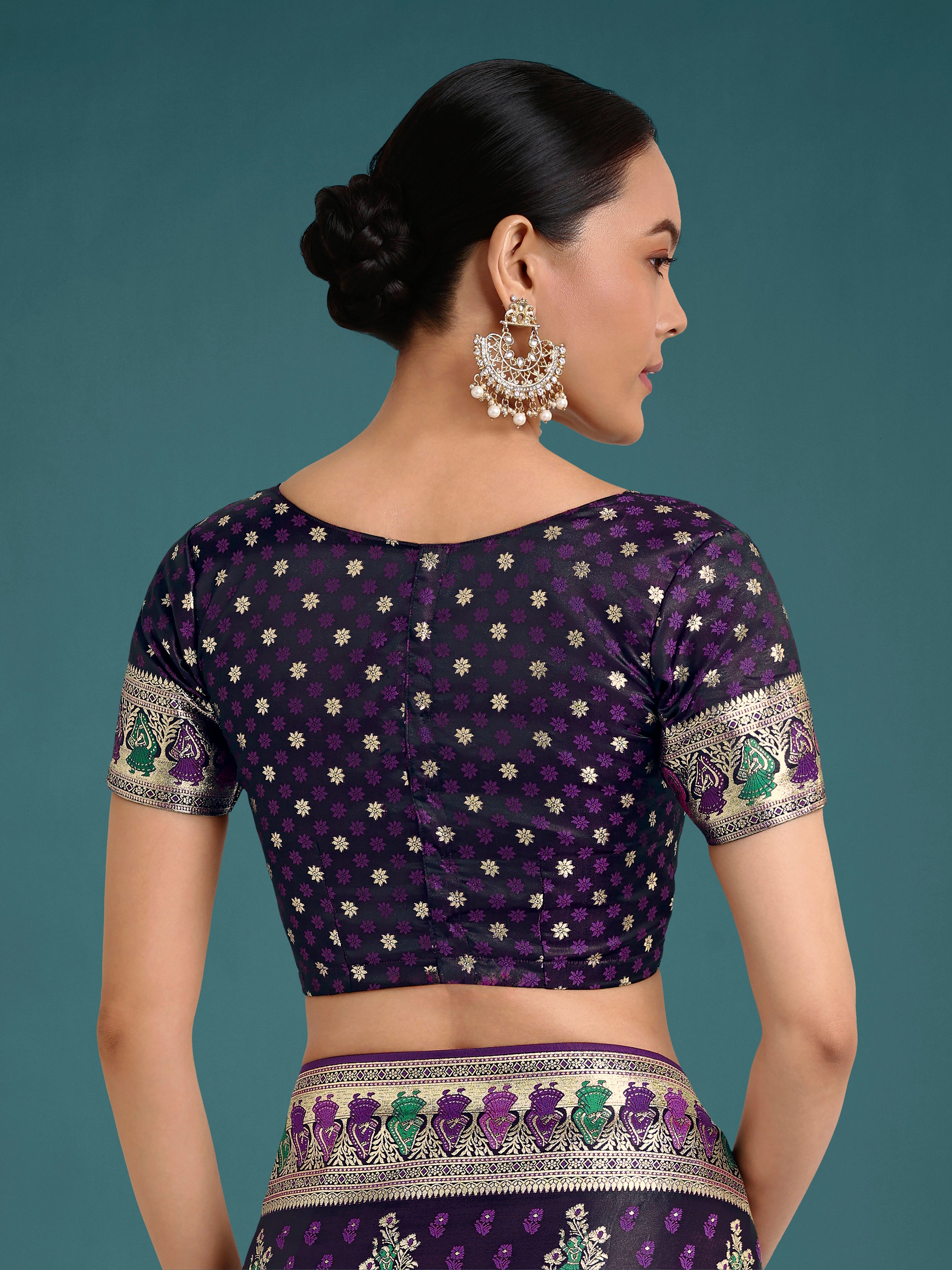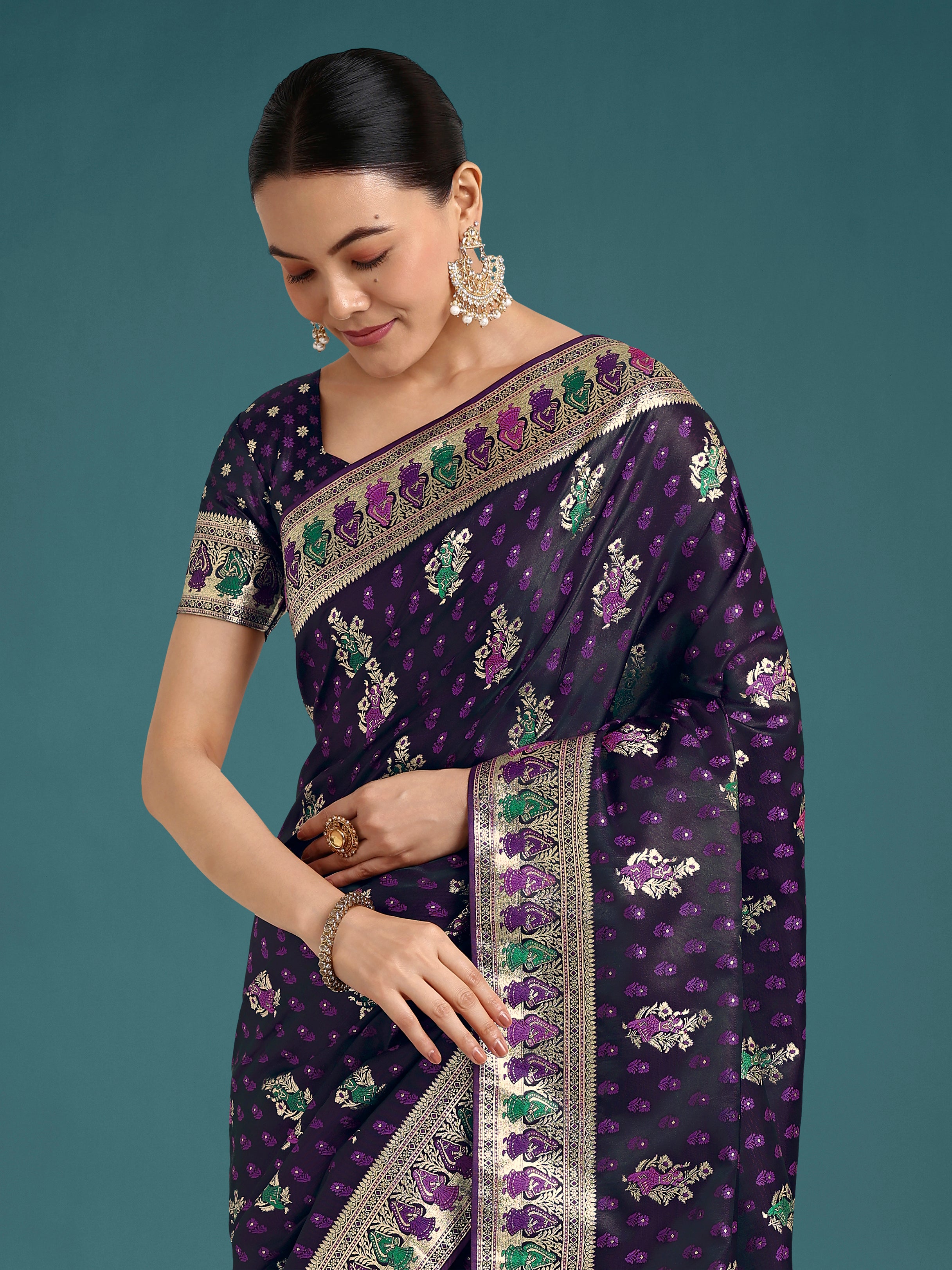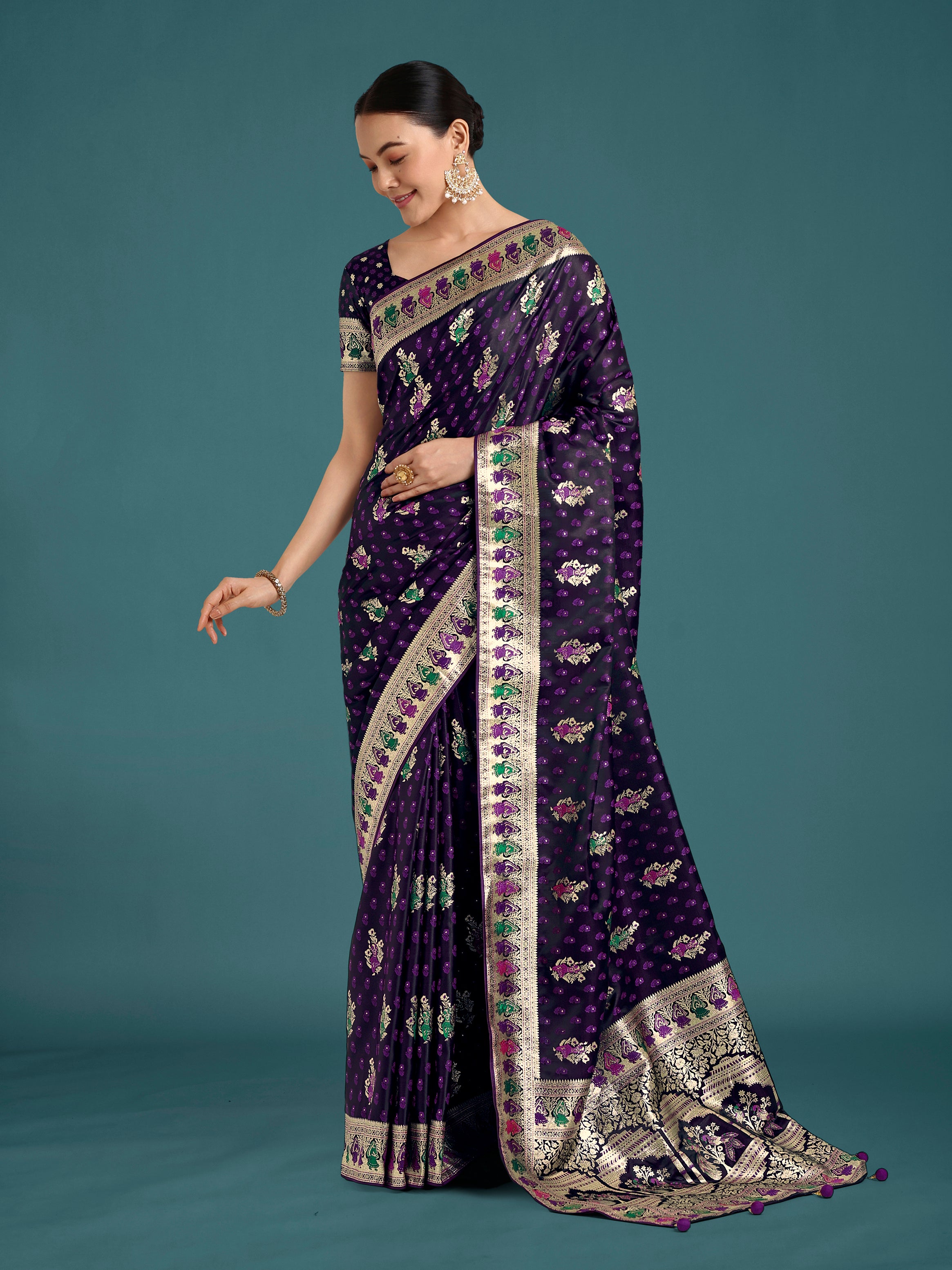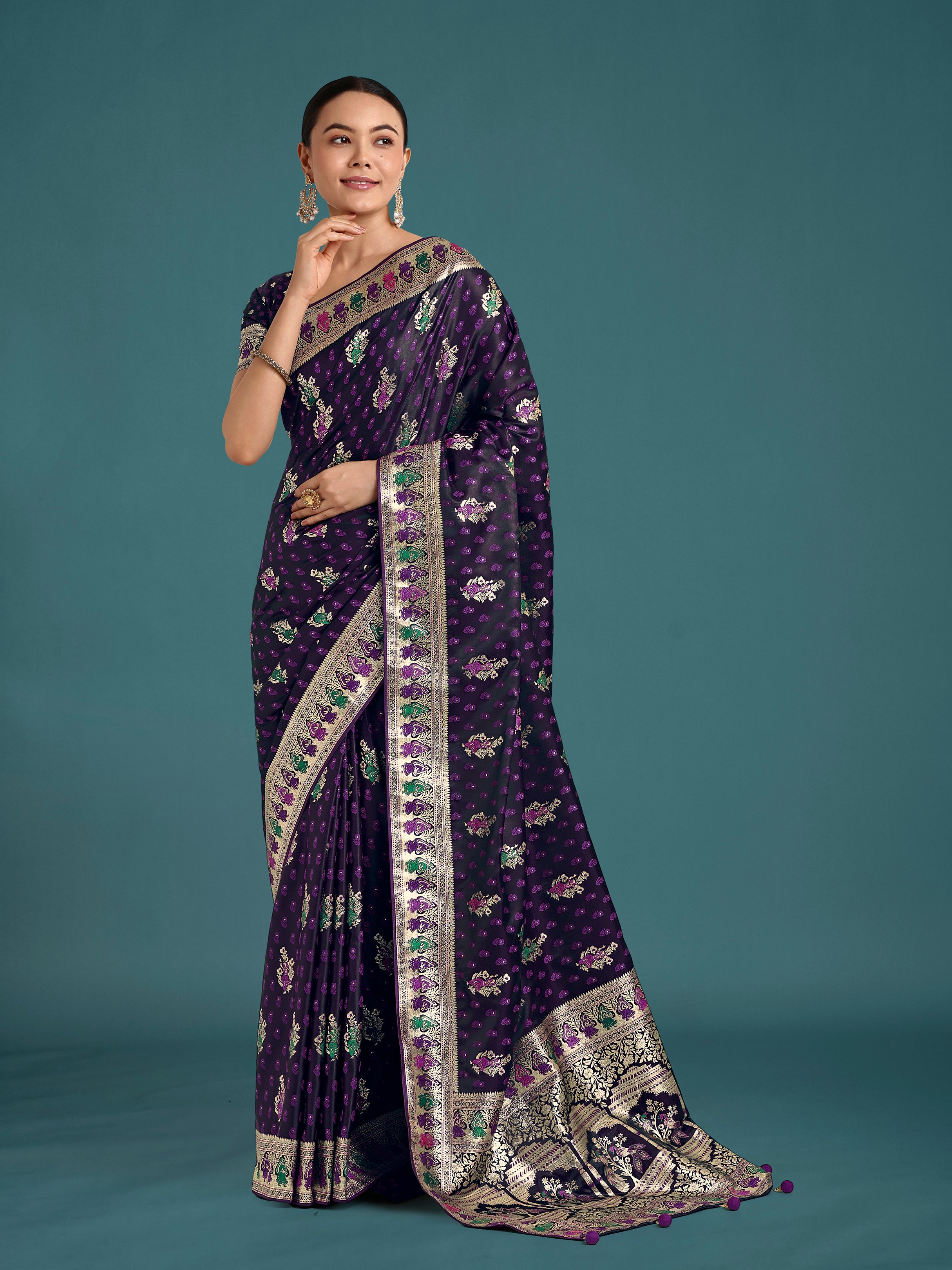 This delightful diva accoutre features unique styling and unusual material. Women magnificence is magnified tenfold in this alluring Purple Banarasi satin silk contemporary saree. The ethnic border, fancy, zari weaving work and lace work for the attire adds a sign of magnificence statement with a look. Comes with matching blouse. (Slight variation in color, fabric & work is possible. Model images are only representative.)