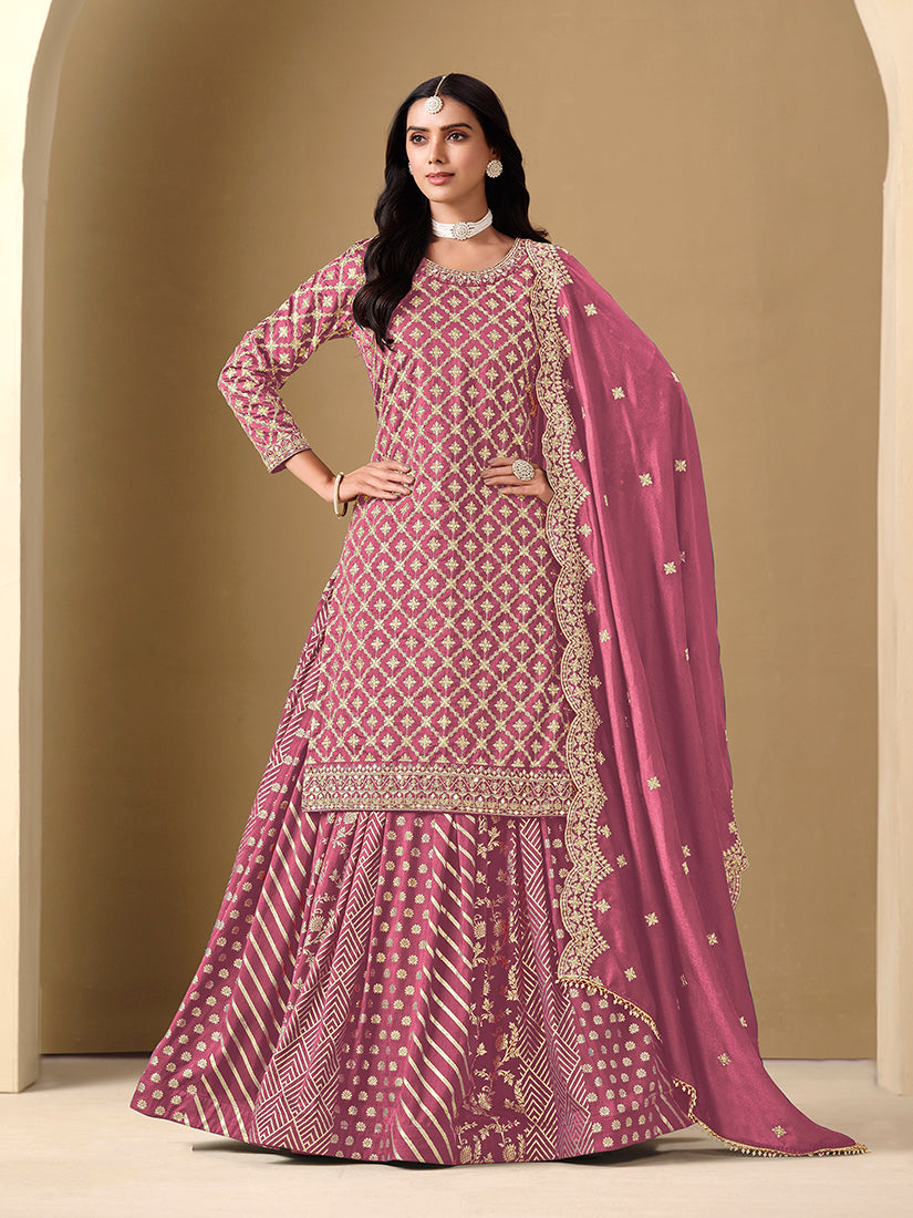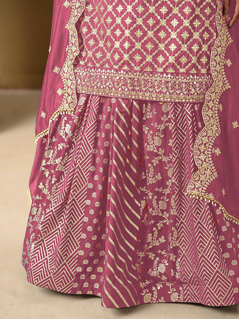 Include your self in a glamour of a season with this pink art silk dola jacquard trendy salwar kameez. This beautiful attire is showing some amazing embroidery done with embroidered work. Comes with matching bottom and dupatta.