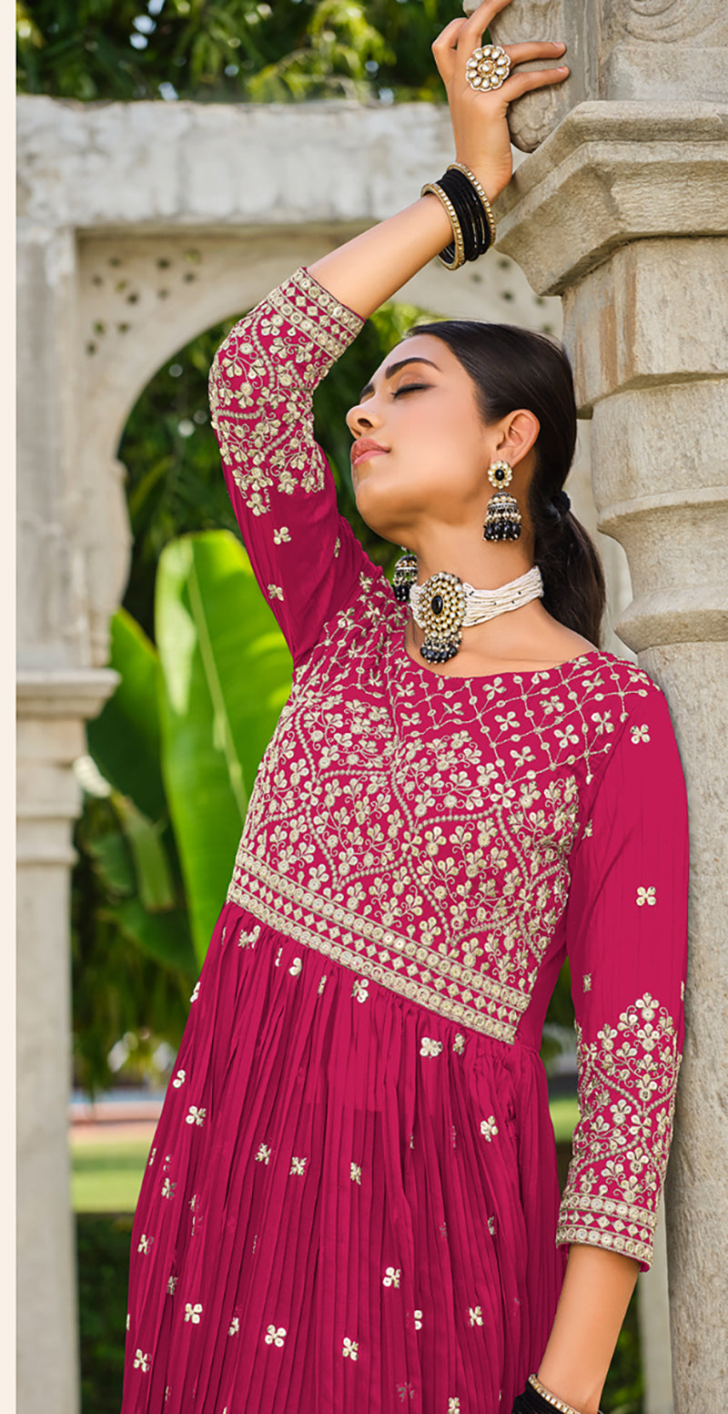 Monjolika Fashion Presents Appear stunningly engaging in this Rani Pink Color Georgette salwar kameez. The appealing embroidered work a significant element of this attire. Comes with matching Santoon bottom and Georgette dupatta.