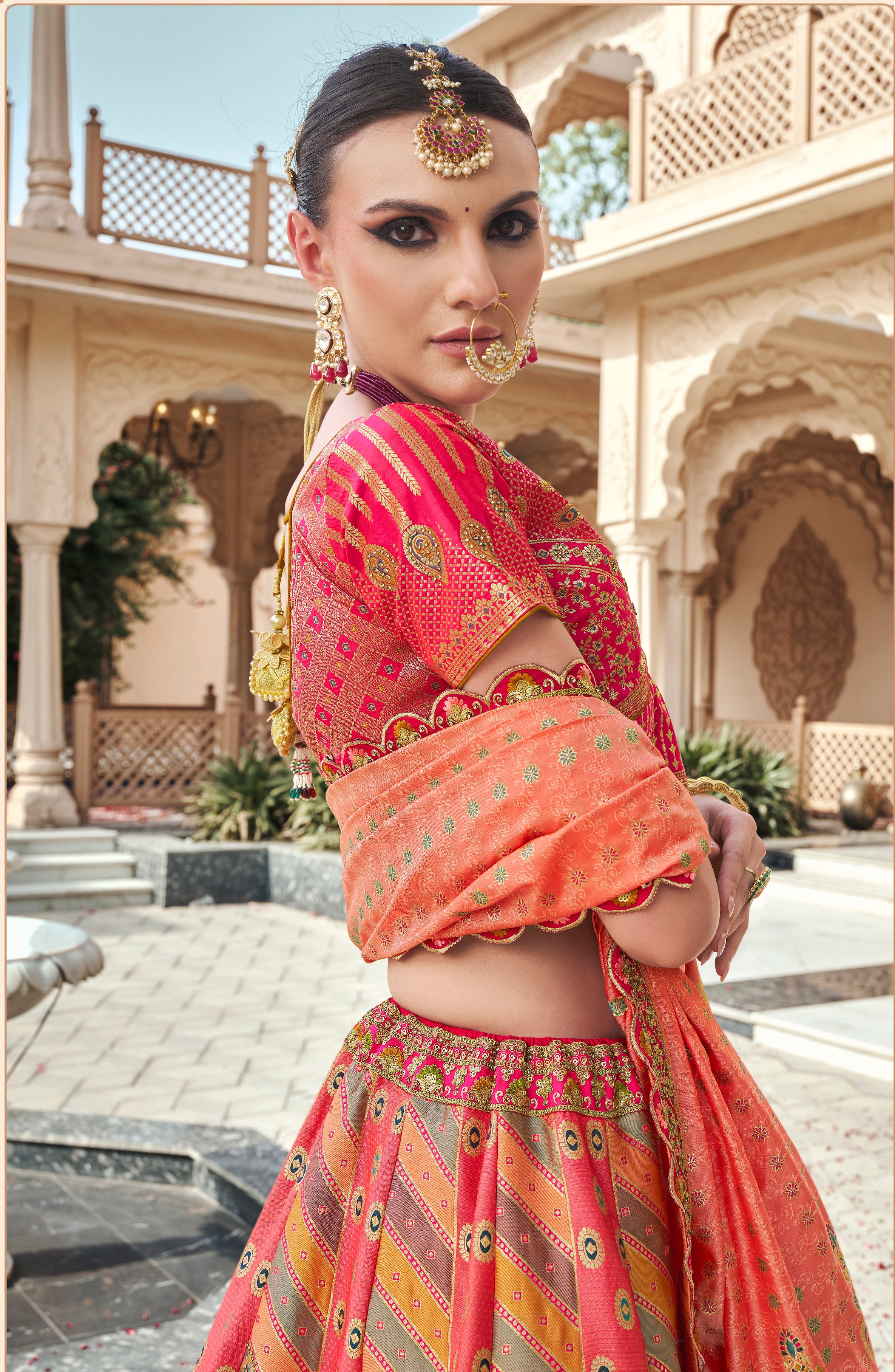 True elegance can come out from your dressing style and design with this Multicolor & Rani Pink banarasi silk designer lehenga choli. This dress is showing some really mesmerizing and sophisticated patterns with cord, embroidered, zarkan, cut-dana, weaving and zari work. Comes with unstiched choli and dupatta.
