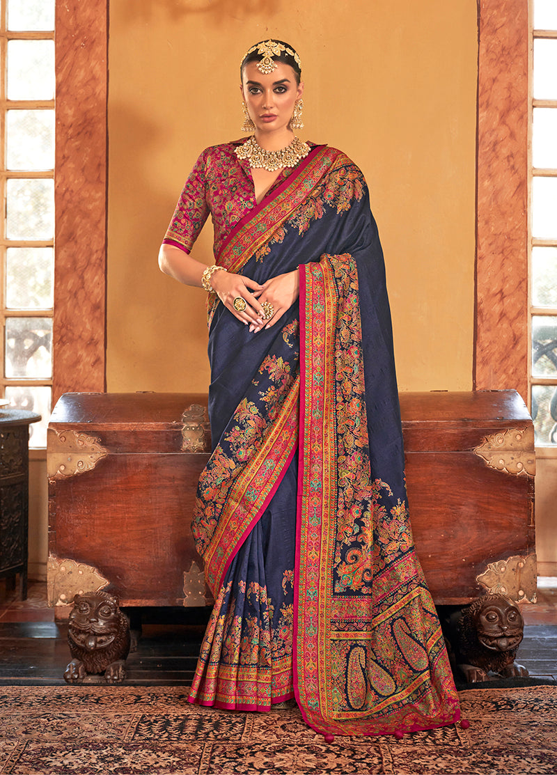 Designed with simplicity with a touch of soberness in its work makes a masterpiece. Keep ahead in fashion with this navy blue silk classic saree. Beautified with print work all synchronized well with the pattern and design of the attire. Comes with unstitched blouse. Do Note: All the accessories shown are for styling purposes only. Slilght color variation may occur due to photographic reasons.