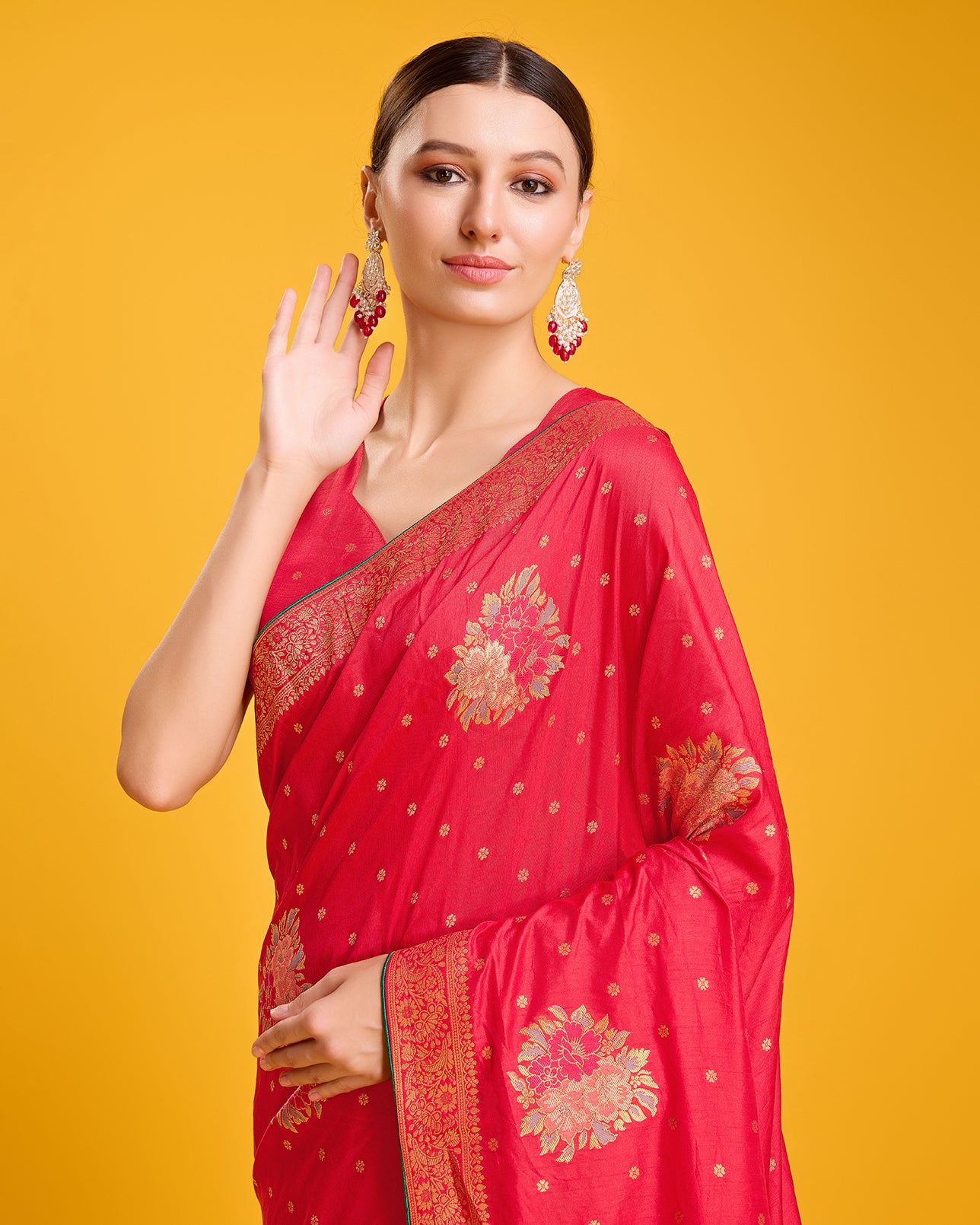 Elegant Red Dola Silk Saree Intricately Woven Zari Work for Timeless Charm Comes With Unstitched Blouse. Banarasi dola silk is known for its elaborate designs and motifs inspired by Mughal and Persian art, including buta (paisley), floral jaal (network), bel (creeper), and kalga (floral motifs).