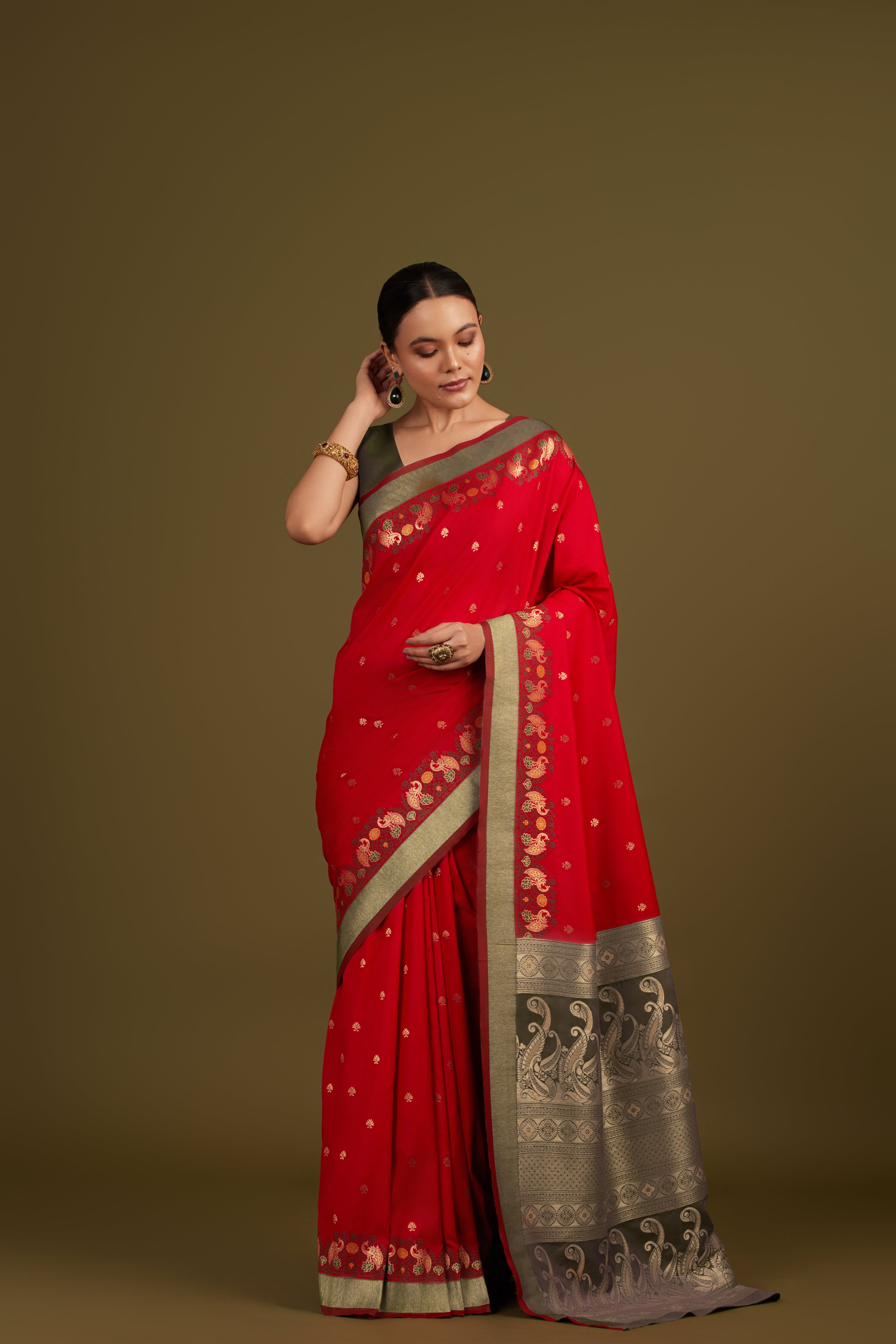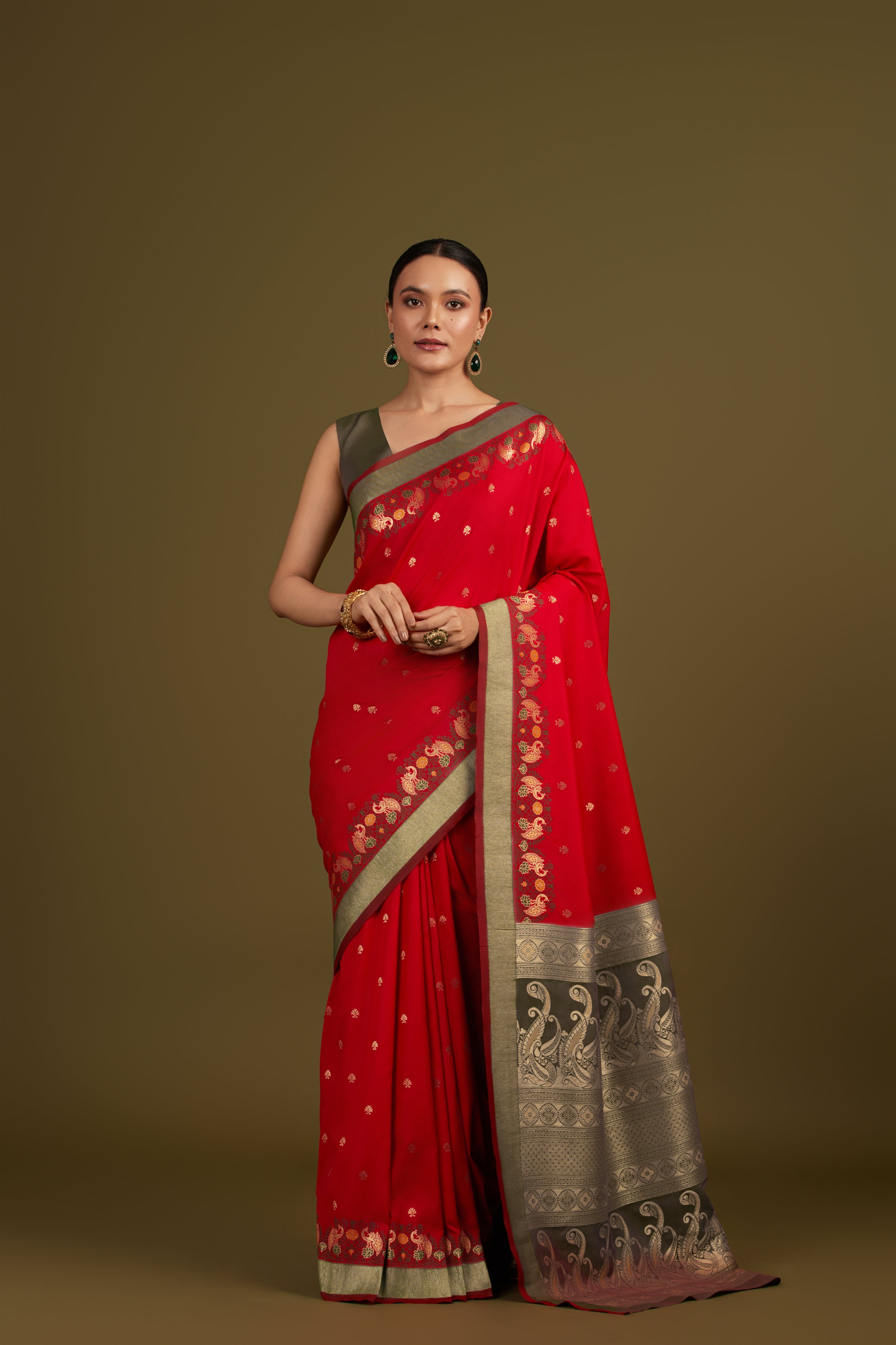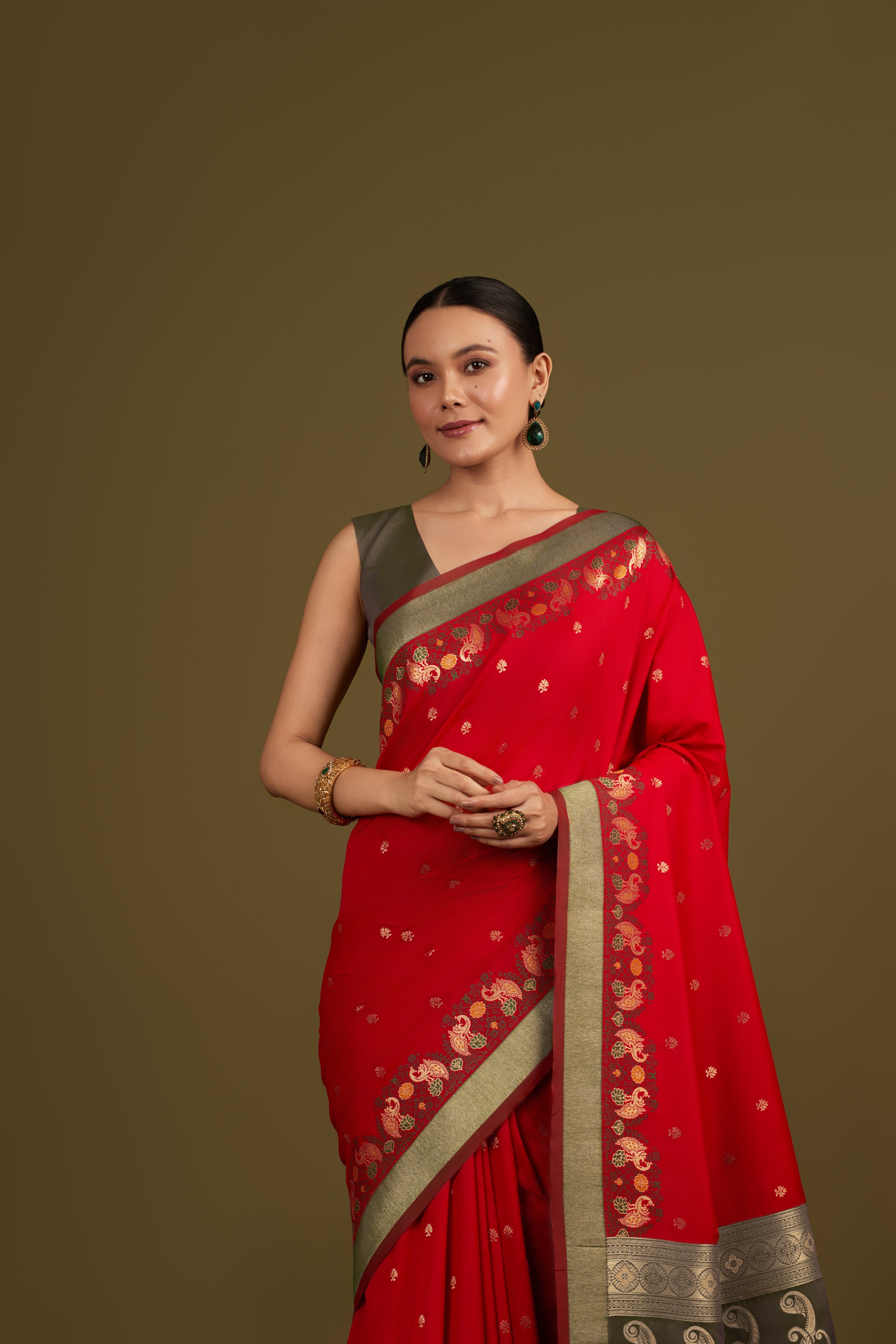 Red Banarasi Silk Blend Saree, Featuring A Graceful Paisley Pattern That Is Intricately Woven With Shimmering Zari. The Saree Is Enhanced By A Rich Contrast Pallu, Adding An Exquisite Touch Of Color And Contrast.