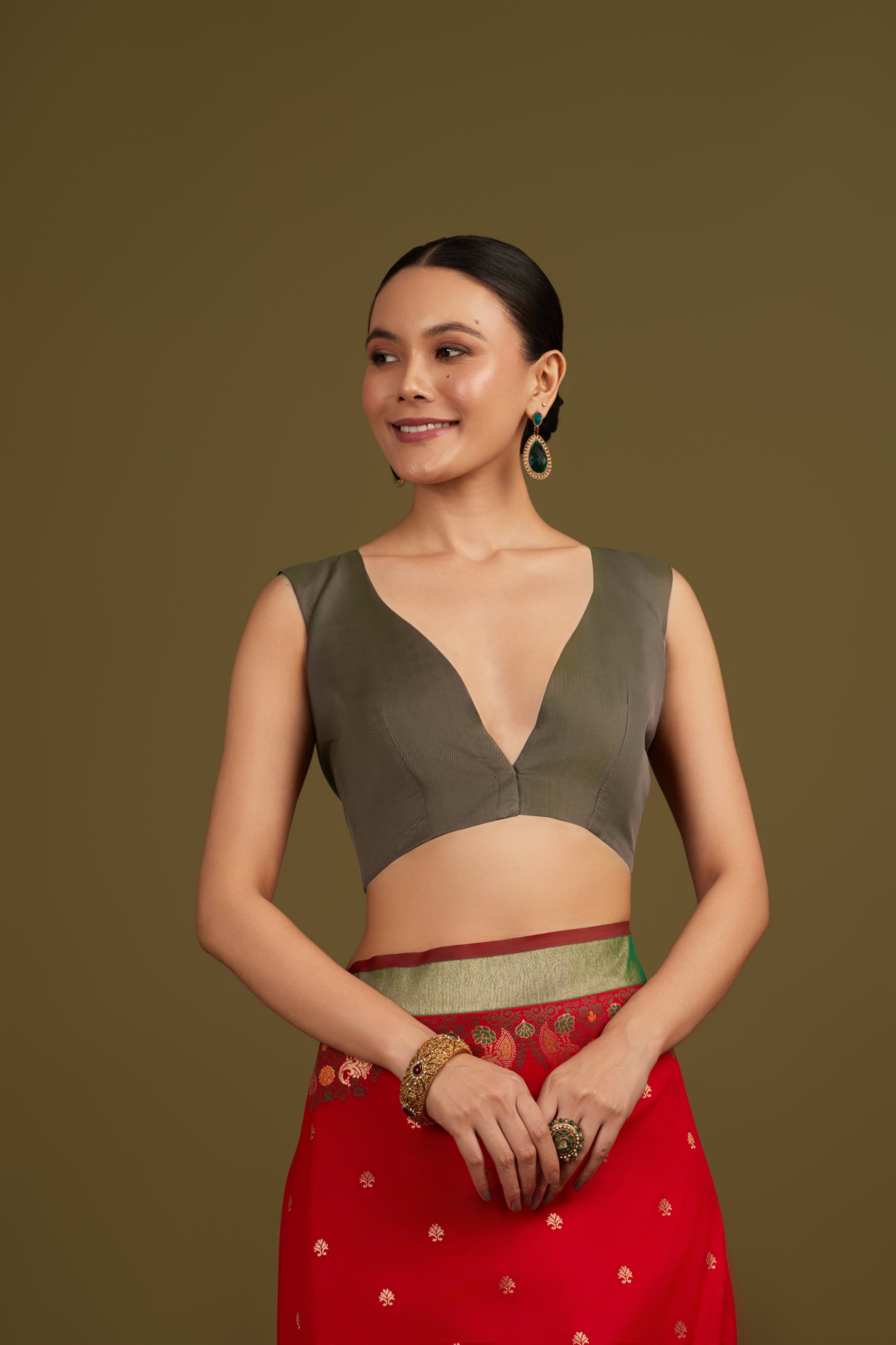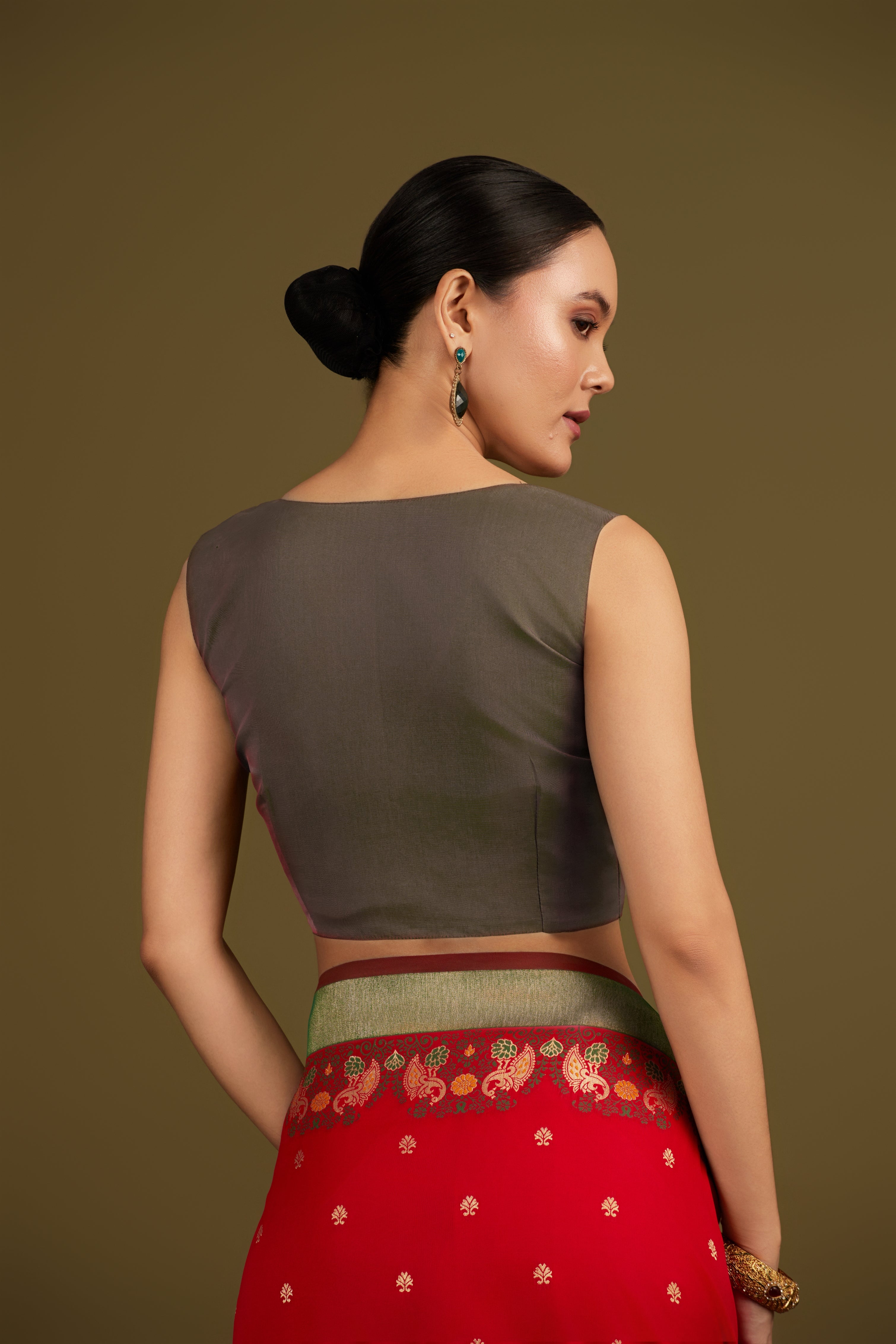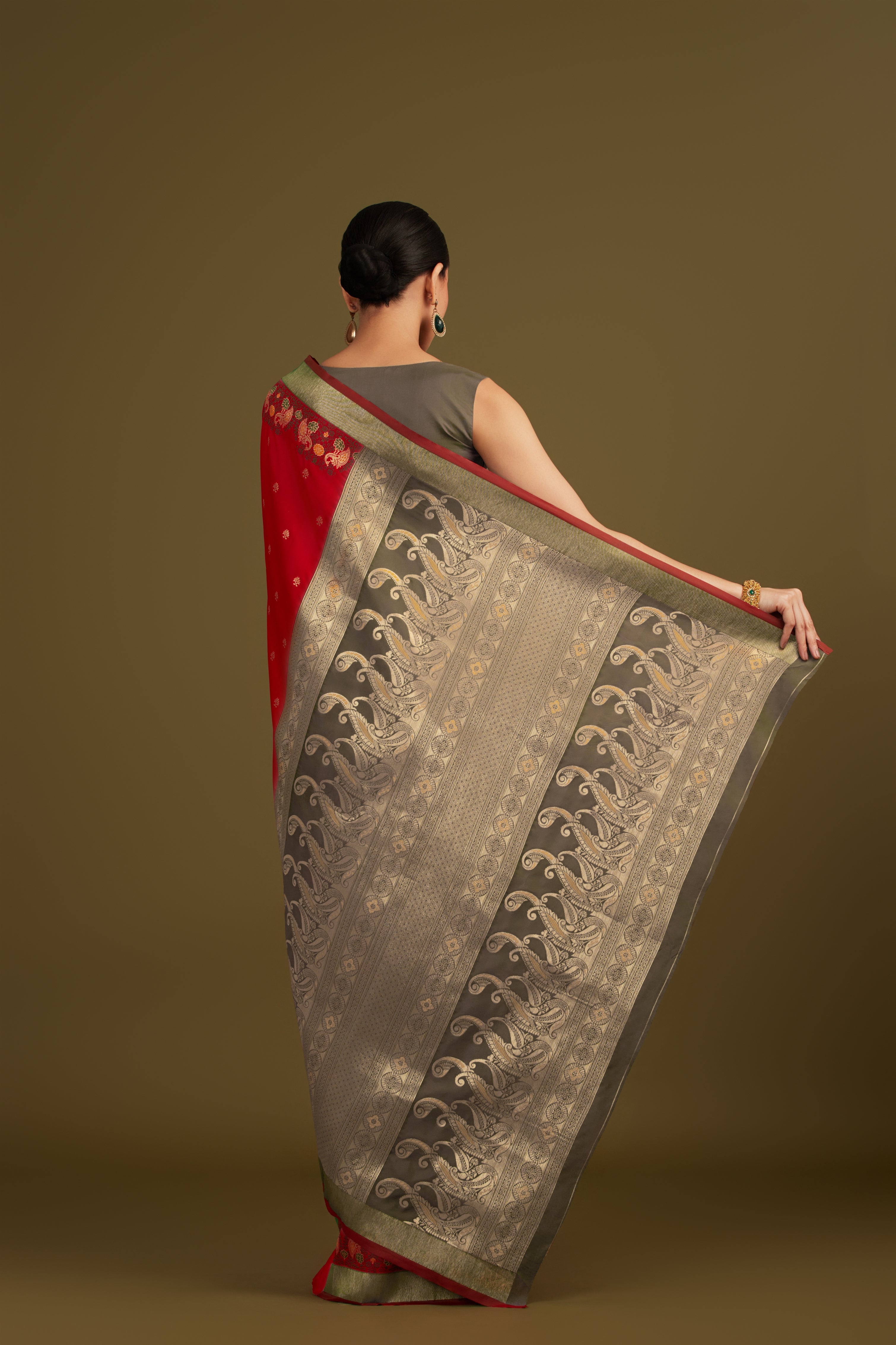 Red Banarasi Silk Blend Saree, Featuring A Graceful Paisley Pattern That Is Intricately Woven With Shimmering Zari. The Saree Is Enhanced By A Rich Contrast Pallu, Adding An Exquisite Touch Of Color And Contrast.