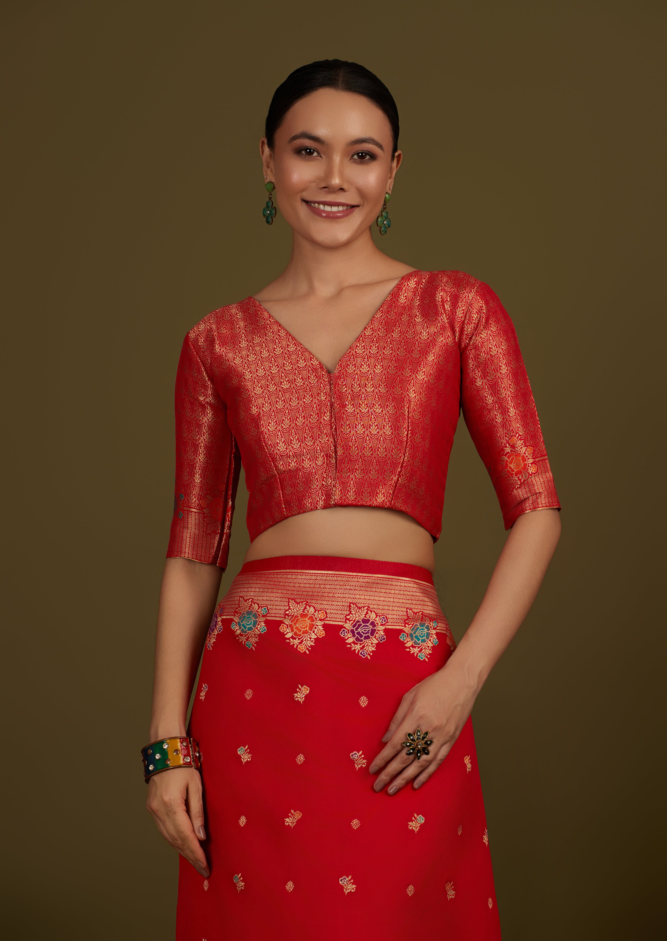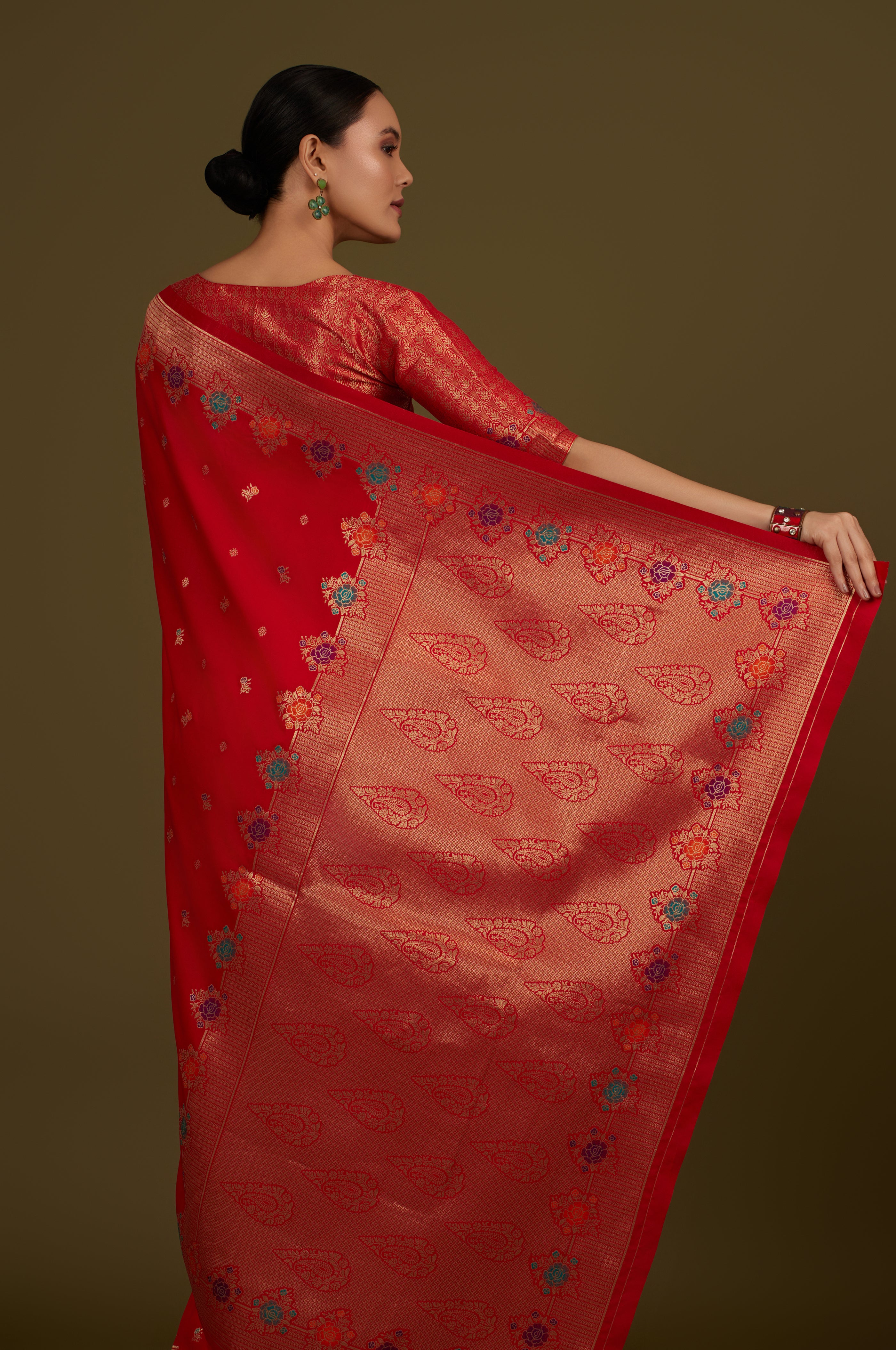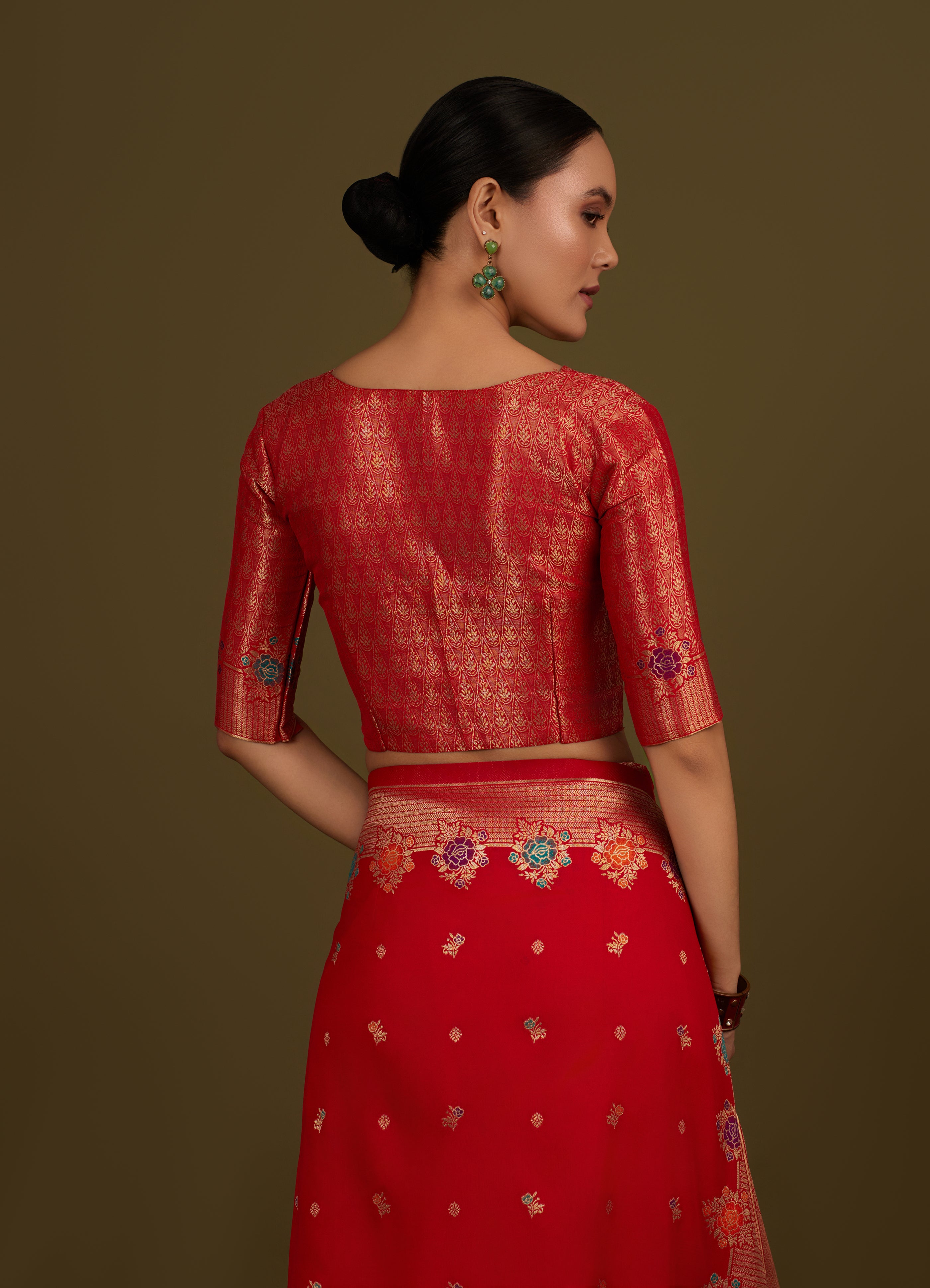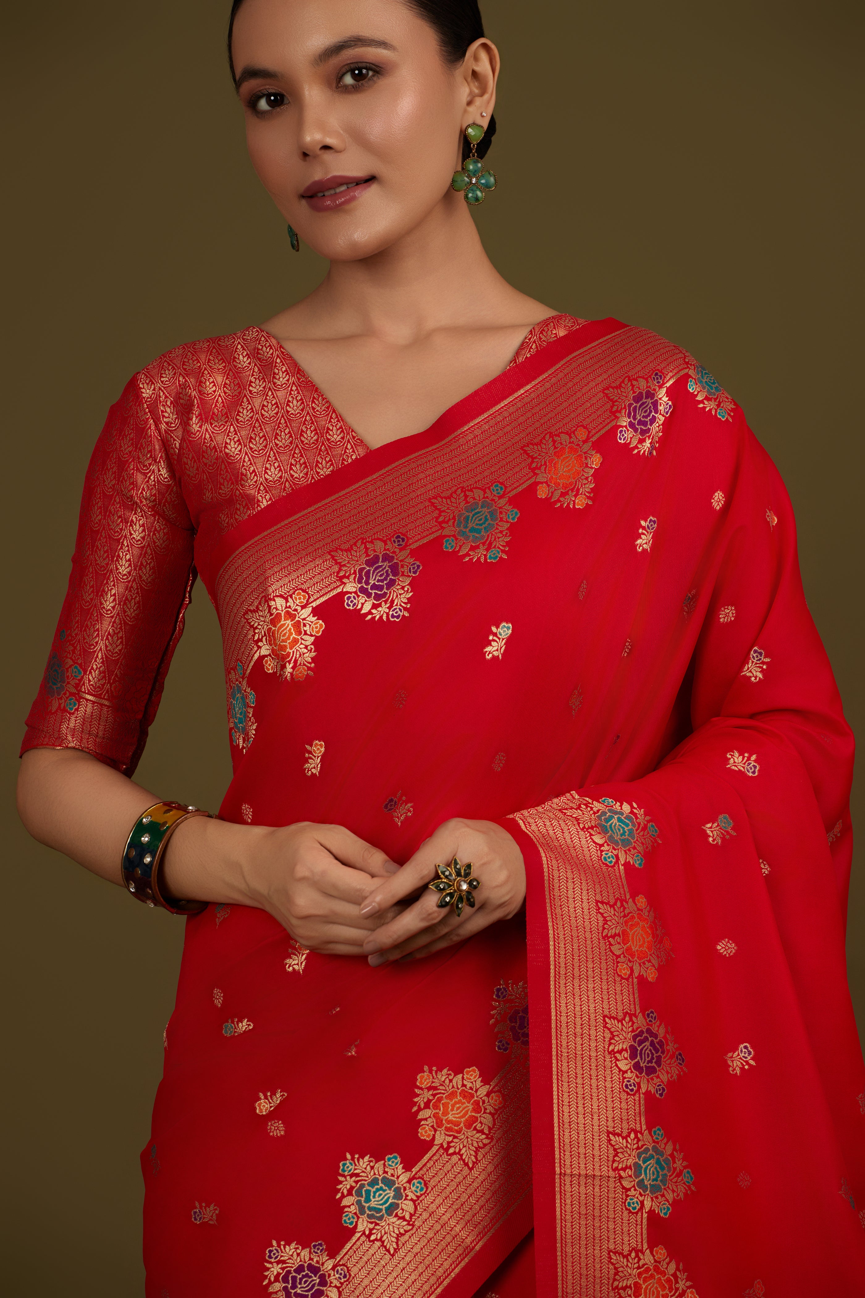 Be an angel and create and ascertain a smashing effect on anybody by carrying this Red Color silk contemporary saree. The fancy, weaving and zari work seems chic and fantastic for any occasion. Comes with matching blouse. (Slight variation in color, fabric & work is possible. Model images are only representative.)