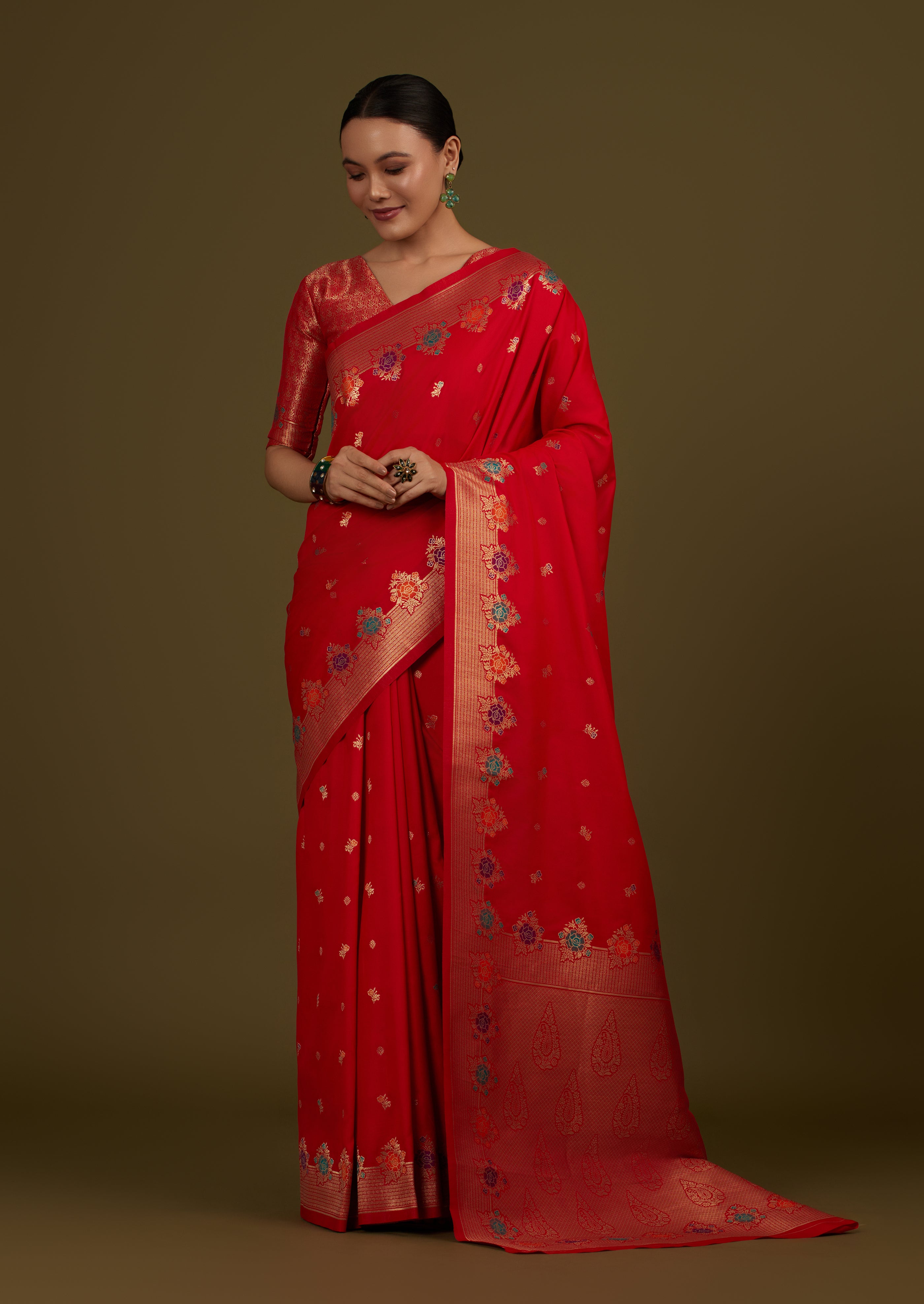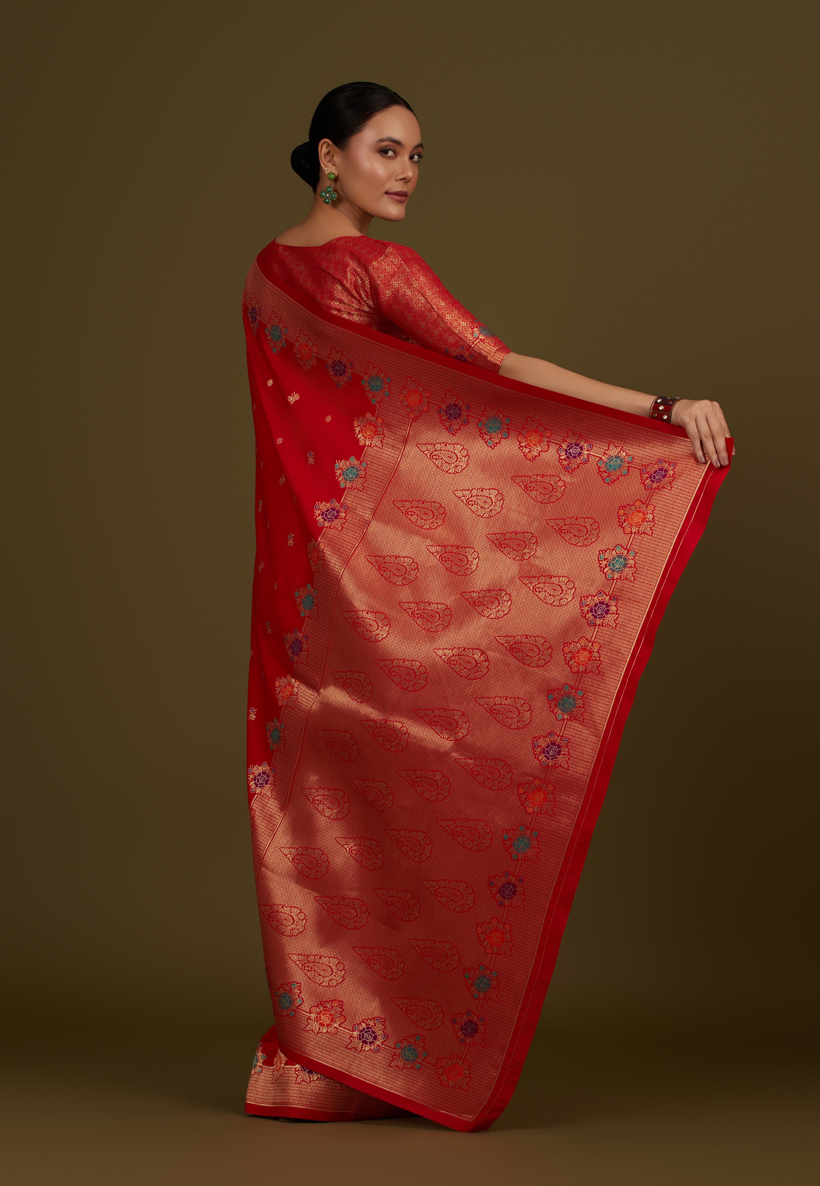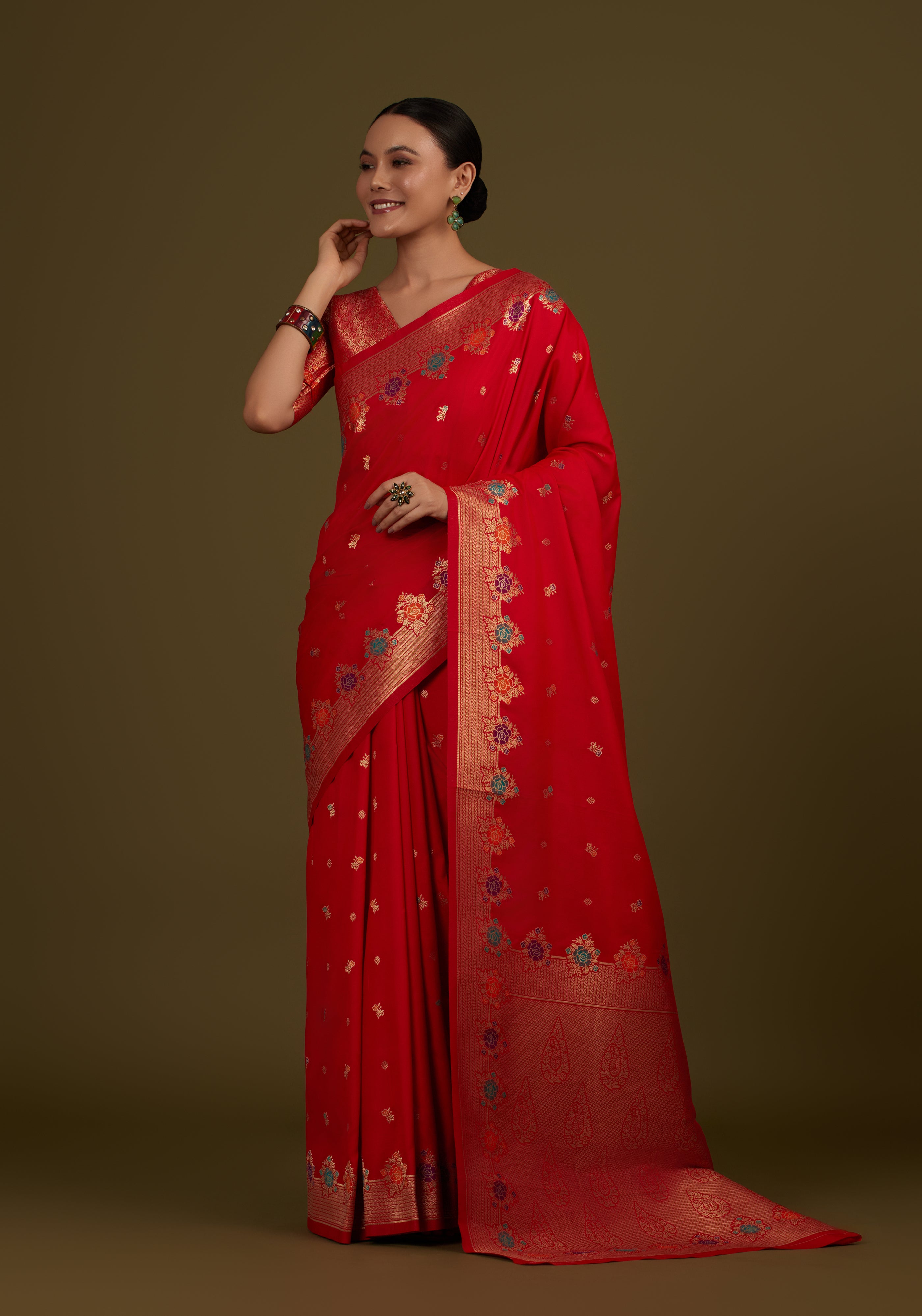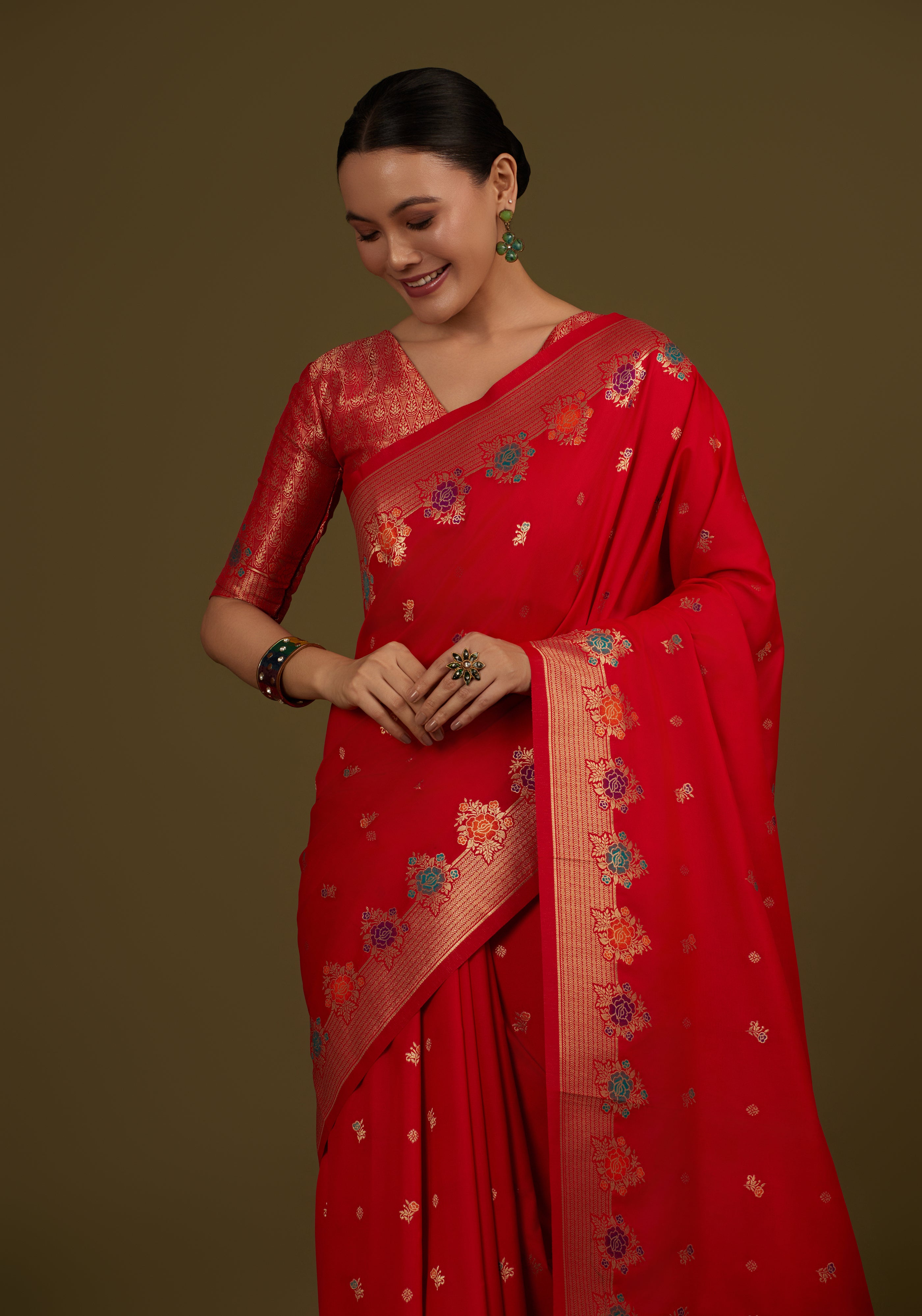 Be an angel and create and ascertain a smashing effect on anybody by carrying this Red Color silk contemporary saree. The fancy, weaving and zari work seems chic and fantastic for any occasion. Comes with matching blouse. (Slight variation in color, fabric & work is possible. Model images are only representative.)