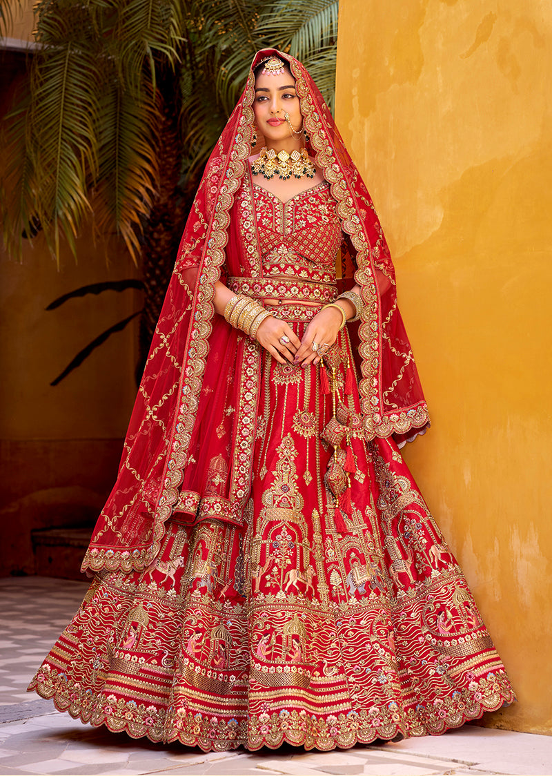 This stunning red silk lehenga is designed for brides and wedding guests who want to make a lasting impression. Crafted from silk, the lehenga and blouse feature intricate mirror handwork, dazzling Zarkan diamond detailing, and multi embroidery that adds elegance and richness to every detail. The vibrant red color symbolizes love and celebration, making it a timeless choice for traditional wedding occasions. Paired with a net double dupatta, this wedding wear ensemble brings together luxury and tradition in perfect harmony.There might be slight color variation due to lightings & flash while photo shoot.