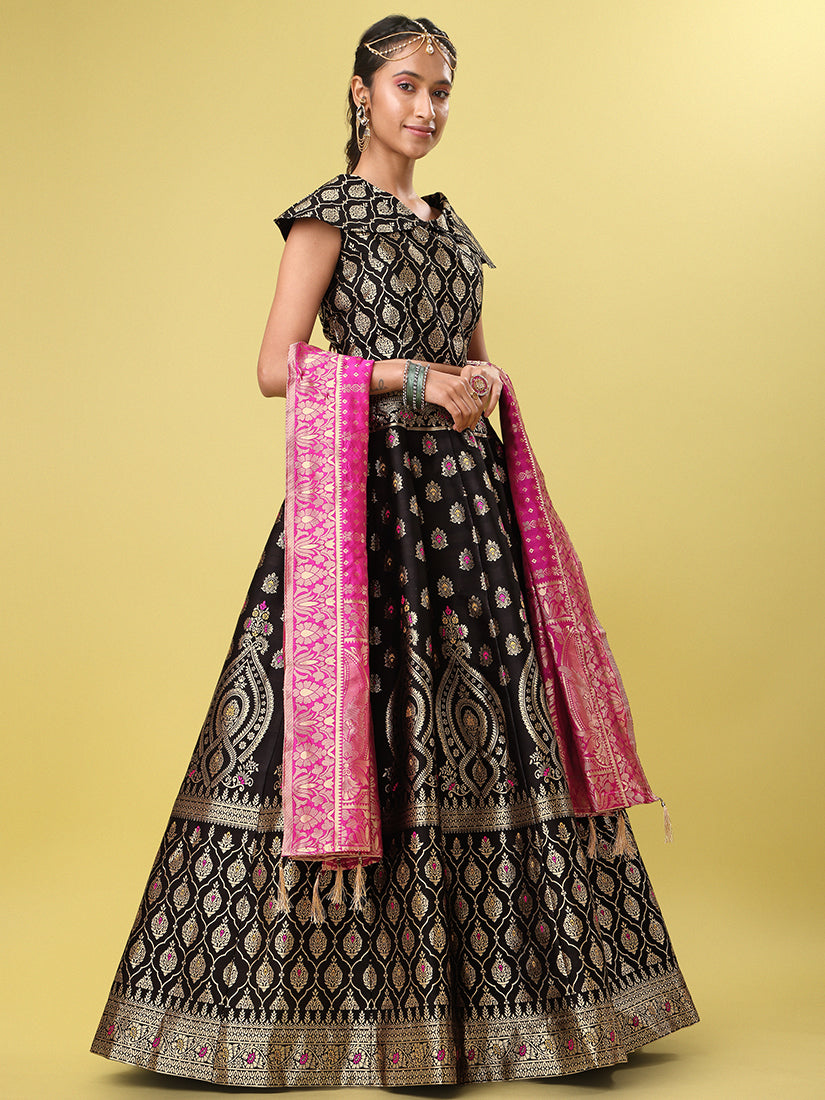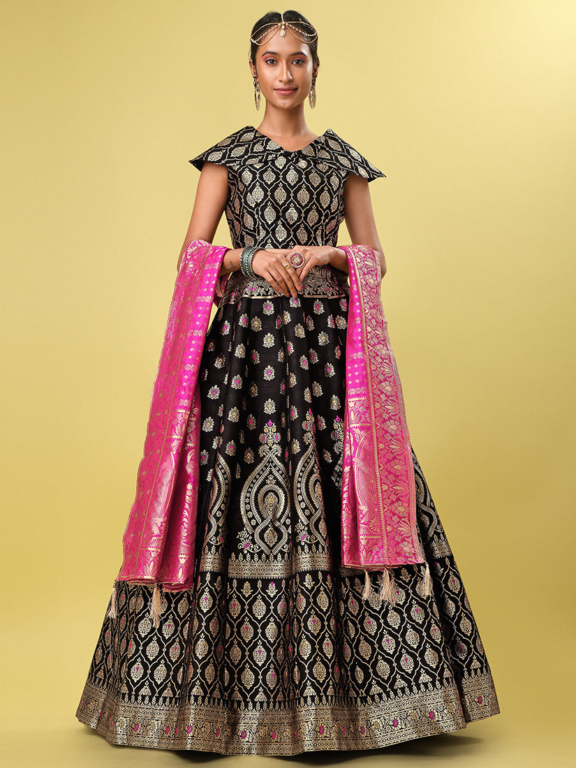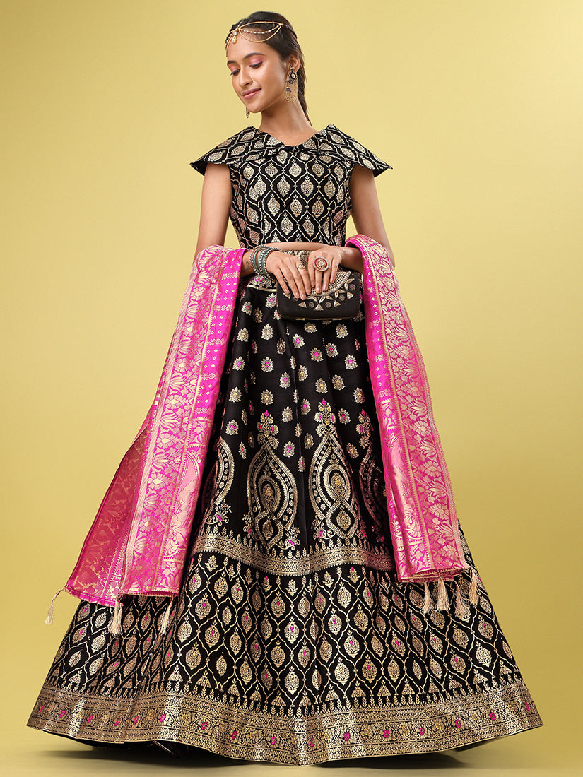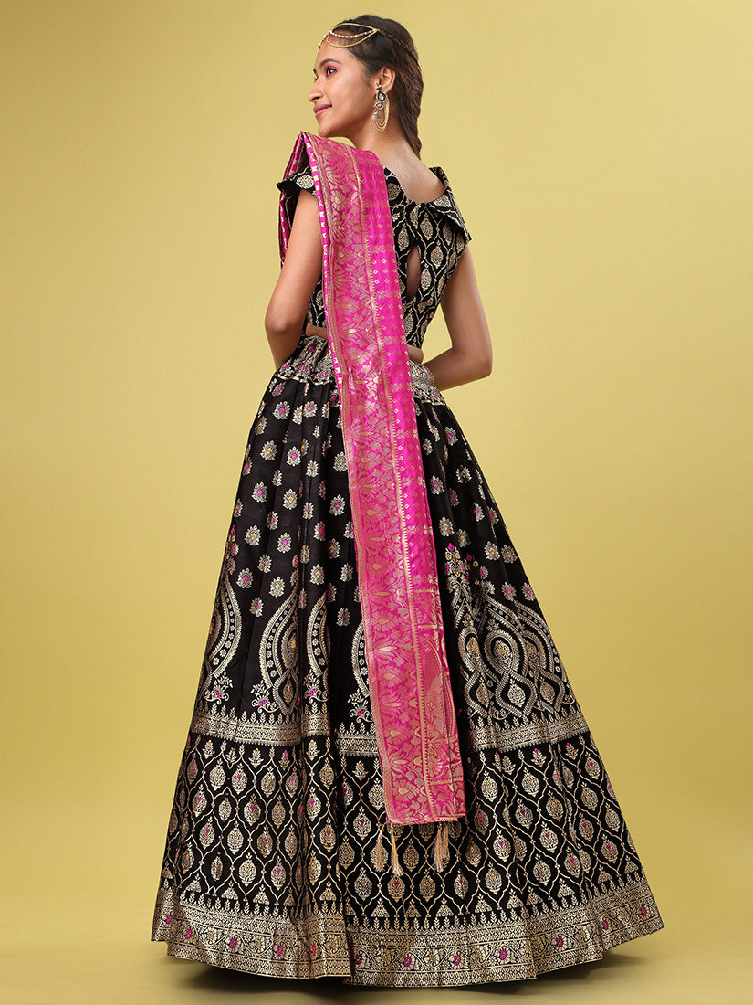 Grab The Second Look In This Elegant Attire For This Season. This Black Colour Jacquard Fabric Trendy Lehenga Choli Is Accenting The Gorgeous Feeling. The Ethnic Baanrasi Jacqaurd And Woven Work On The Attire Adds A Sign Of Beauty Statement To Your Look. Comes With Matching Jacquard Choli And Rani Pink Banarasi Dupatta. (Slight Variation In Color, Fabric & Work Is Possible. Model Images Are Only Representative.)The Stitched Lehenga Choli Bust Size Can Be Customized From 34 To 42 Inches.