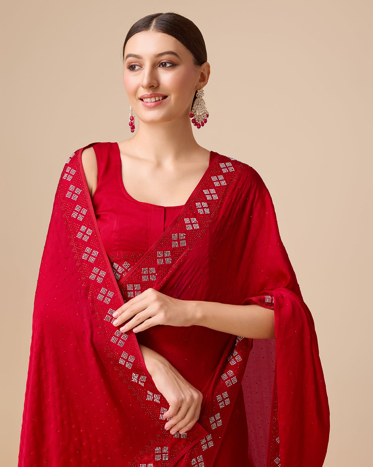 Ameliorate your wardrobe with this gorgeous Monjolika fashion's Red colour satin silk saree. This swarovski diamond work saree gives you a rich and sheen look. Just drape it and you are ready to attend casual as well as occational functions and events. The fabric has a smooth and shiny surface with a soft, slippery feel. This satin weave gives the saree a lustrous appearance that reflects light beautifully.