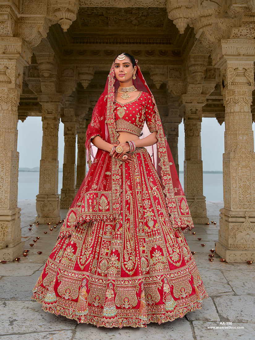 Monjolika Fashion Presents An superb red silk bridal trendy lehenga choli will make you look quite stylish and graceful. The ethnic embroidered, khatli work, sequins, thread and zari work with a apparel adds a sign of magnificence statement for your look. Comes with matching choli and dupatta. (Slight variation in color, fabric & work is possible. Model images are only representative.)