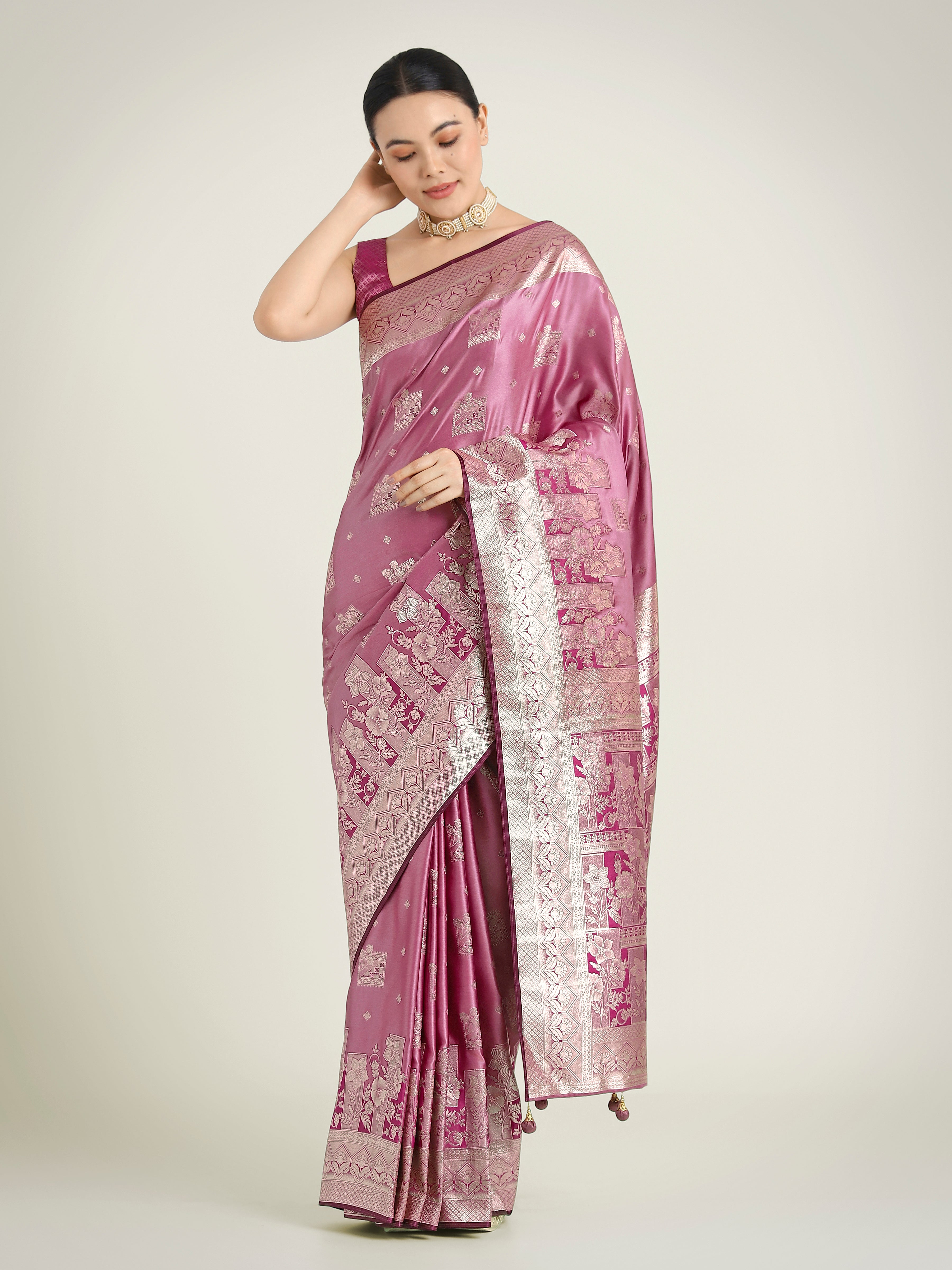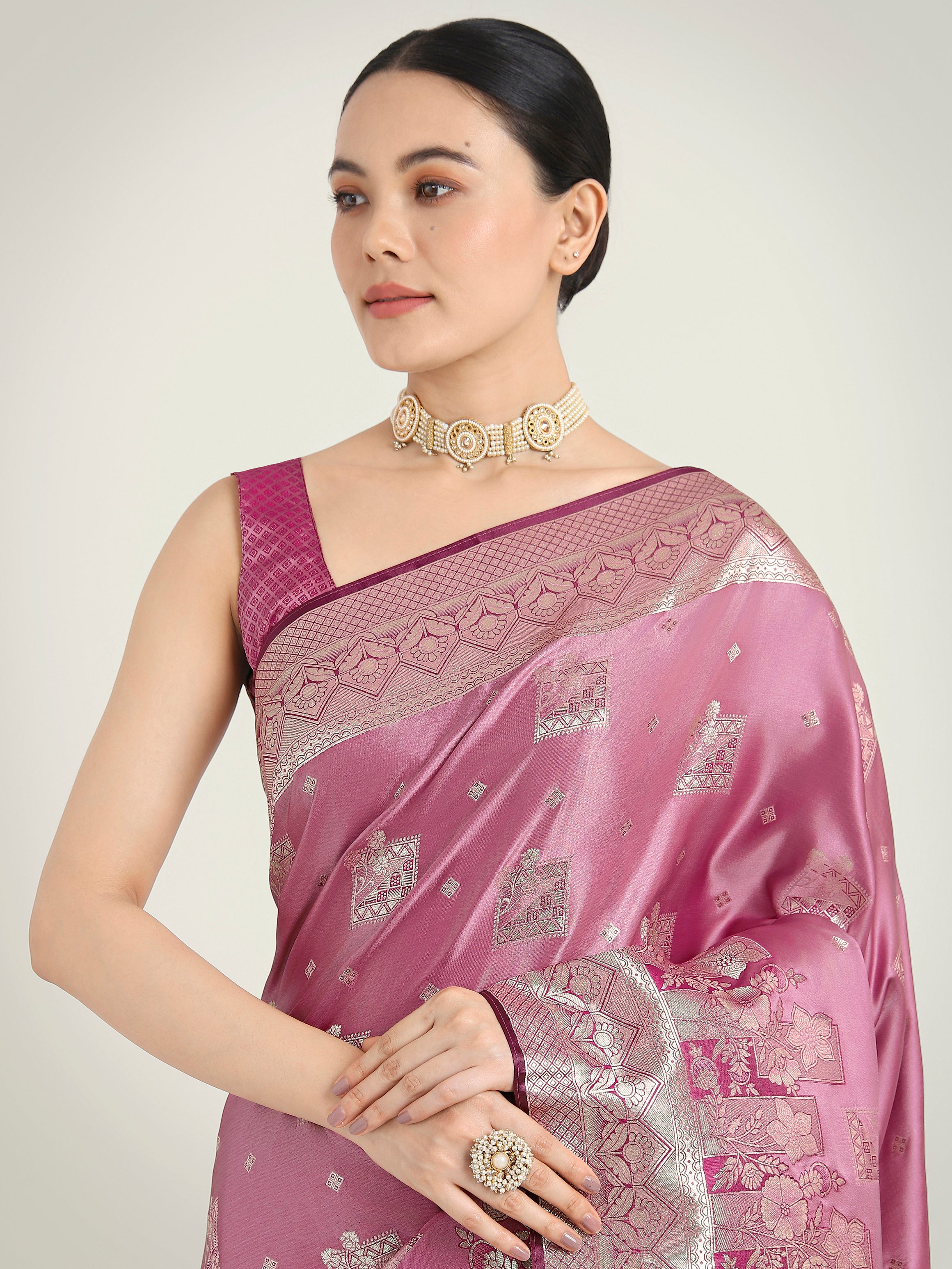 We have ensemble a symphony of enchanting piece to restyle your senses. Real beauty comes out from your dressing style with this Rose Pink Banarasi satin silk traditional saree. This attire is showing some really mesmerizing and innovative patterns with weaving work. Comes with matching blouse. (Slight variation in color, fabric & work is possible. Model images are only representative.)