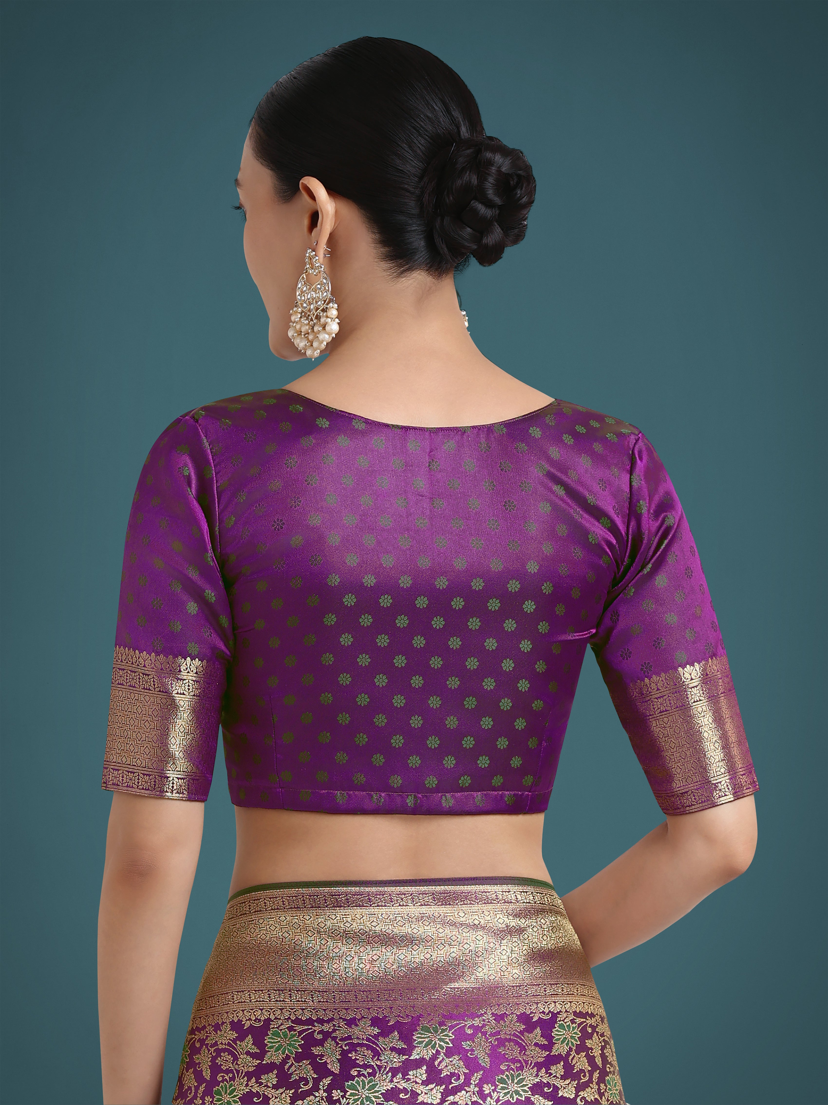 Be an angel and create and ascertain a smashing impact on everybody by wearing this Purple banarasi silk traditional saree. The stunning border,, fancy, and zari work all through the attire is awe inspiring. Comes with matching blouse. (Slight variation in color, fabric & work is possible. Model images are only representative.)
