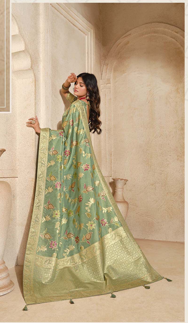Famous designers tend to give reign to their imagination and create clothes that look interesting and guided by the desire to attract attention. Add a small burst of shade for any wardrobe with this Sea Green color silk and tissue classic saree. The enticing weaving and zari work a significant element of this attire. Comes with matching blouse.