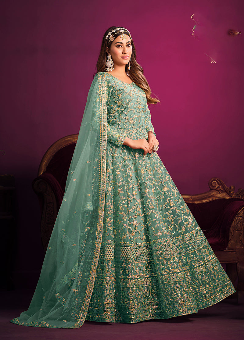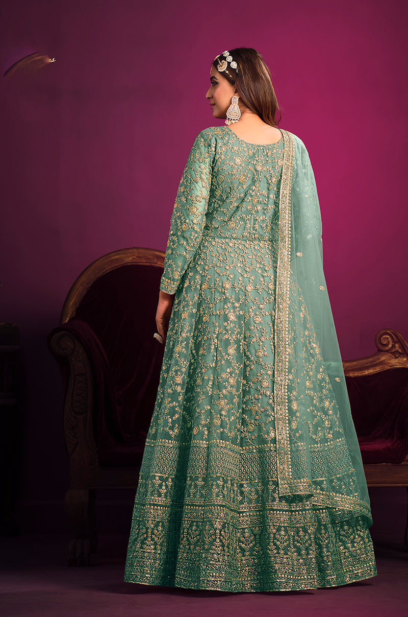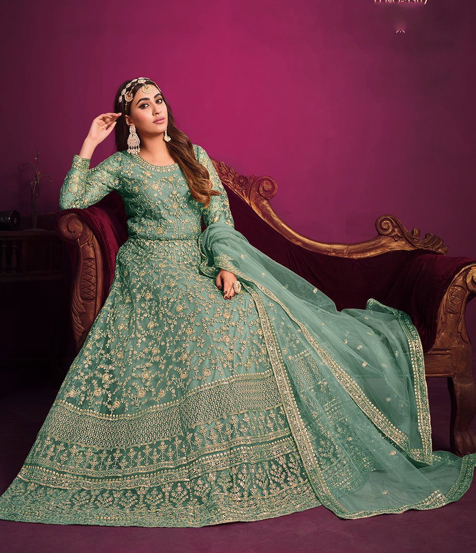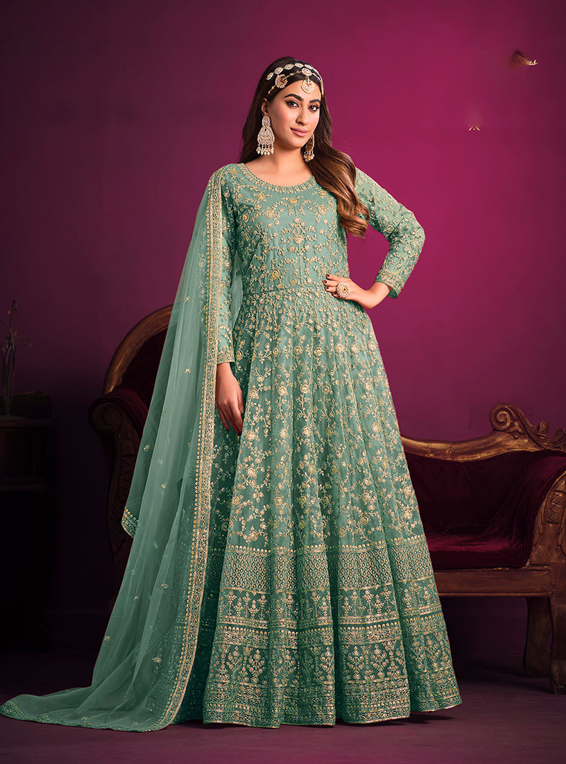 Monjolika Fashion Presents Create a smoldering impact by this Light blue Color Net Anarkali Suit. This attire is engrafted with embroidered work. Comes with matching Santoon bottom and Net dupatta.