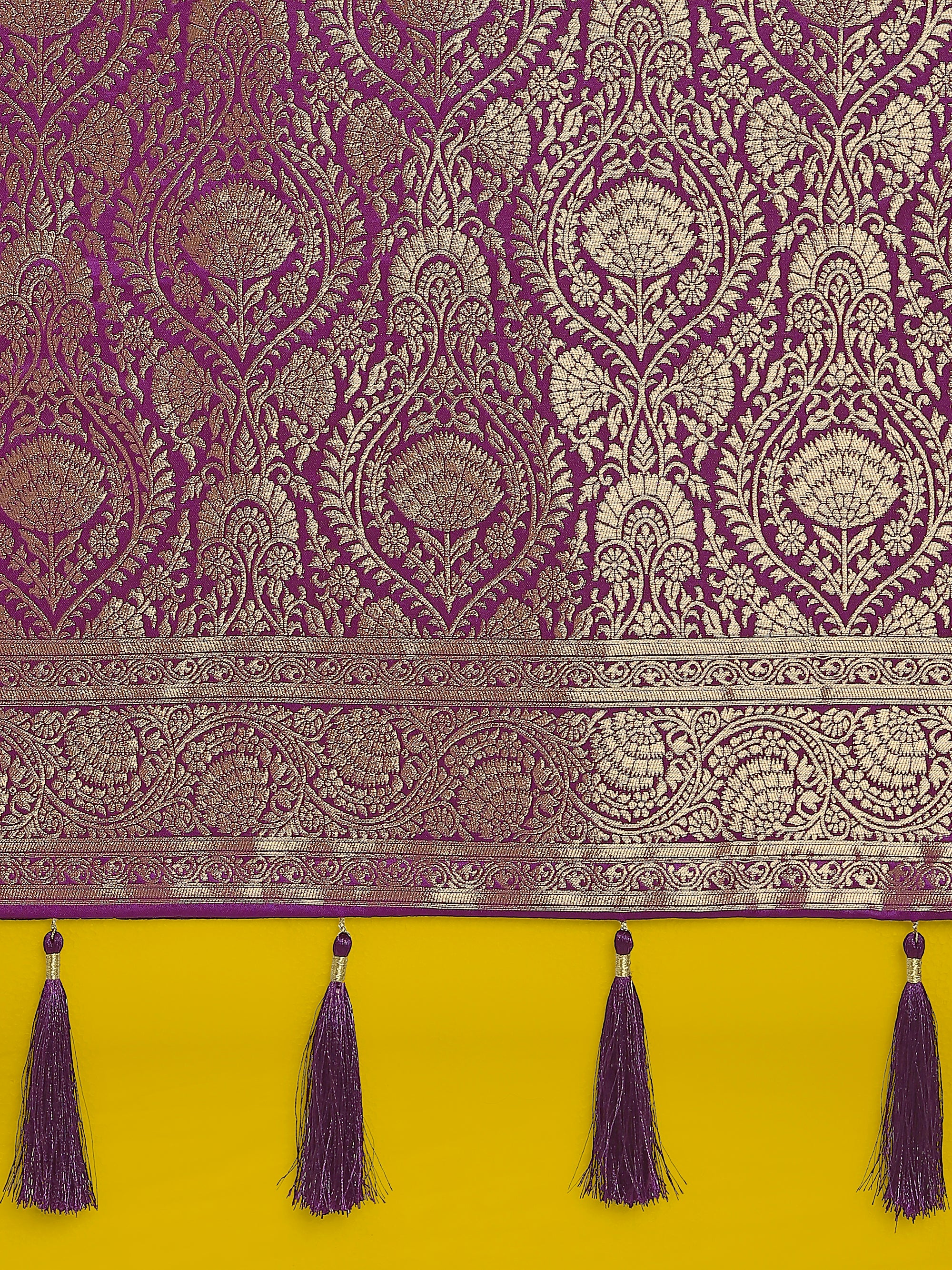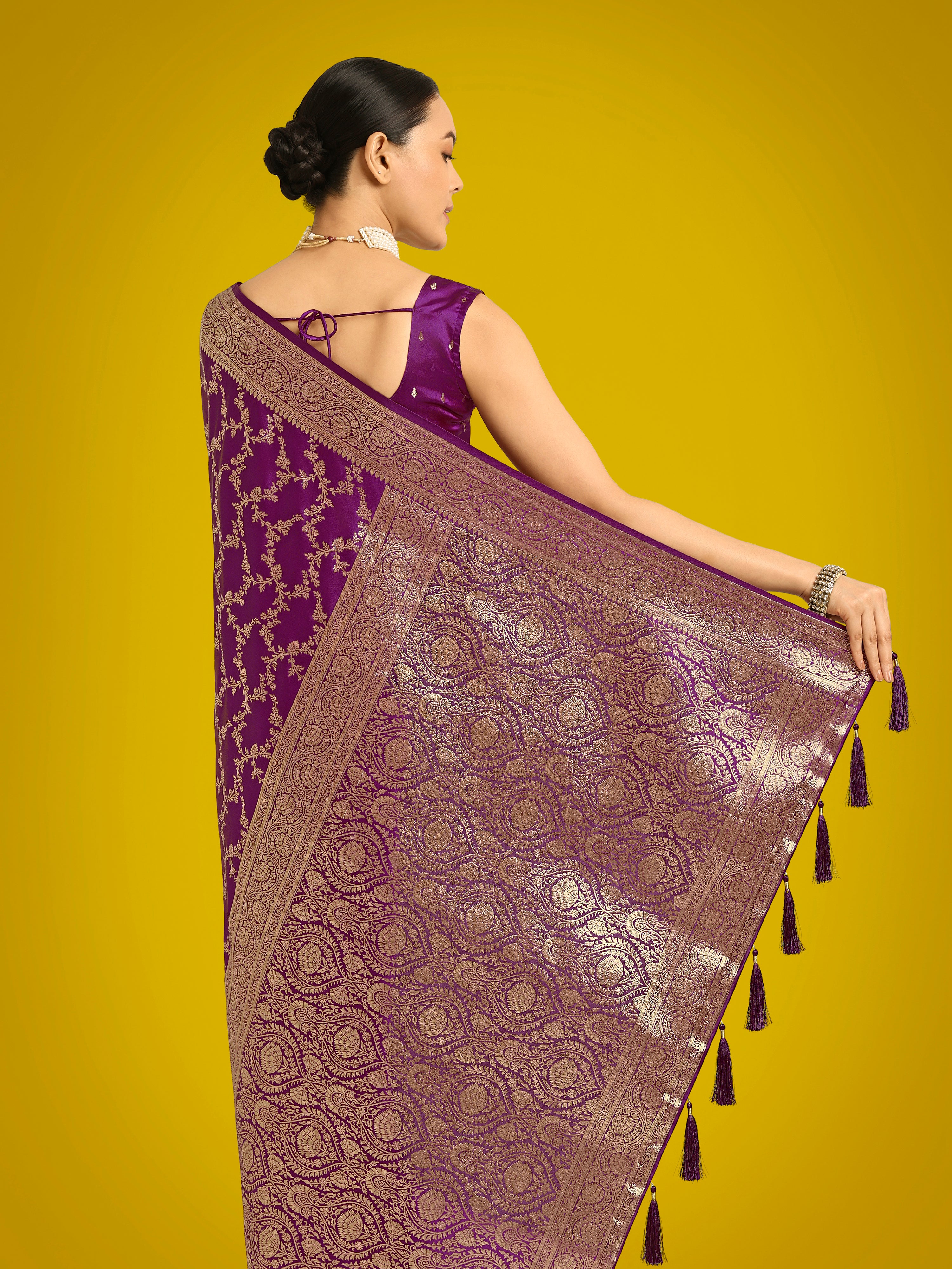 Be an angel and create and ascertain a smashing impact on everybody by wearing this Purple banarasi satin silk traditional saree. The stunning Meenakari Work & Zaal Pattern, and zari work all through the attire is awe inspiring. Comes with matching blouse. (Slight variation in color, fabric & work is possible. Model images are only representative.)