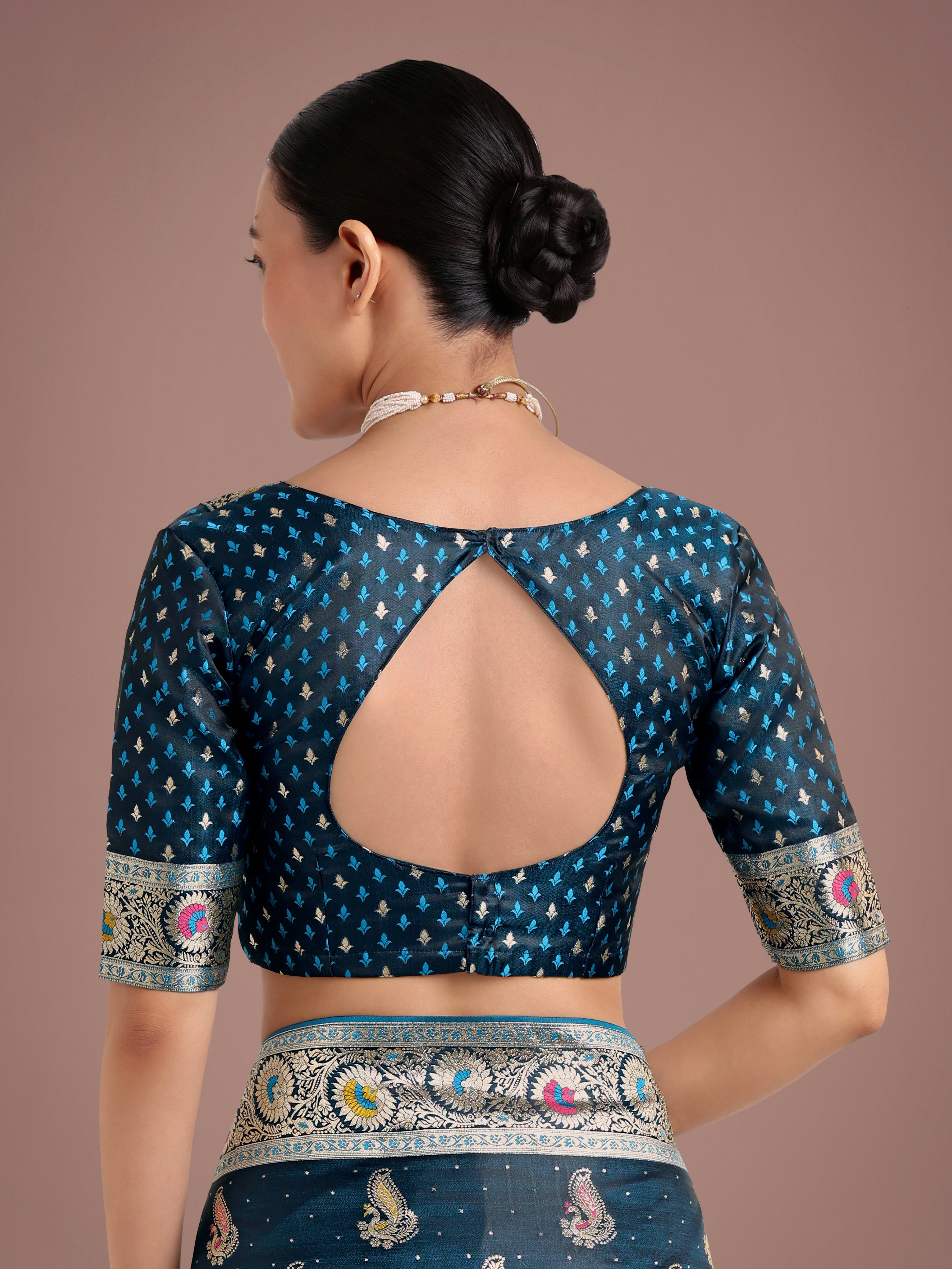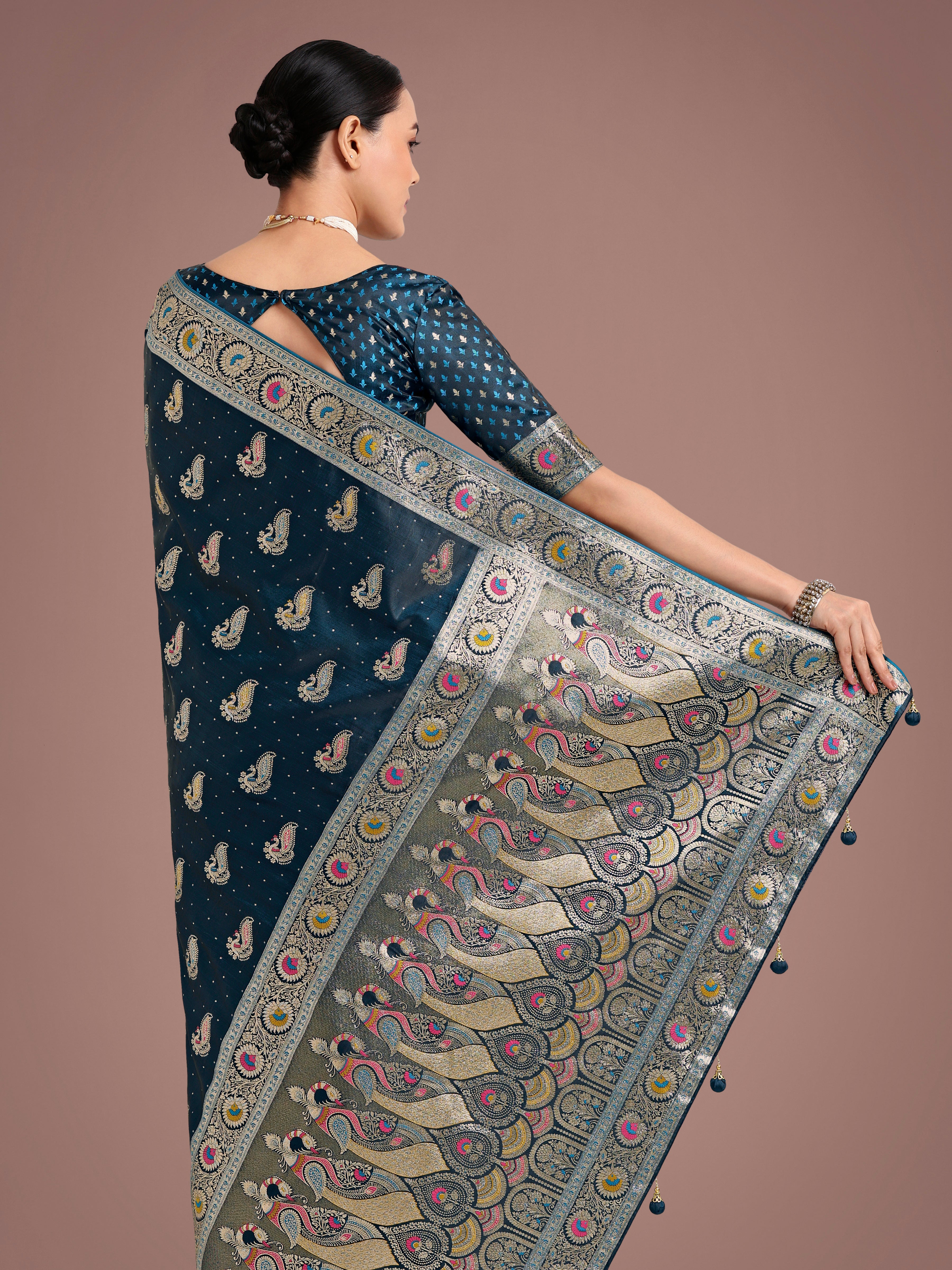 This brilliant array will make you the ultimate classic beauty at the next event you attend. We unfurl our the intricacy and exclusivity of our creations highlighted in this style of a appealing Teal banarasi satin silk and modal traditional saree. The amazing dress creates a dramatic canvas with wonderful Zari weaving work. Comes with matching blouse. (Slight variation in color, fabric & work is possible. Model images are only representative.)
