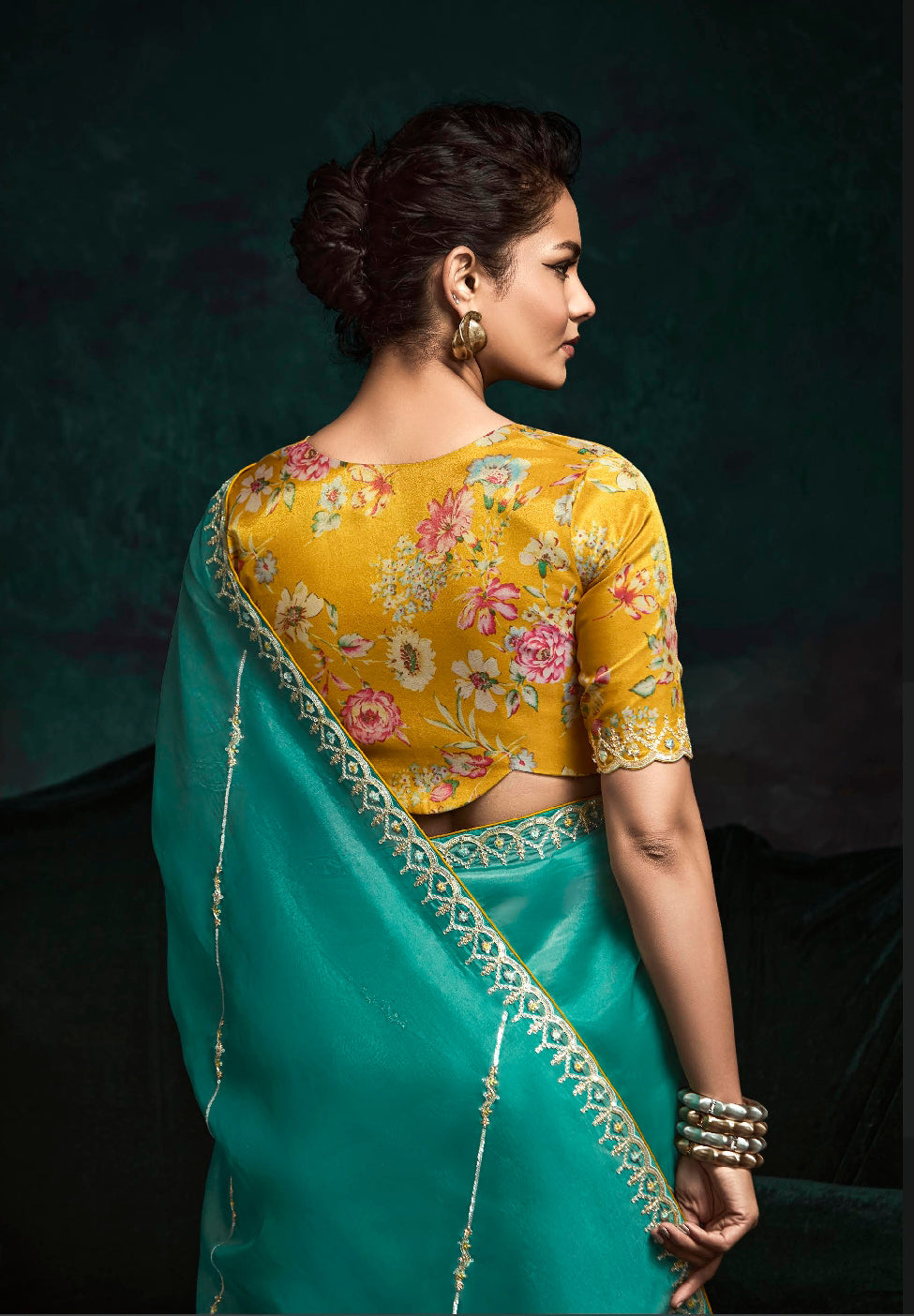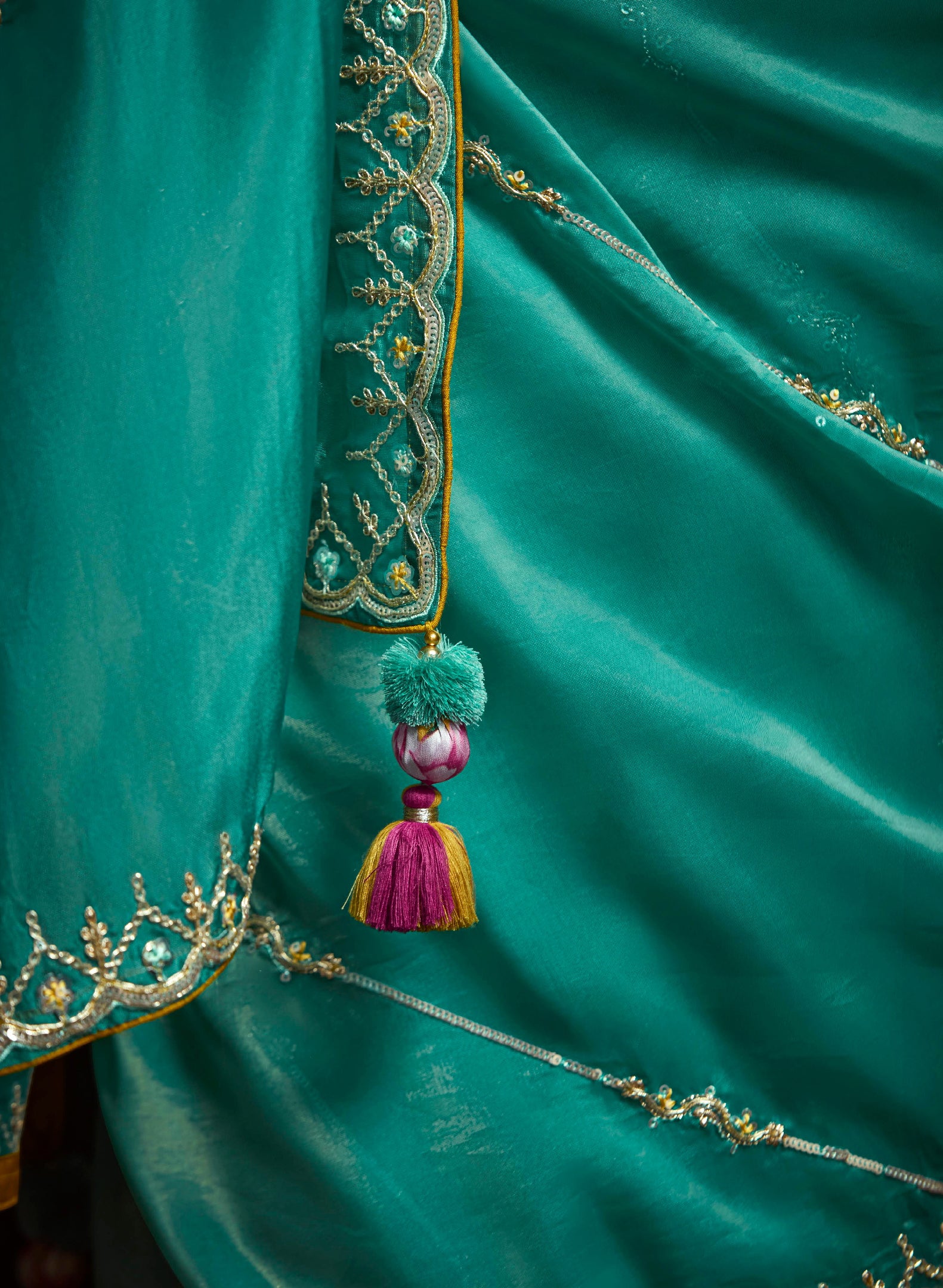 Exquisite and elegant, this teal Zari Woven Embroidery Designer Crush Tissue Silk Saree showcases intricate craftsmanship with its delicate embroidery work. The luxurious blend of tissue silk fabric adds a graceful sheen, making it a perfect choice for festive occasions and celebrations. Drape yourself in this timeless piece for a regal and sophisticated look.