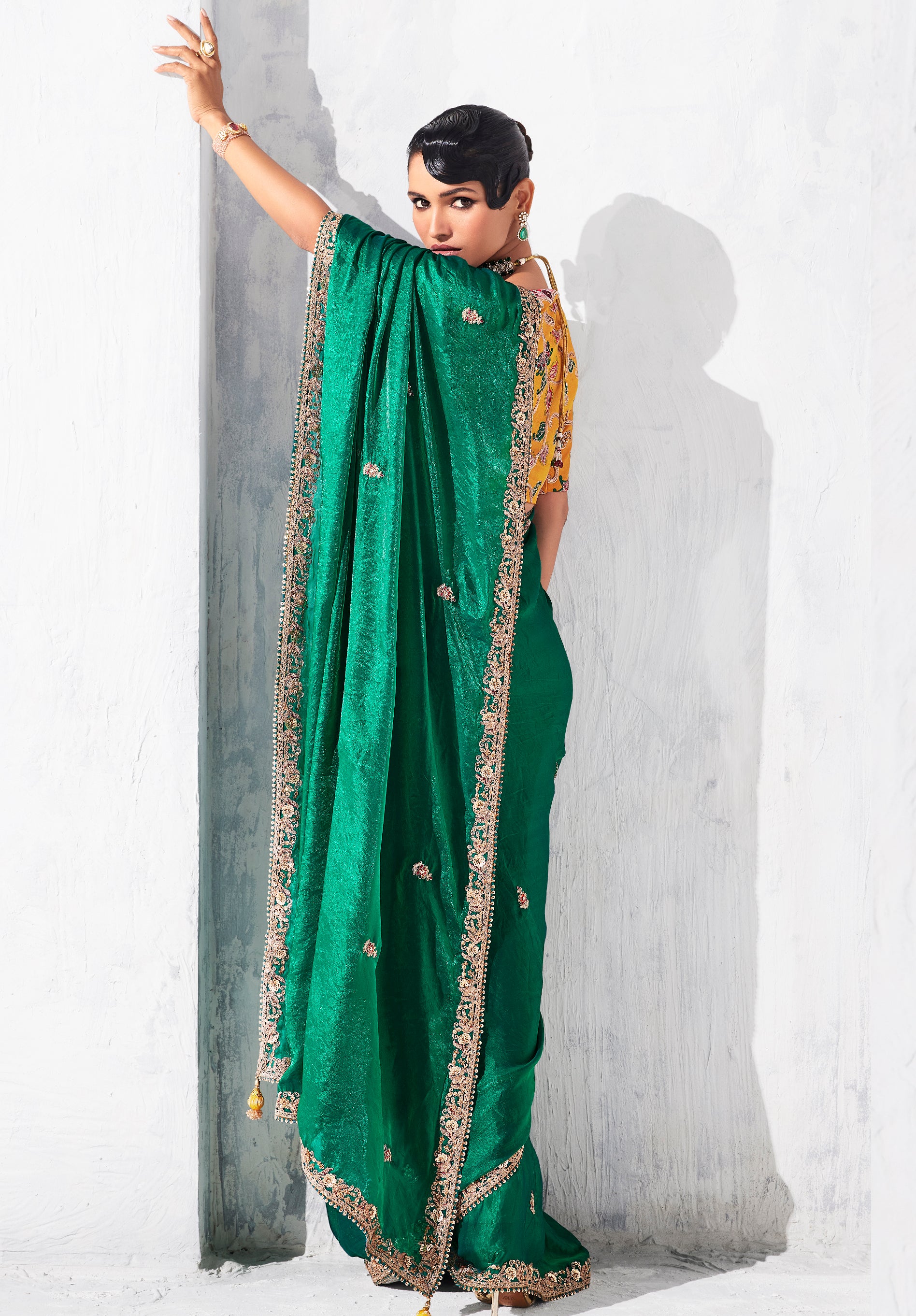 Elevate your ethnic style with this Designer teal Fancy Tissue Saree Blouse Party Wear. Crafted from fancy fabric, this saree exudes a luxurious shine and smooth texture, making it the perfect choice for weddings, parties, receptions, and festive occasions. The saree is adorned with delicate golden motifs and a finely detailed embroidered border, adding a regal touch to your traditional look. Paired with a stunning blouse embellished with floral threadwork and sequin accents, this ensemble ensures you stand out with elegance and grace. Whether you’re attending a wedding ceremony, festive gathering, or special celebration.
