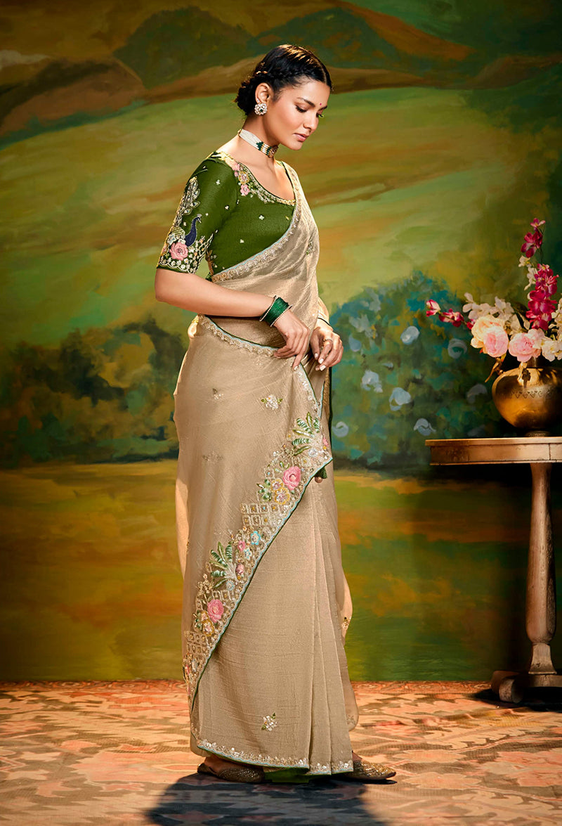 Exquisite and elegant, this Bronze Yellow Zari Embroidery Designer Crush Tissue Silk Saree showcases intricate craftsmanship with its delicate embroidery & sequins work. The luxurious blend of tissue silk fabric adds a graceful sheen, making it a perfect choice for festive occasions and celebrations. Drape yourself in this timeless piece for a regal and sophisticated look.