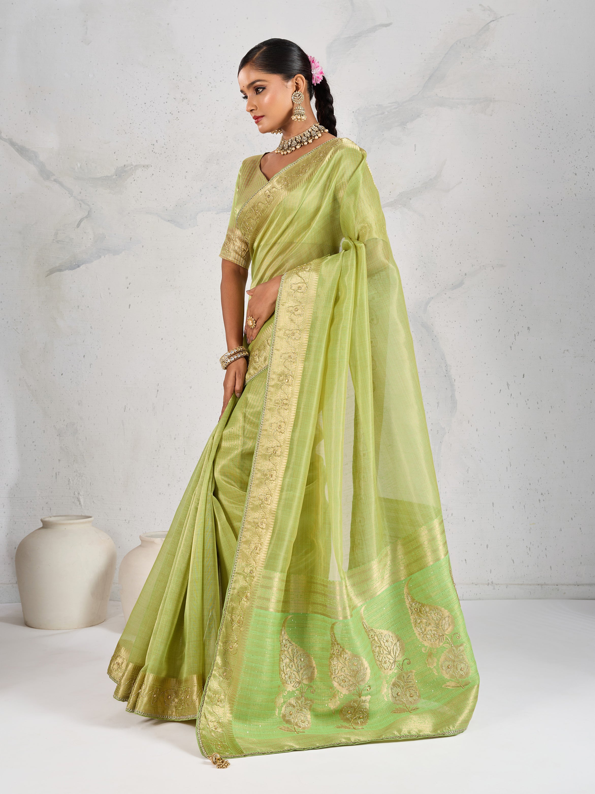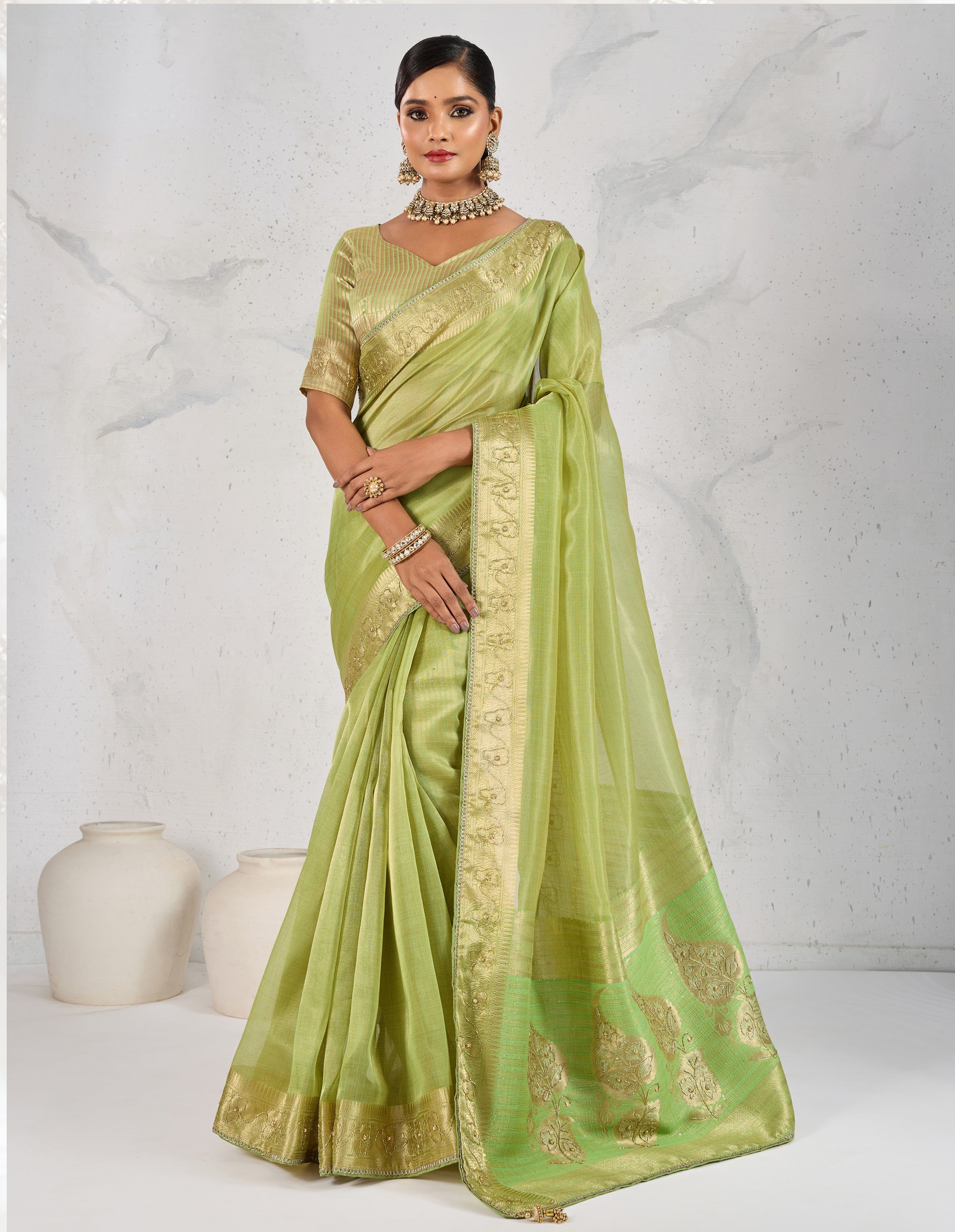 Real splendor will come out from your dressing style with this Parrot Green Tissue linen contemporary saree. Beautified with lace border, and hand work all synchronized well with the design and design of the attire. Comes with matching blouse. (Slight variation in color, fabric & work is possible. Model images are only representative.)