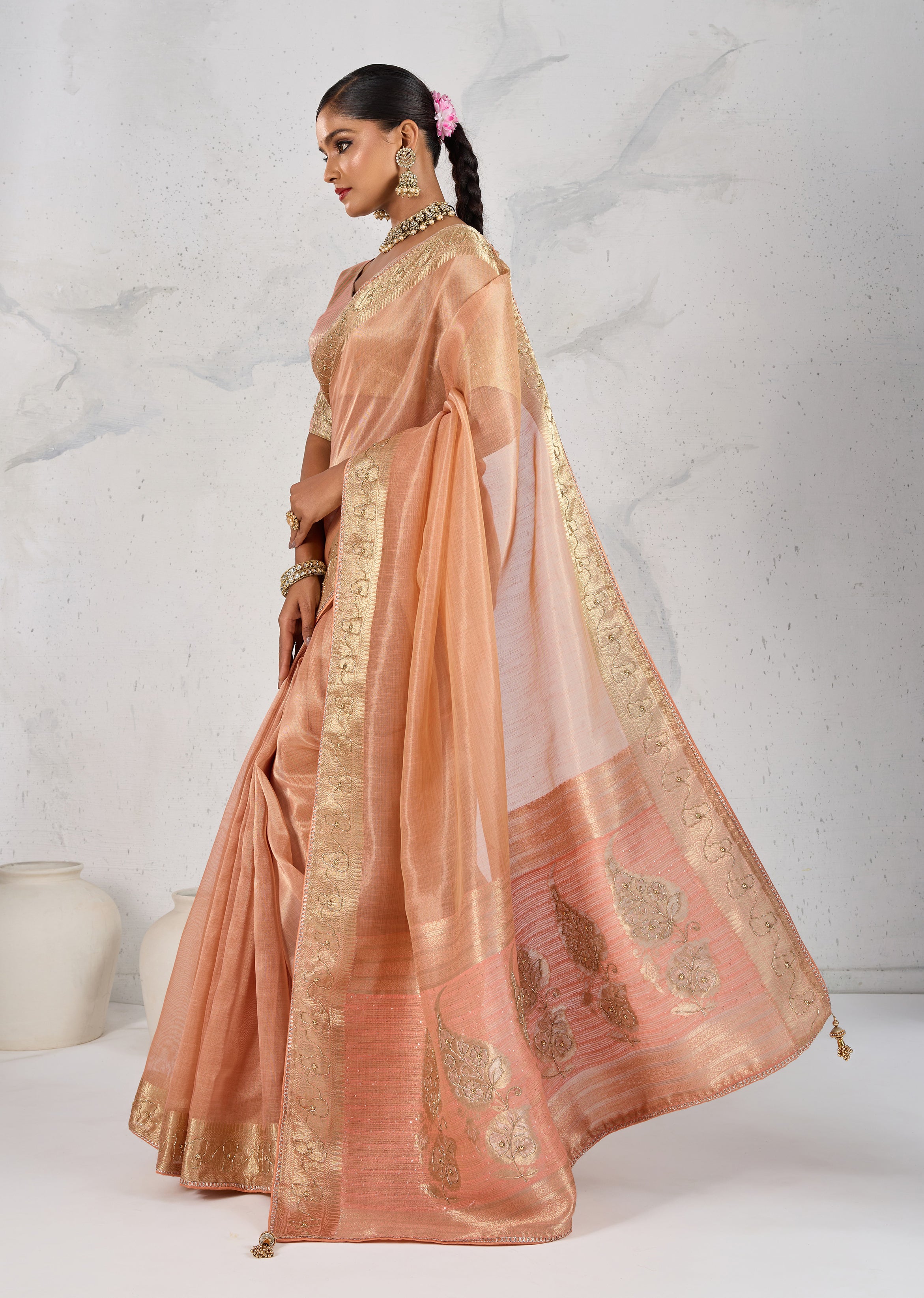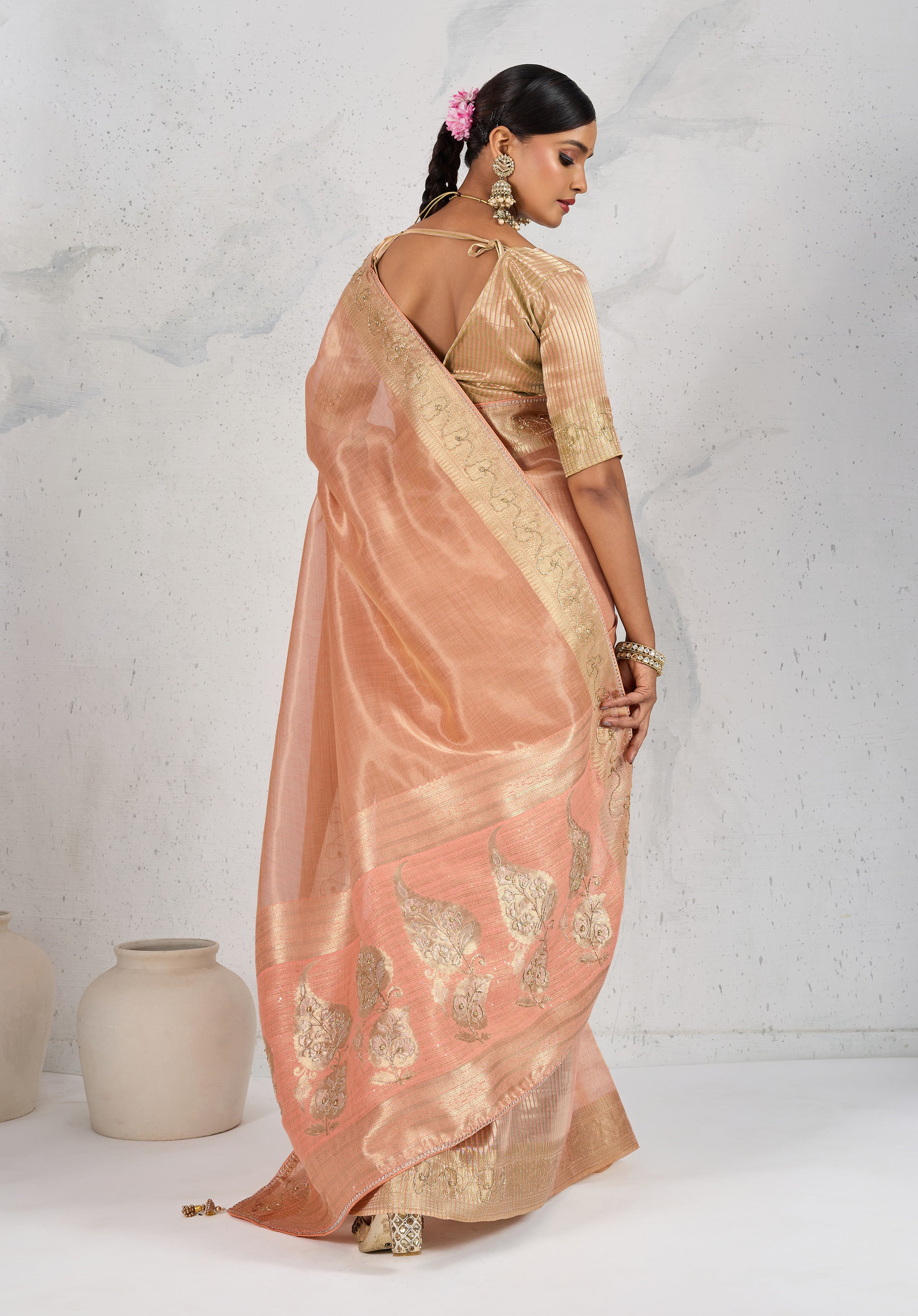 Real splendor will come out from your dressing style with this Peach Tissue linen contemporary saree. Beautified with lace border, and hand work all synchronized well with the design and design of the attire. Comes with matching blouse. (Slight variation in color, fabric & work is possible. Model images are only representative.)