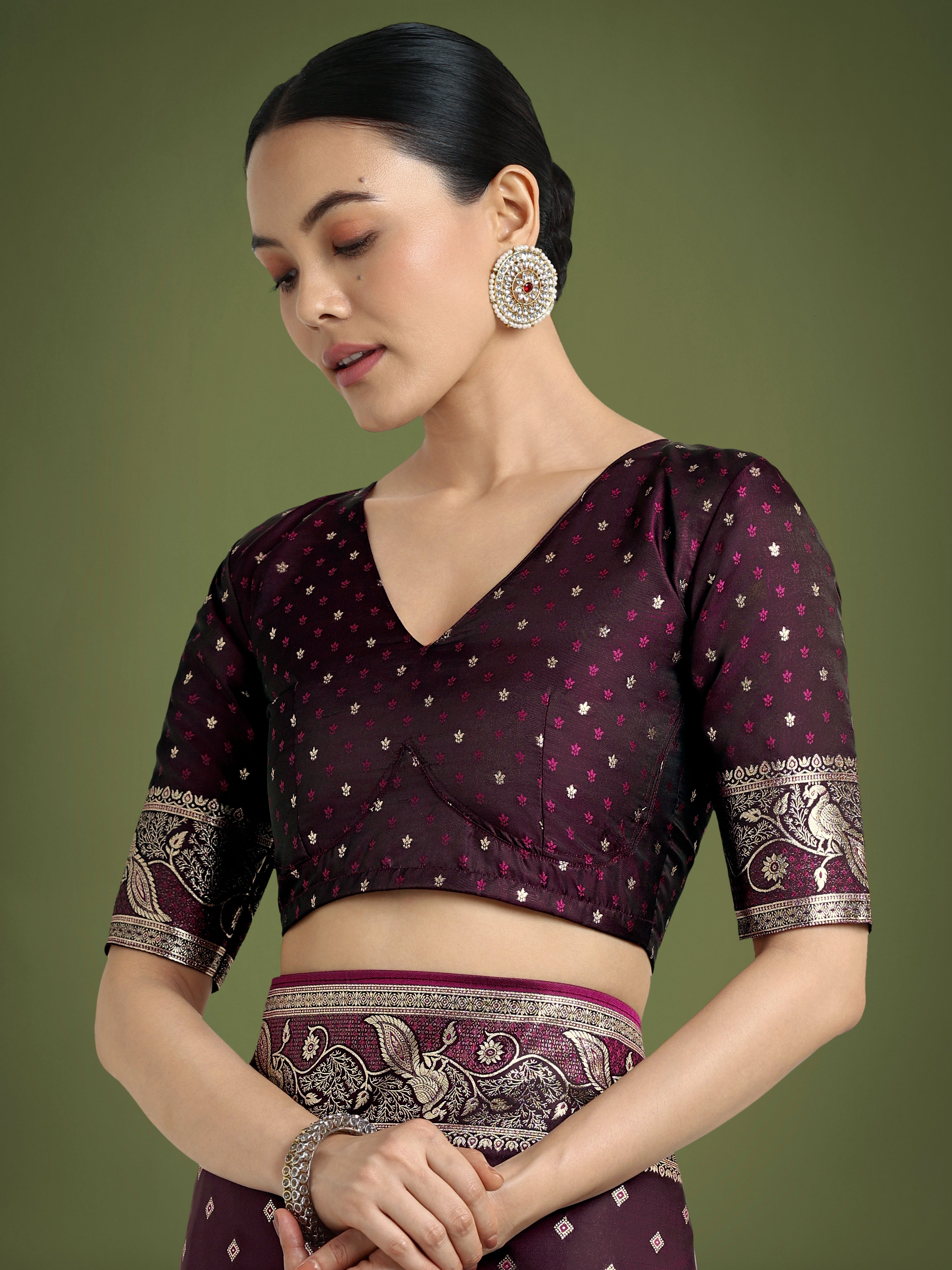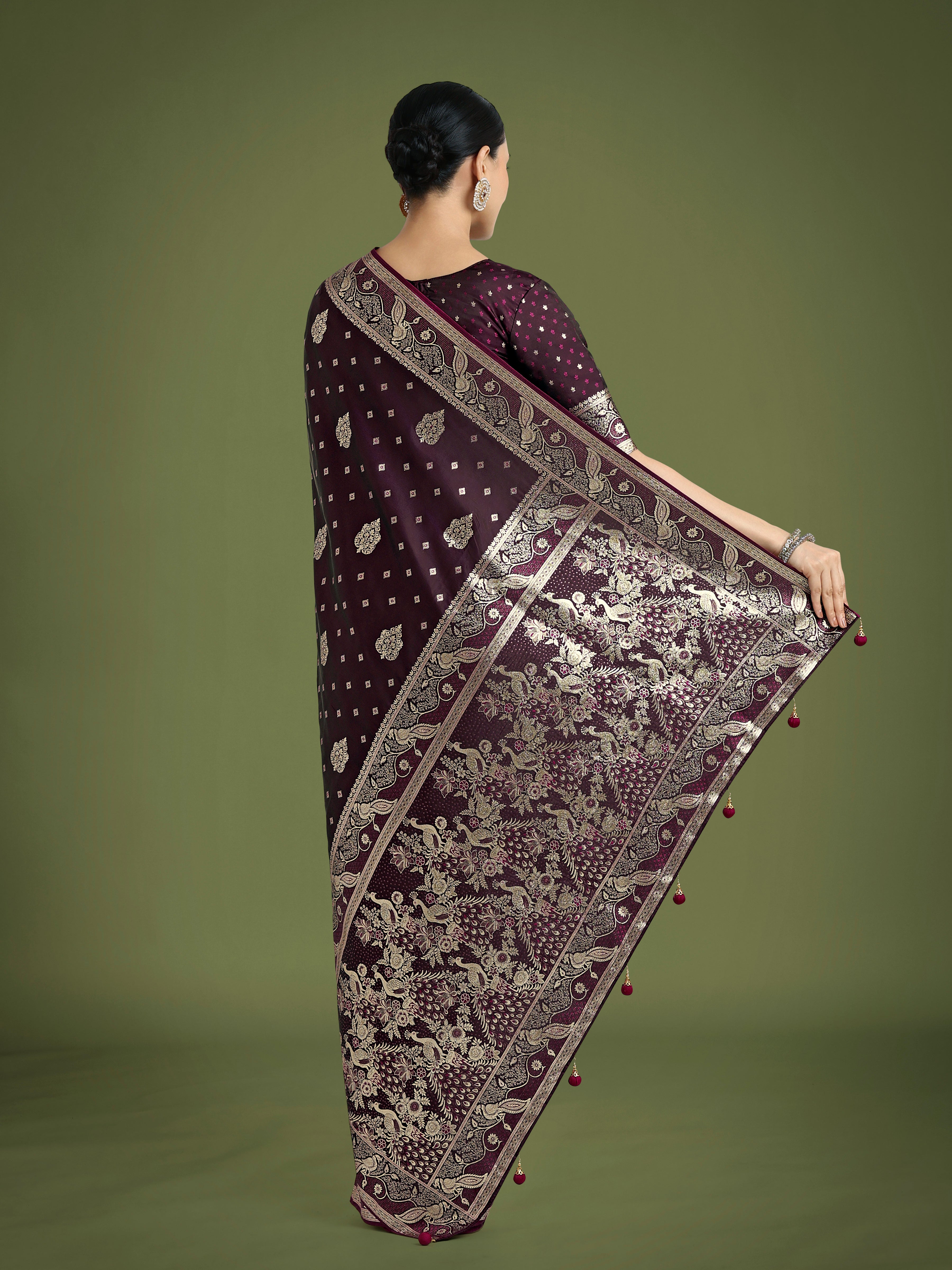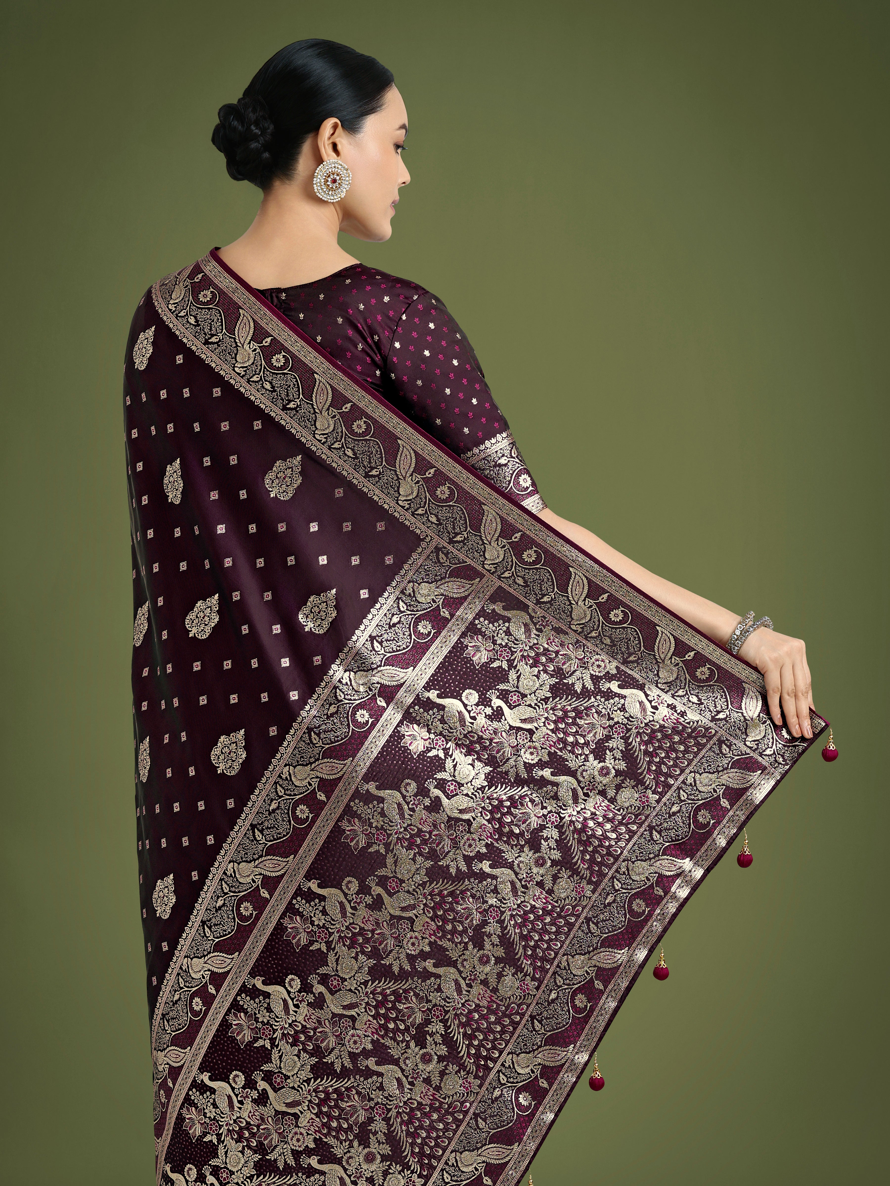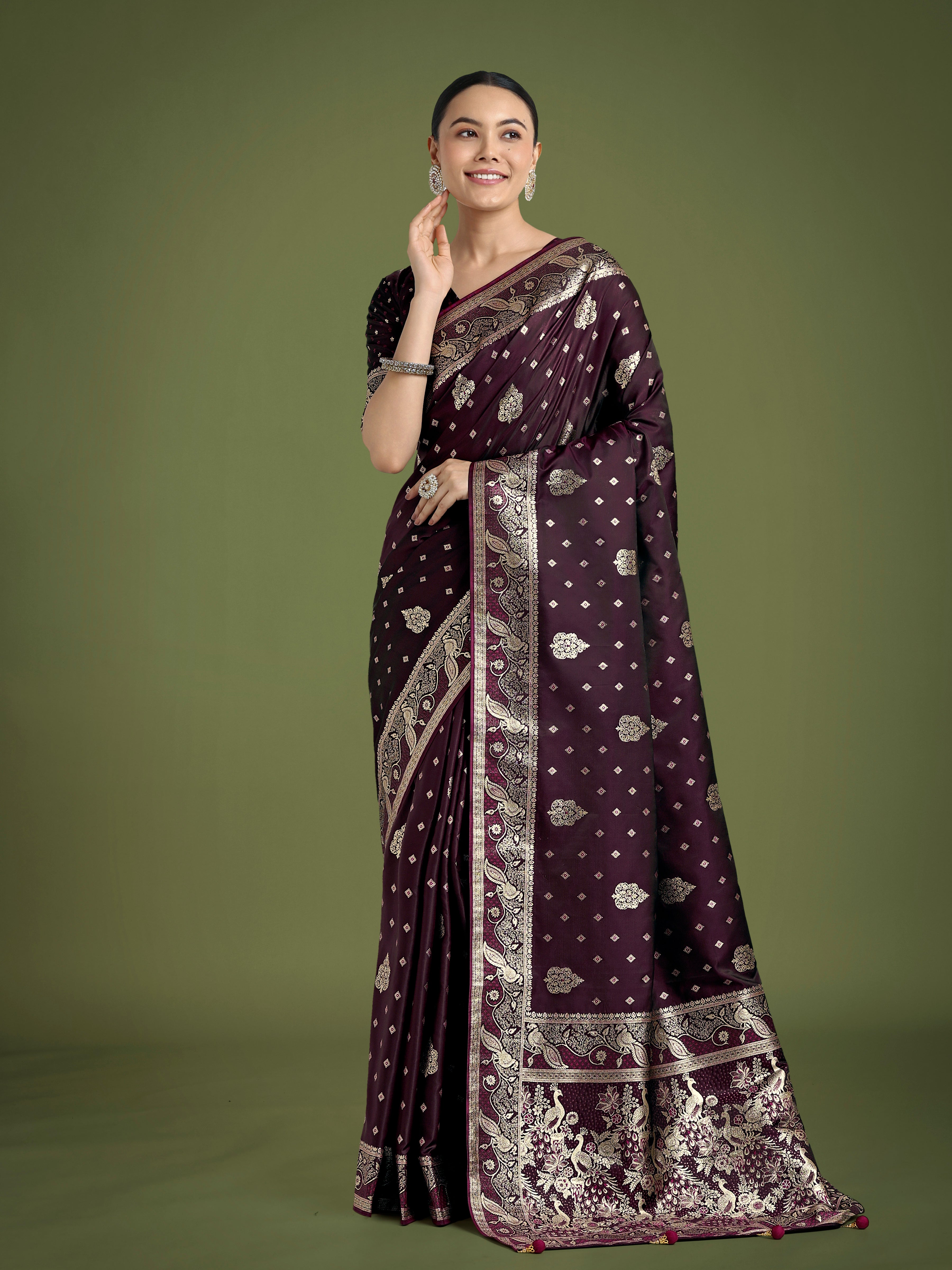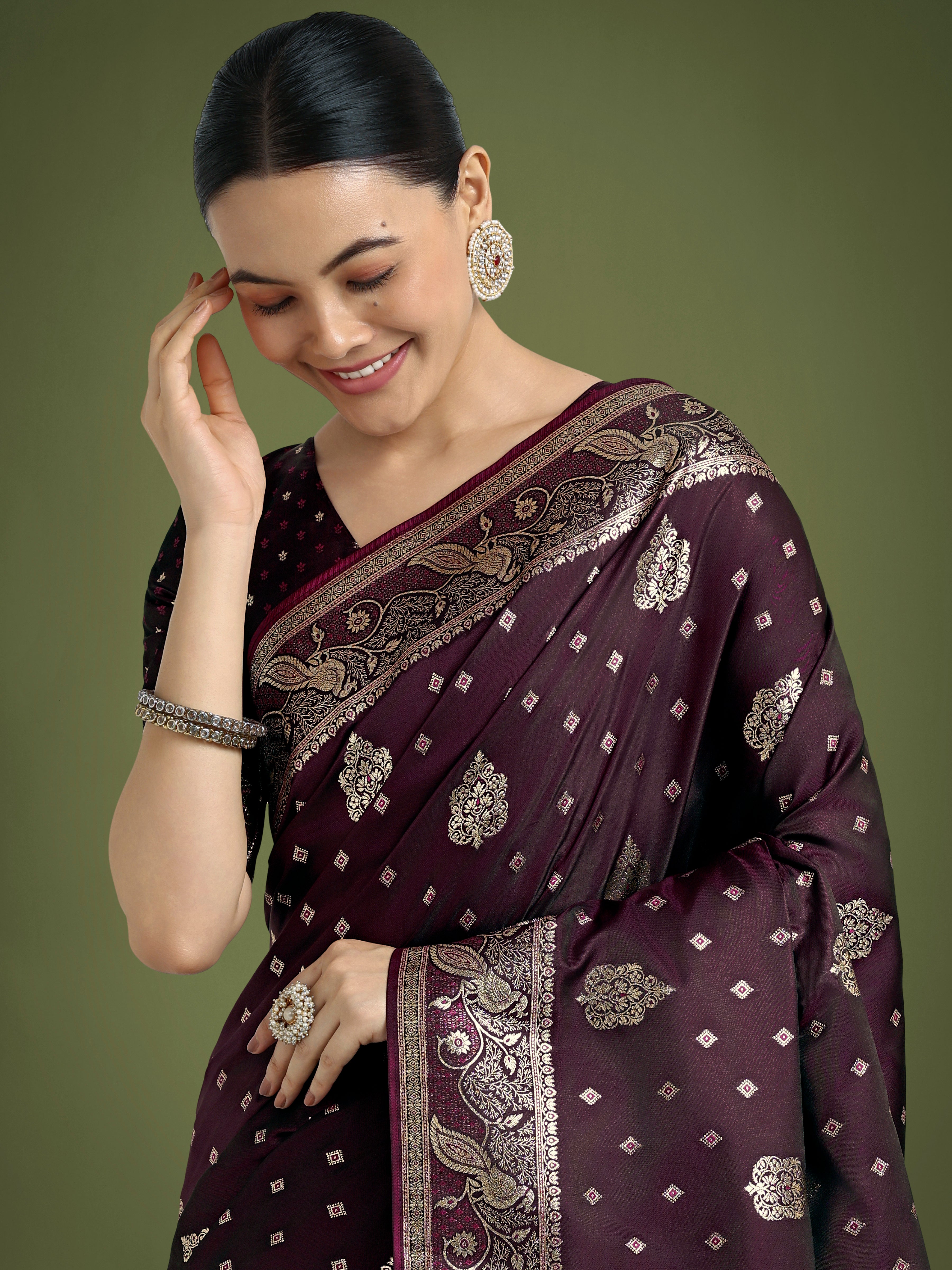We have ensemble a symphony of enchanting piece to restyle your senses. Real beauty comes out from your dressing style with this Wine Banarasi Satin silk contemporary saree. This attire is showing some really mesmerizing and innovative patterns Zari with weaving work. Comes with matching blouse. (Slight variation in color, fabric & work is possible. Model images are only representative.)