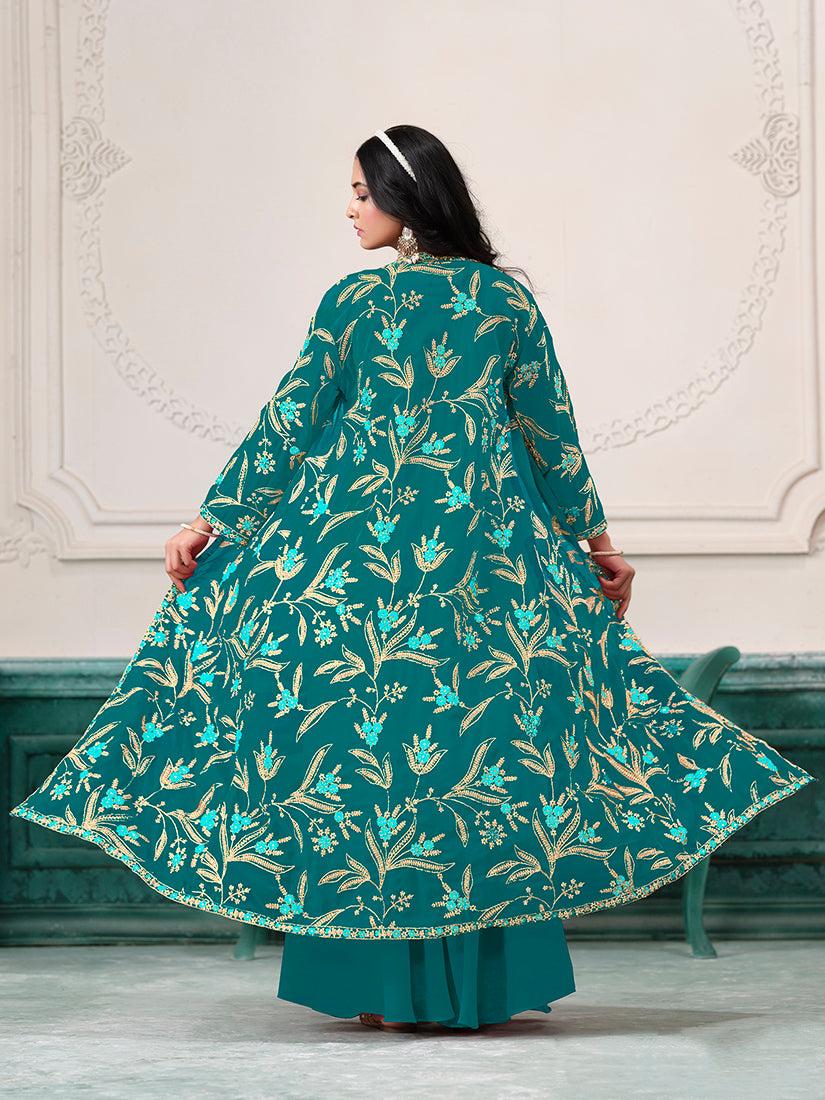Fashion and trend will be at the peak of your beauty once you attire this turquoise faux georgette readymade salwar kameez with shrug. The enticing embroidered and zari work a substantial element of this dress. Comes with matching bottom and shrug.