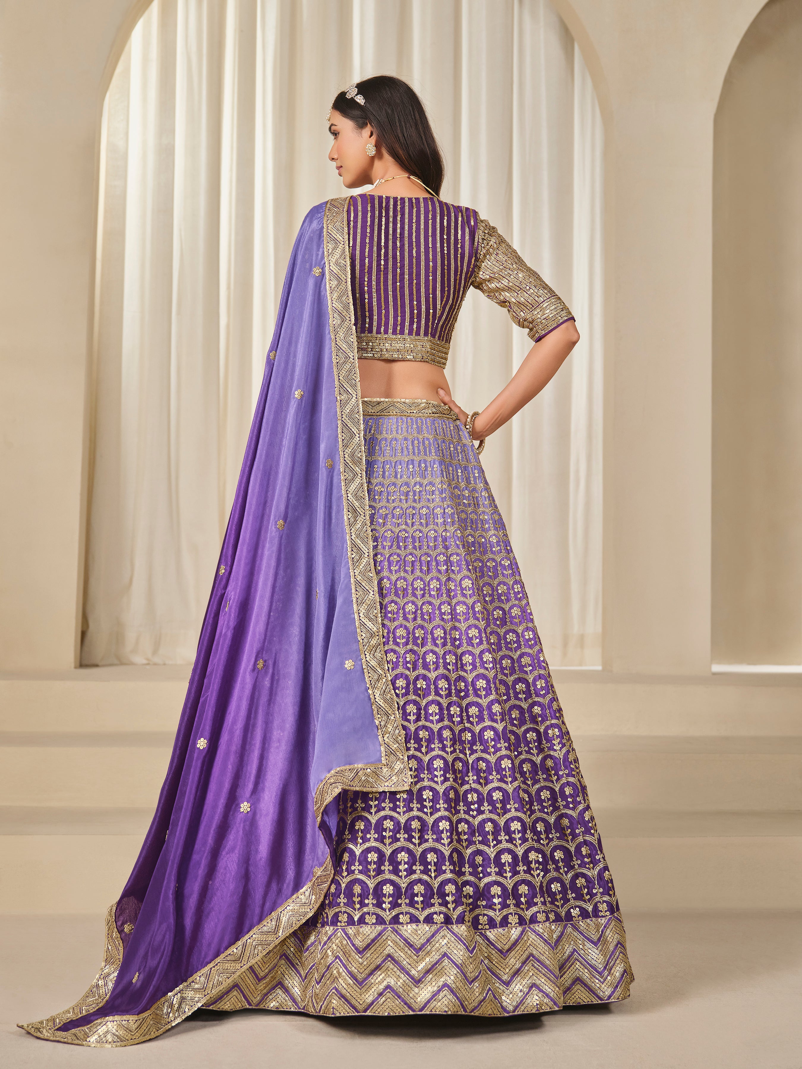 Sensible colors and excellent designs and romantic moods are reflected with an alluring style. Create a smoldering impact by this Violet chinon silk lehenga choli. This attire is encrafted with embroidered, sequins, thread and zari work. Comes with matching choli and dupatta. (Slight variation in color, fabric & work is possible. Model images are only representative.)