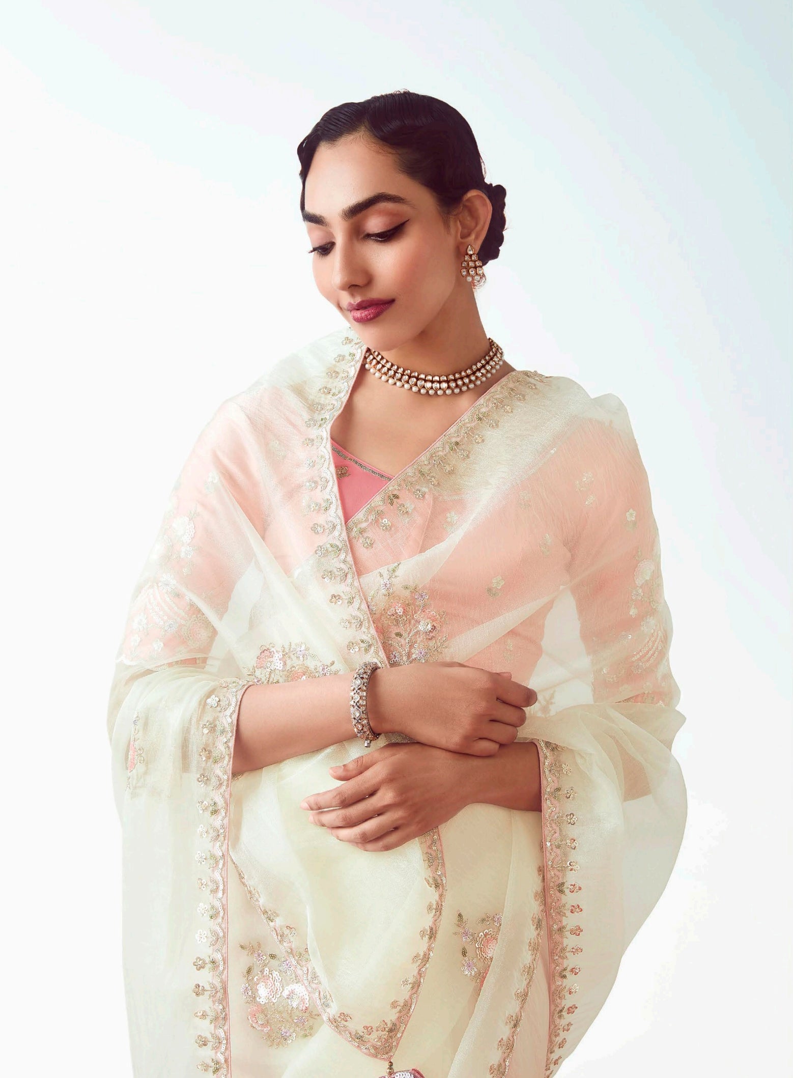 Designed with simplicity with a touch of soberness in its work makes a masterpiece. Keep ahead in fashion with this White fancy fabric designer saree. Beautified with cutwork, embroidered and sequins work all synchronized well with the pattern and design of the attire. Comes with unstitched blouse.