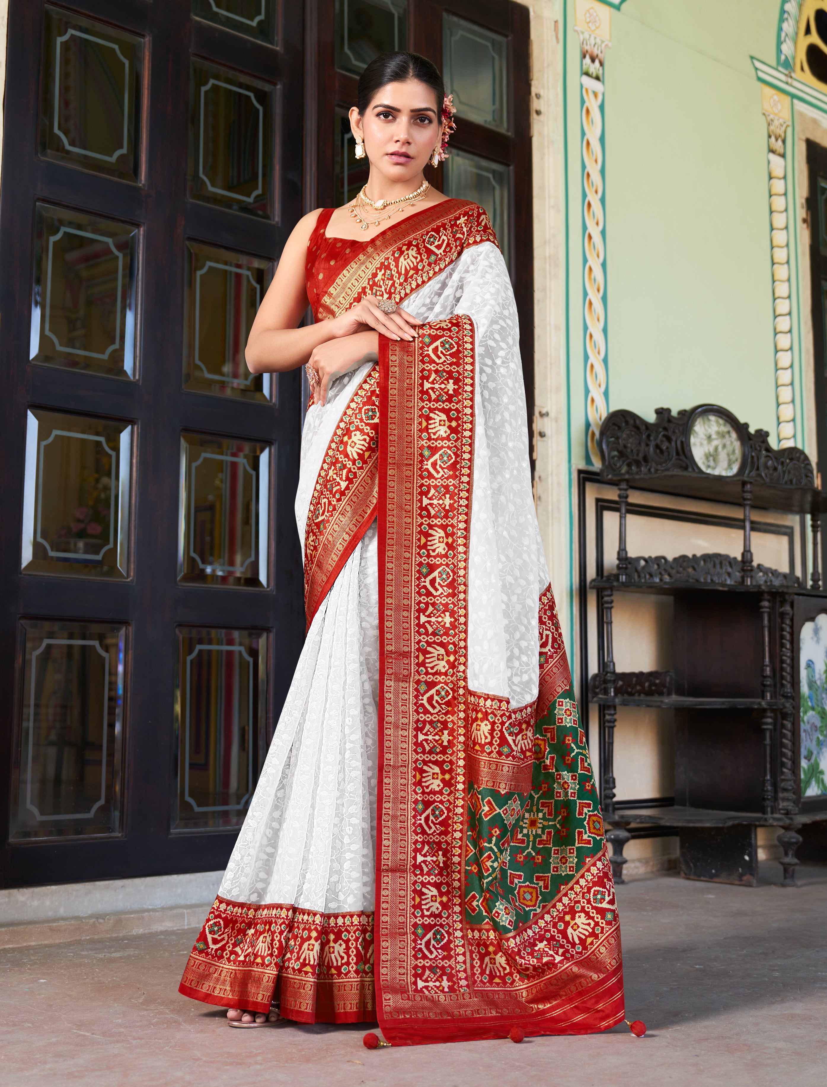 Saree Colour : White| Blouse Colour :- Red