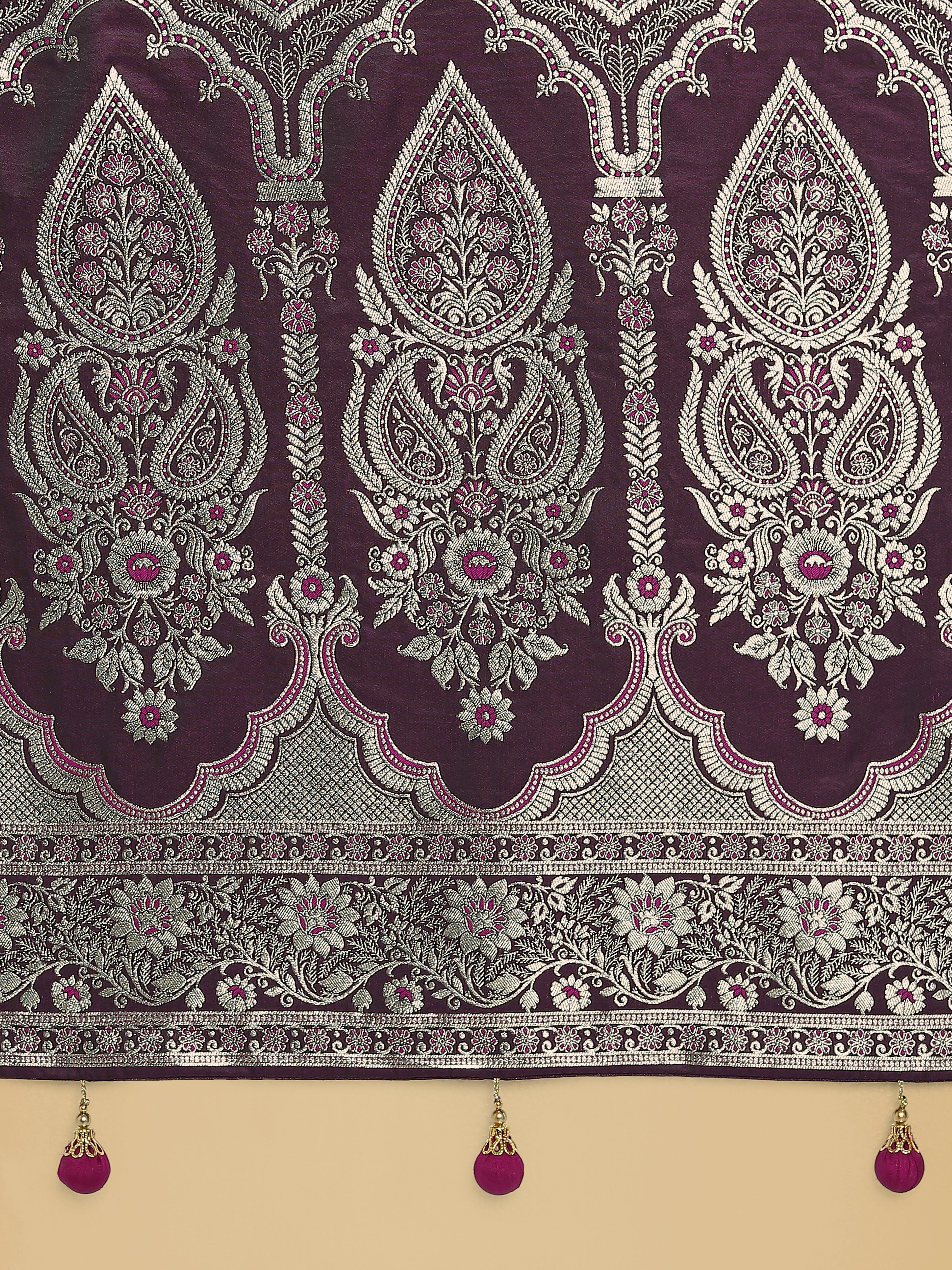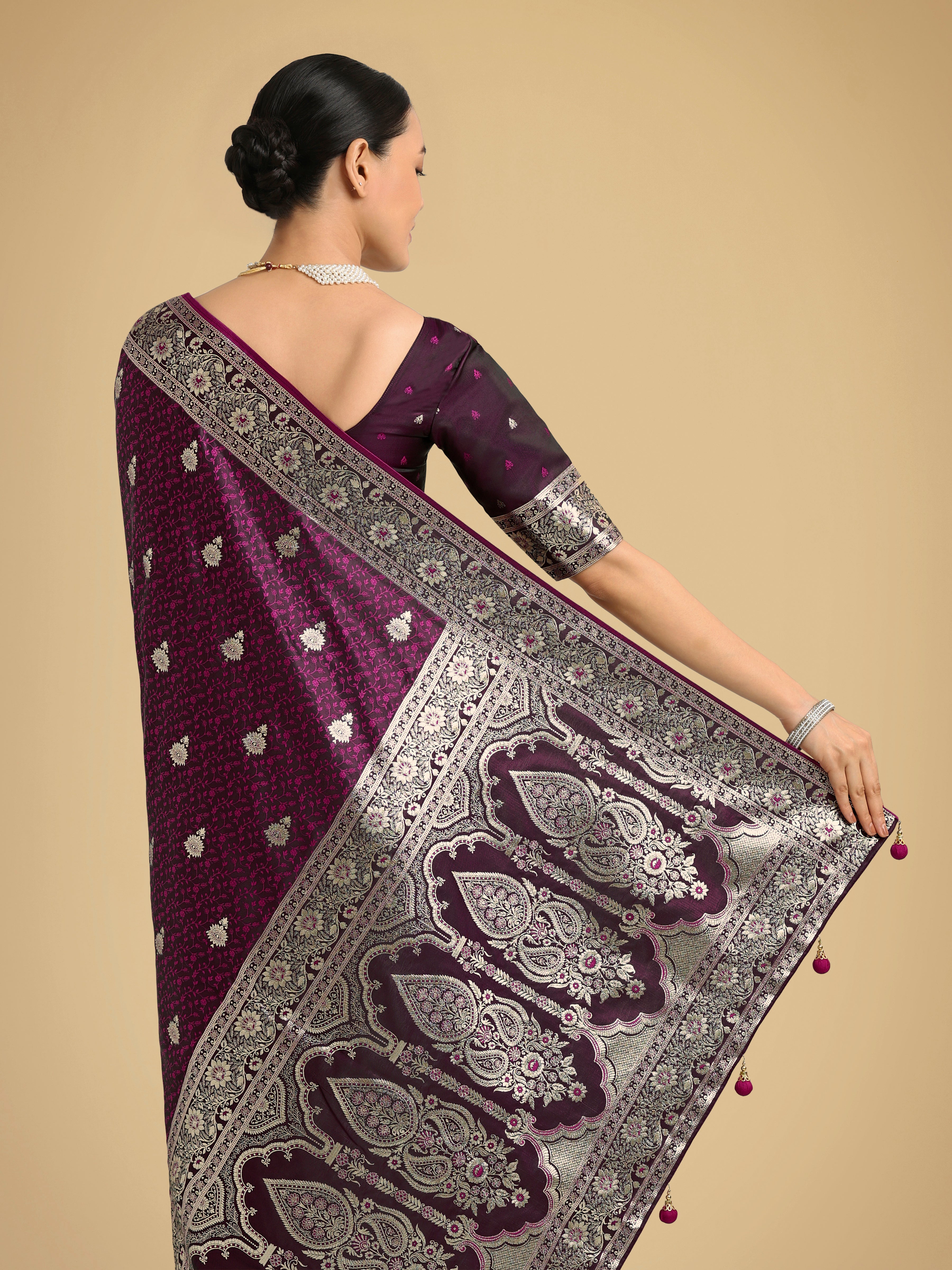 You will be bound to make a powerful style statement with this Wine banarasi satin silk trendy saree. The ethnic border, fancy, woven work and zari work for the attire adds a sign of beauty statement to your look. Comes with matching blouse. (Slight variation in color, fabric & work is possible. Model images are only representative.)
