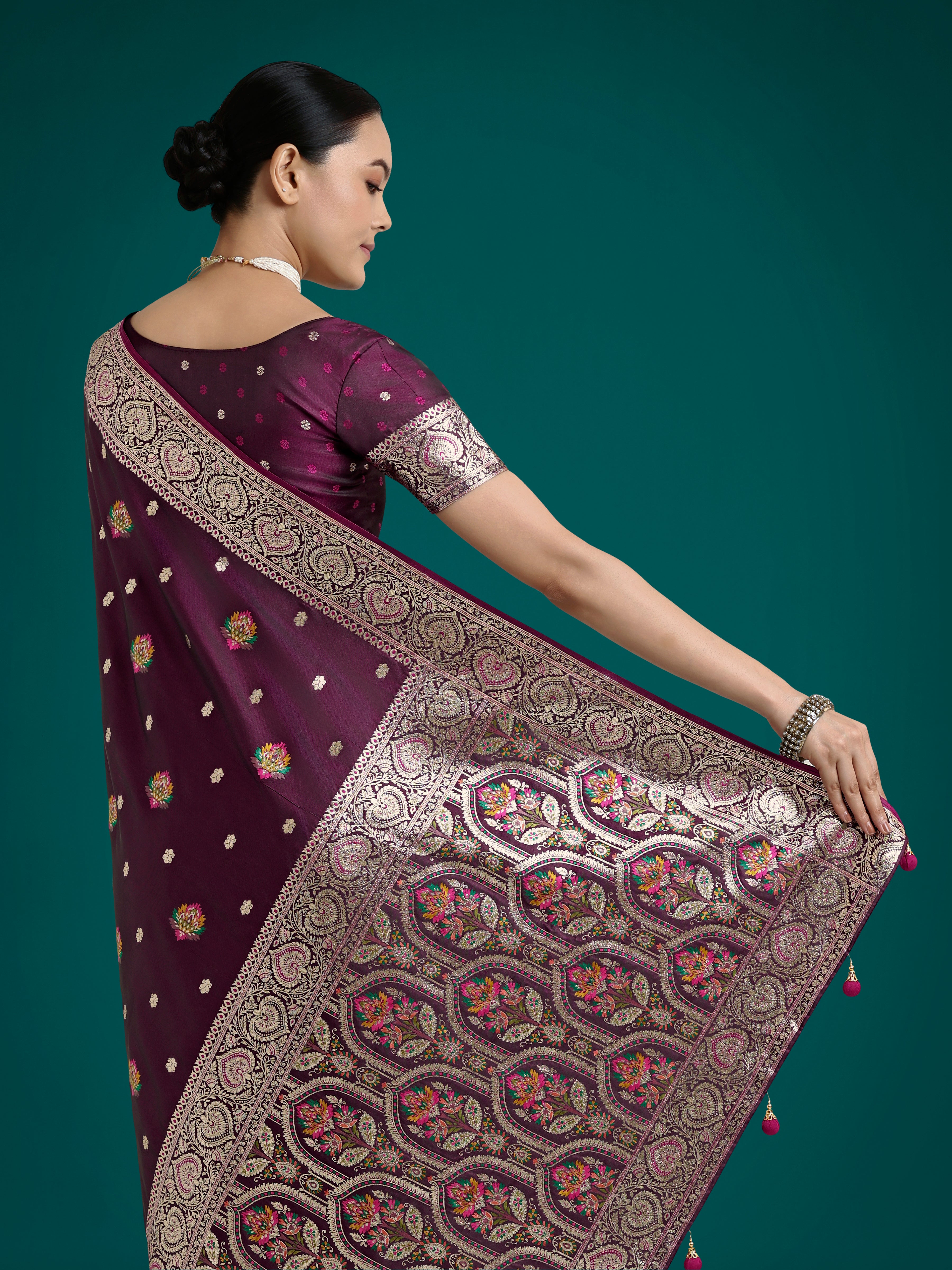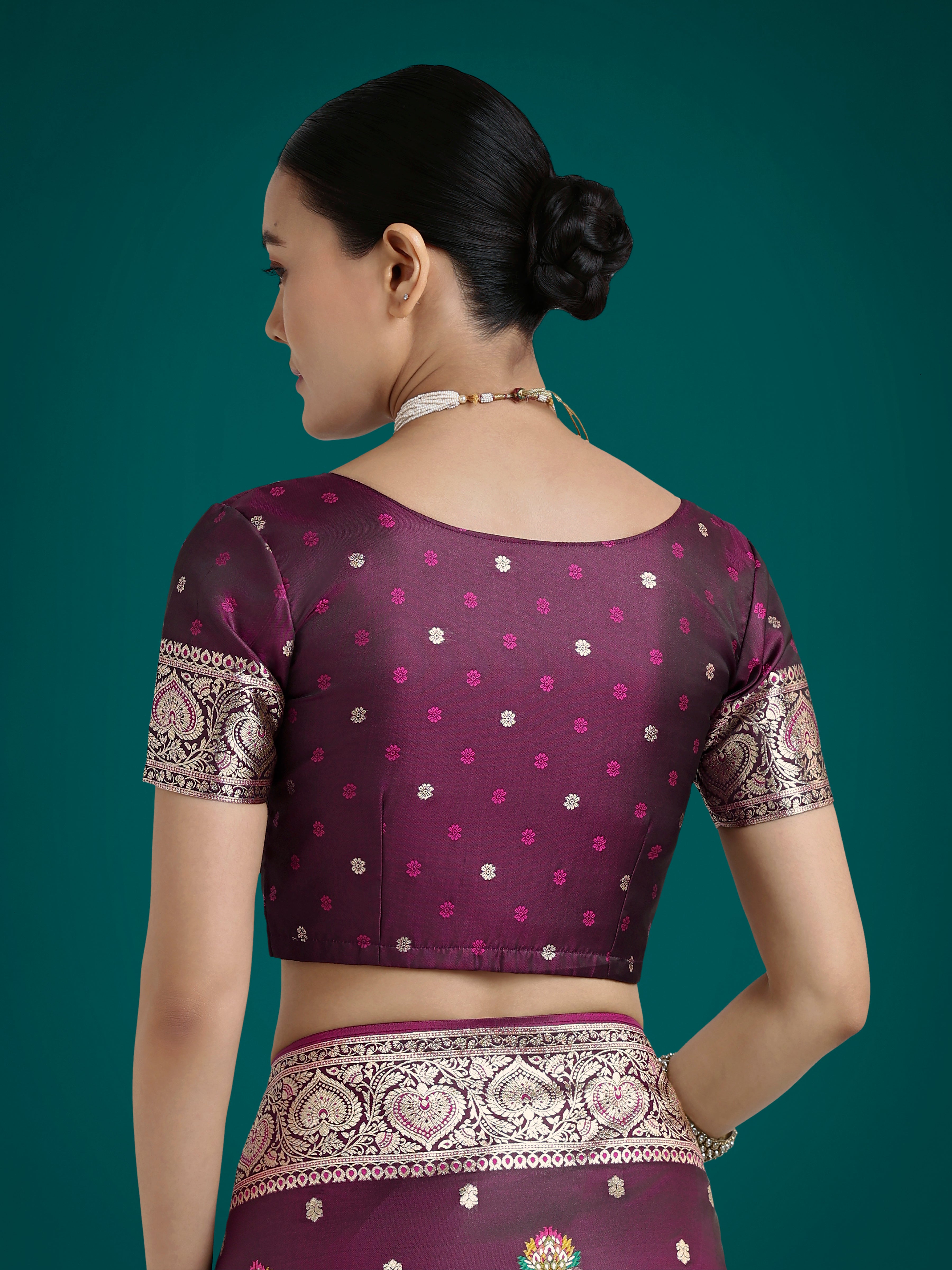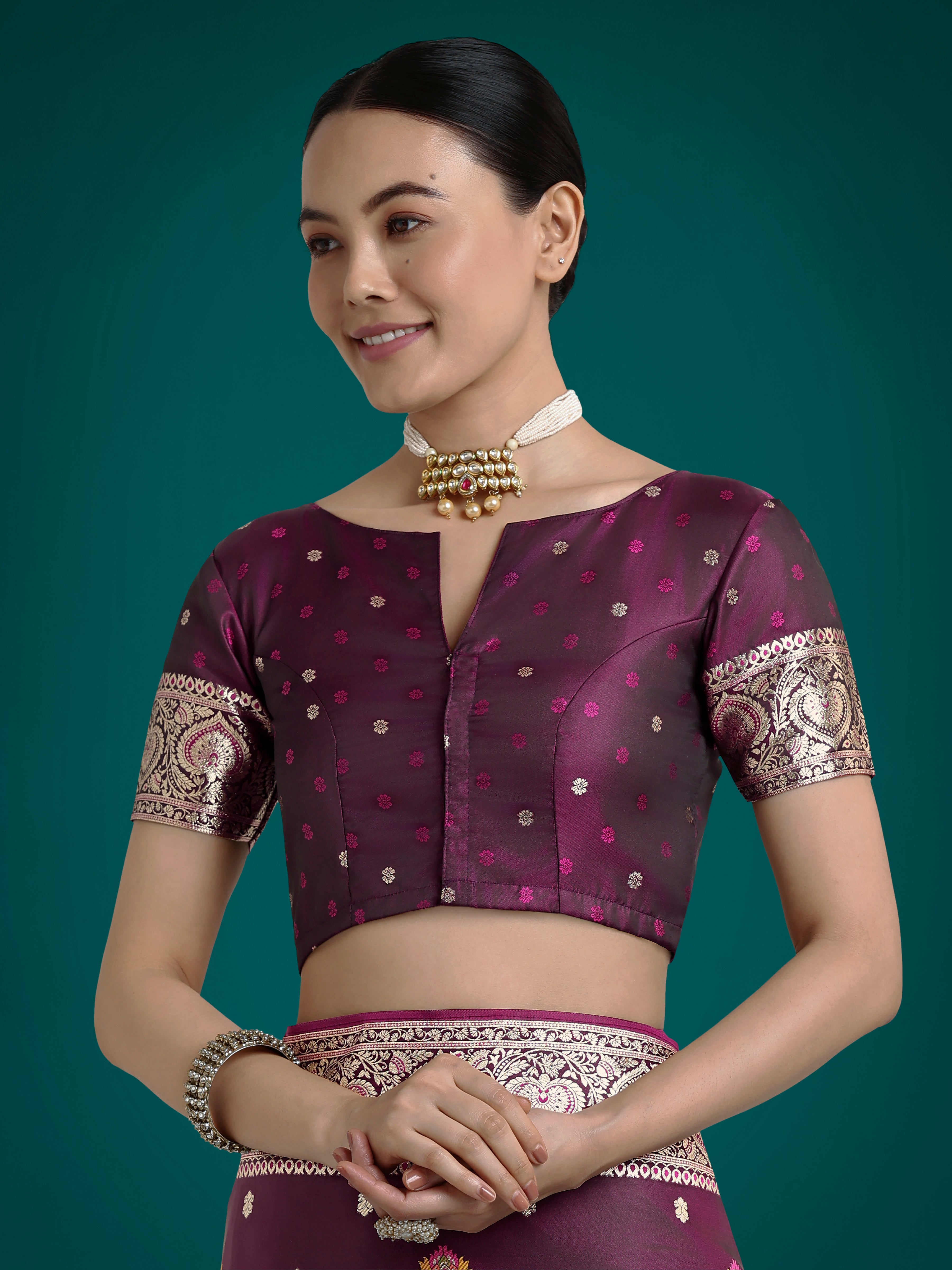 This pretty piece is a fairy tale that begins to unfold as you reveal your beauty in it. We unfurl our the intricacy and exclusivity of our creations highlighted in this lovelyWine banarasi satin silk contemporary saree. The brilliant attire creates a dramatic canvas with amazing zari woven work. Comes with matching blouse. (Slight variation in color, fabric & work is possible. Model images are only representative.)