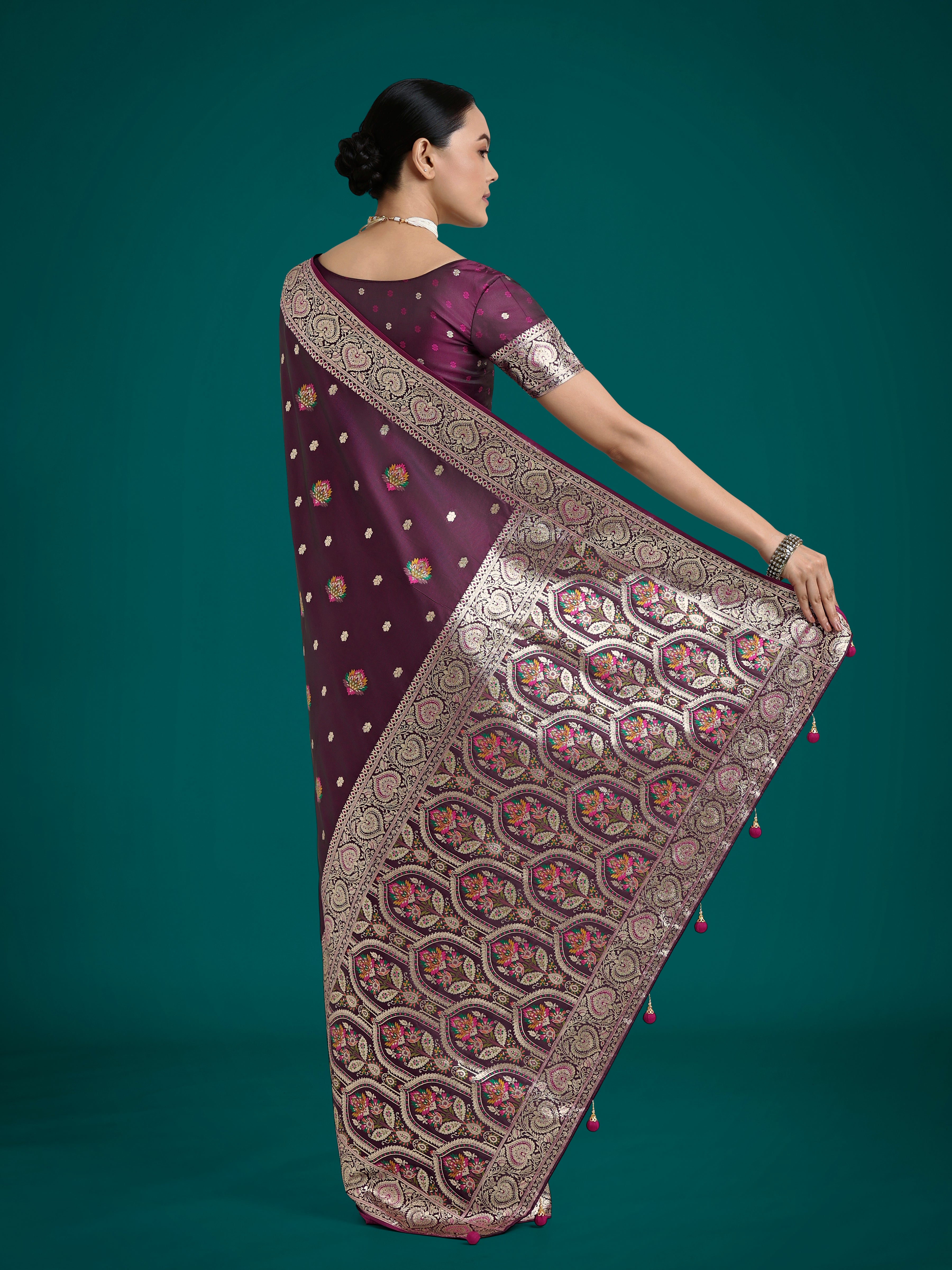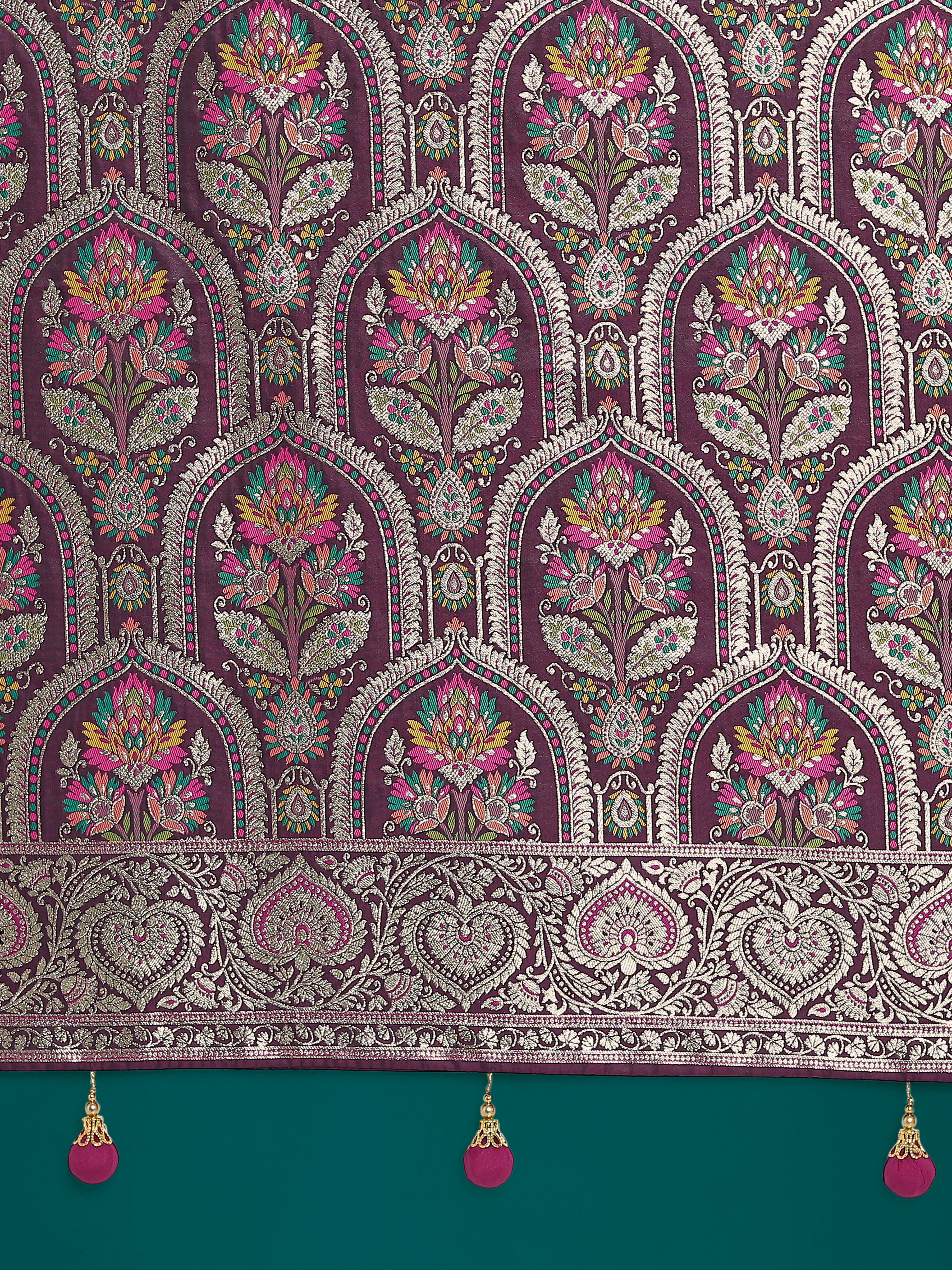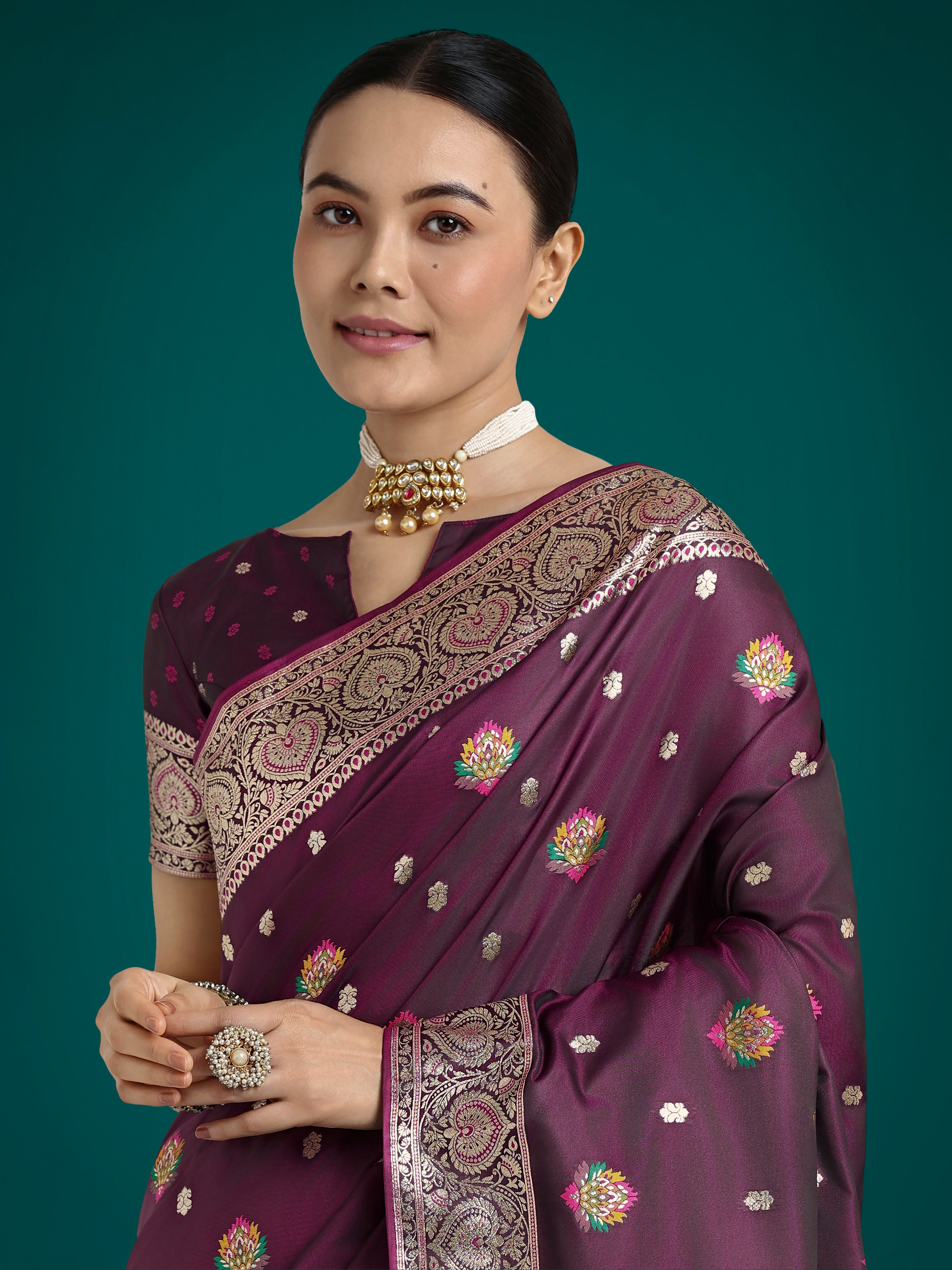 This pretty piece is a fairy tale that begins to unfold as you reveal your beauty in it. We unfurl our the intricacy and exclusivity of our creations highlighted in this lovelyWine banarasi satin silk contemporary saree. The brilliant attire creates a dramatic canvas with amazing zari woven work. Comes with matching blouse. (Slight variation in color, fabric & work is possible. Model images are only representative.)