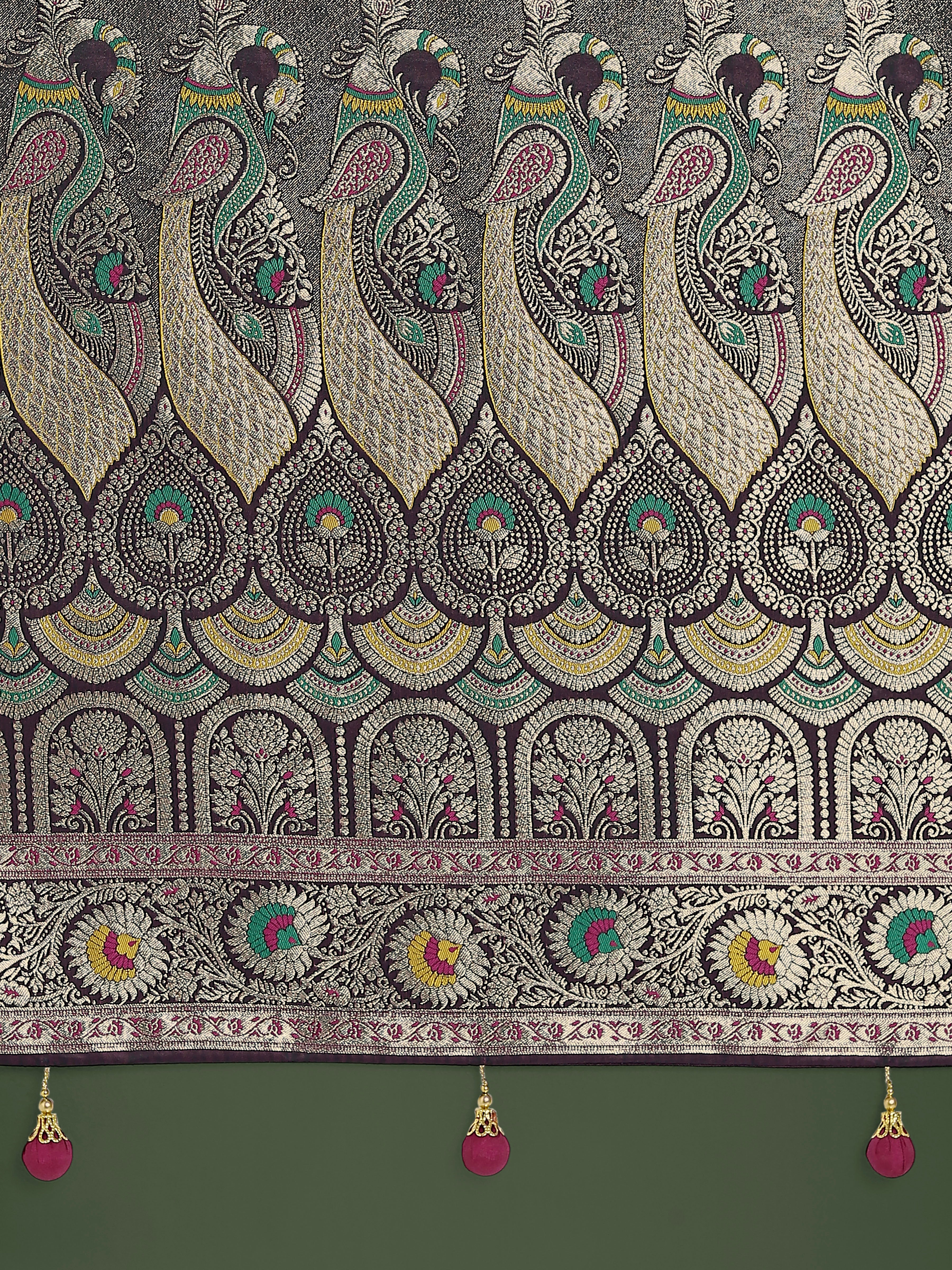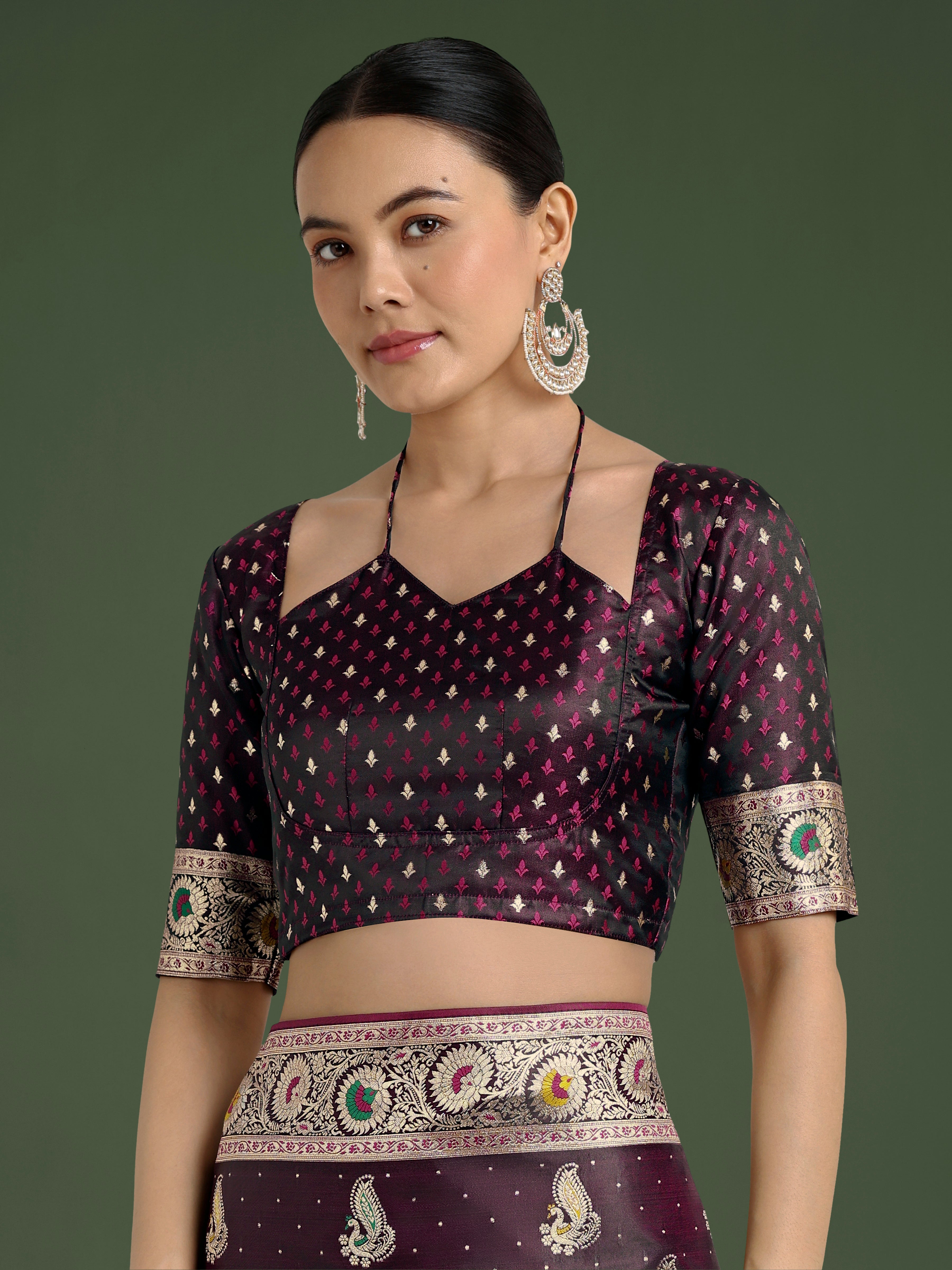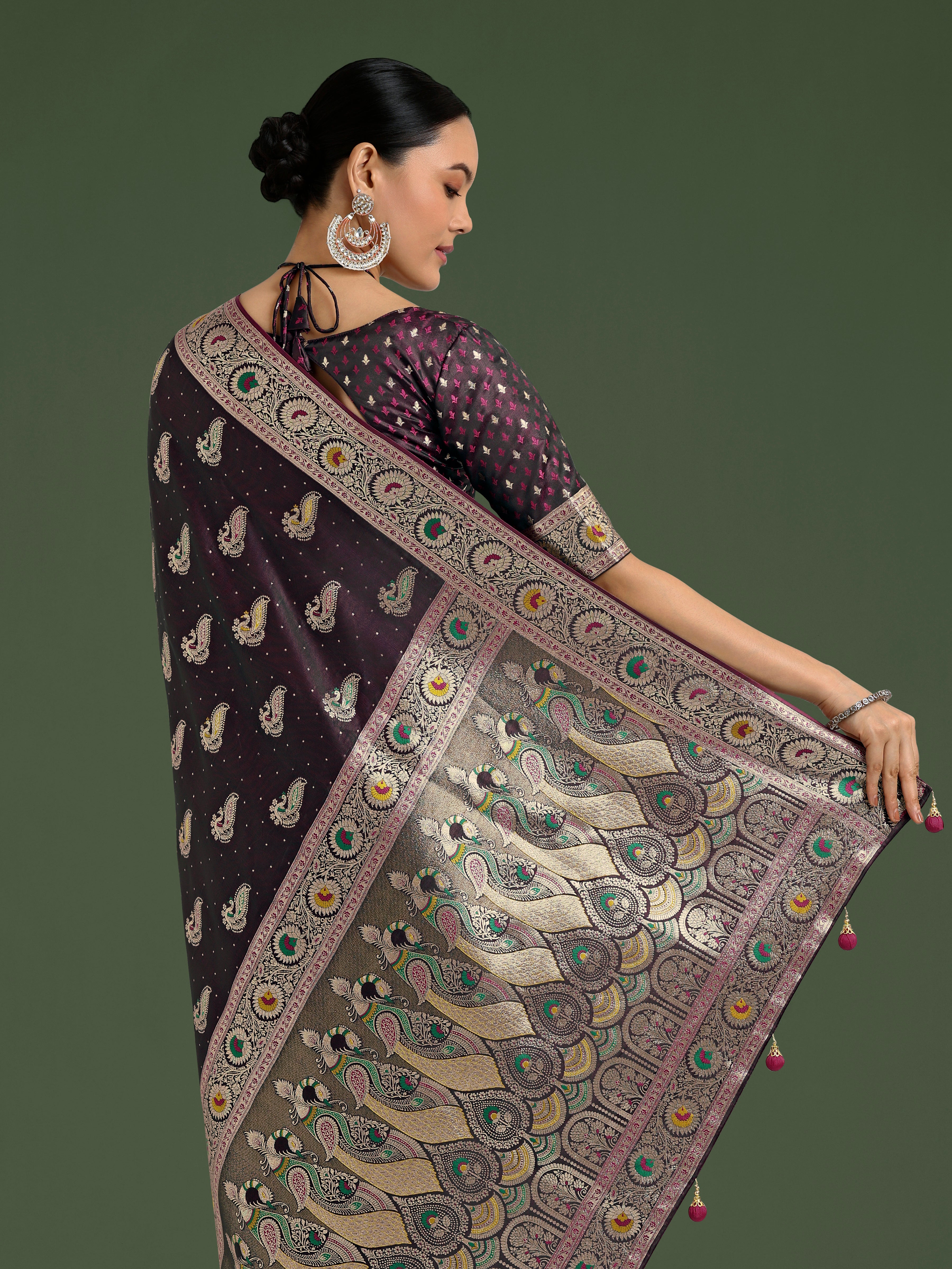 This brilliant array will make you the ultimate classic beauty at the next event you attend. We unfurl our the intricacy and exclusivity of our creations highlighted in this style of a appealing Wine banarasi satin silk and modal traditional saree. The amazing dress creates a dramatic canvas with wonderful Zari weaving work. Comes with matching blouse. (Slight variation in color, fabric & work is possible. Model images are only representative.)