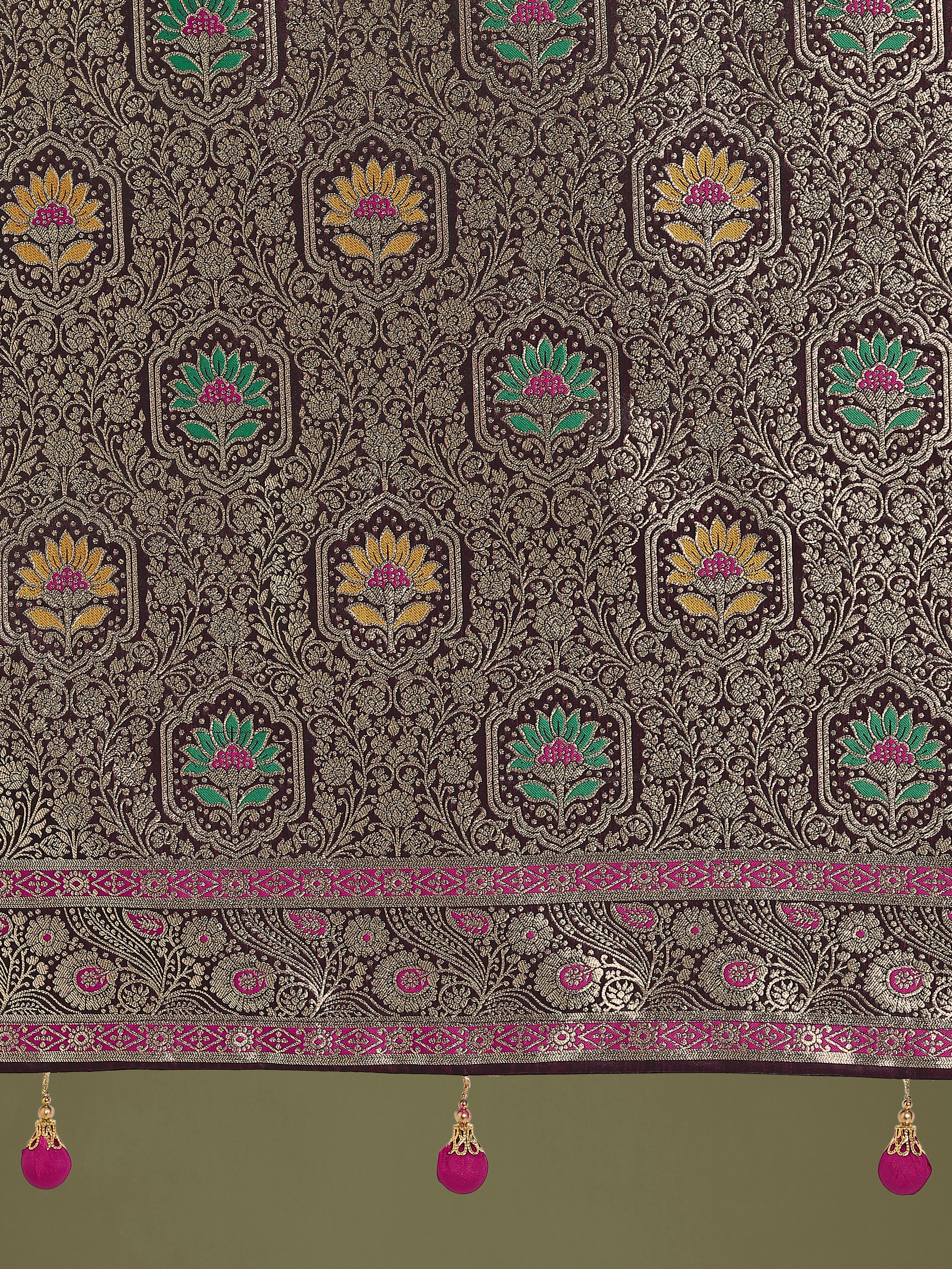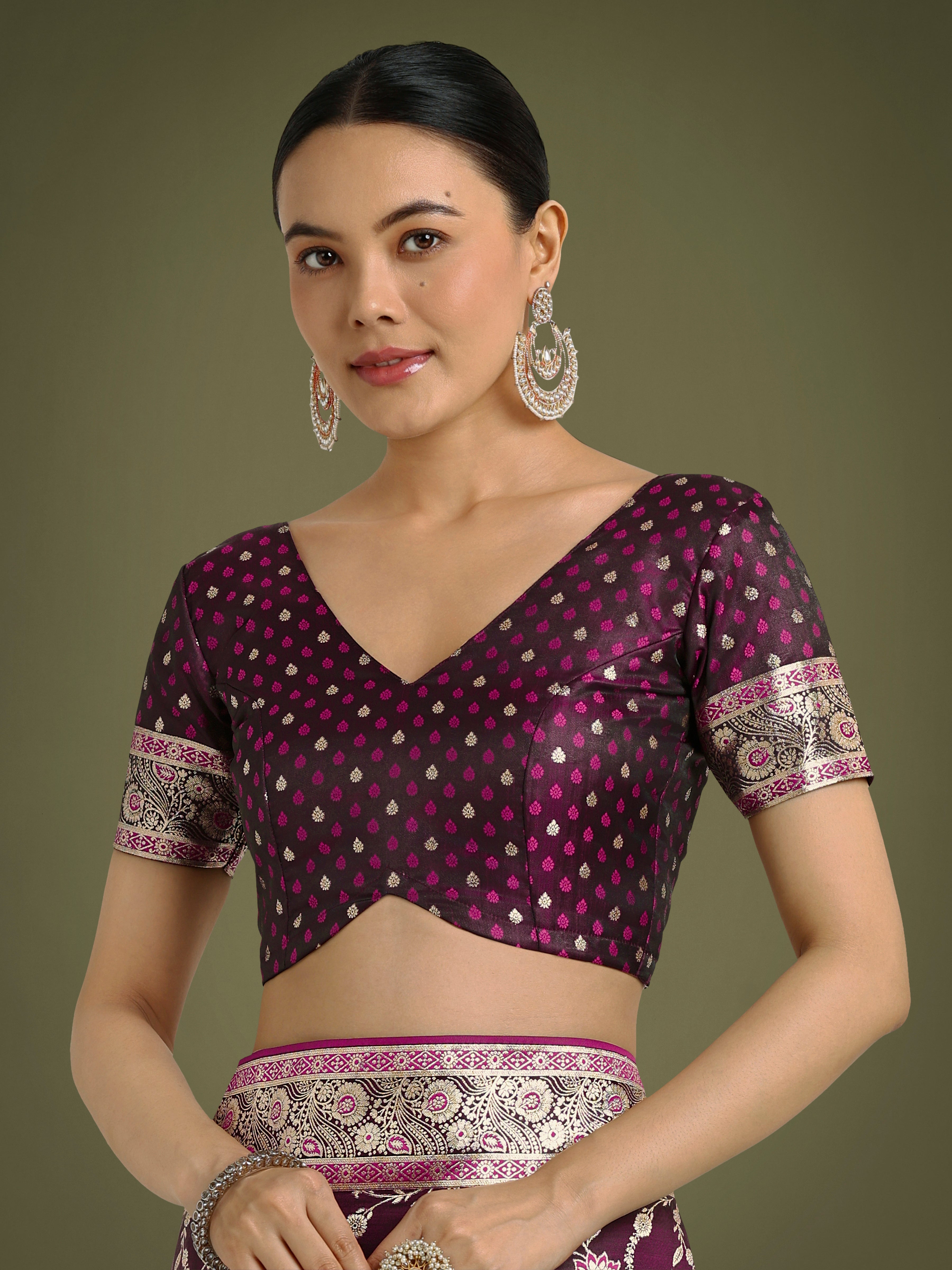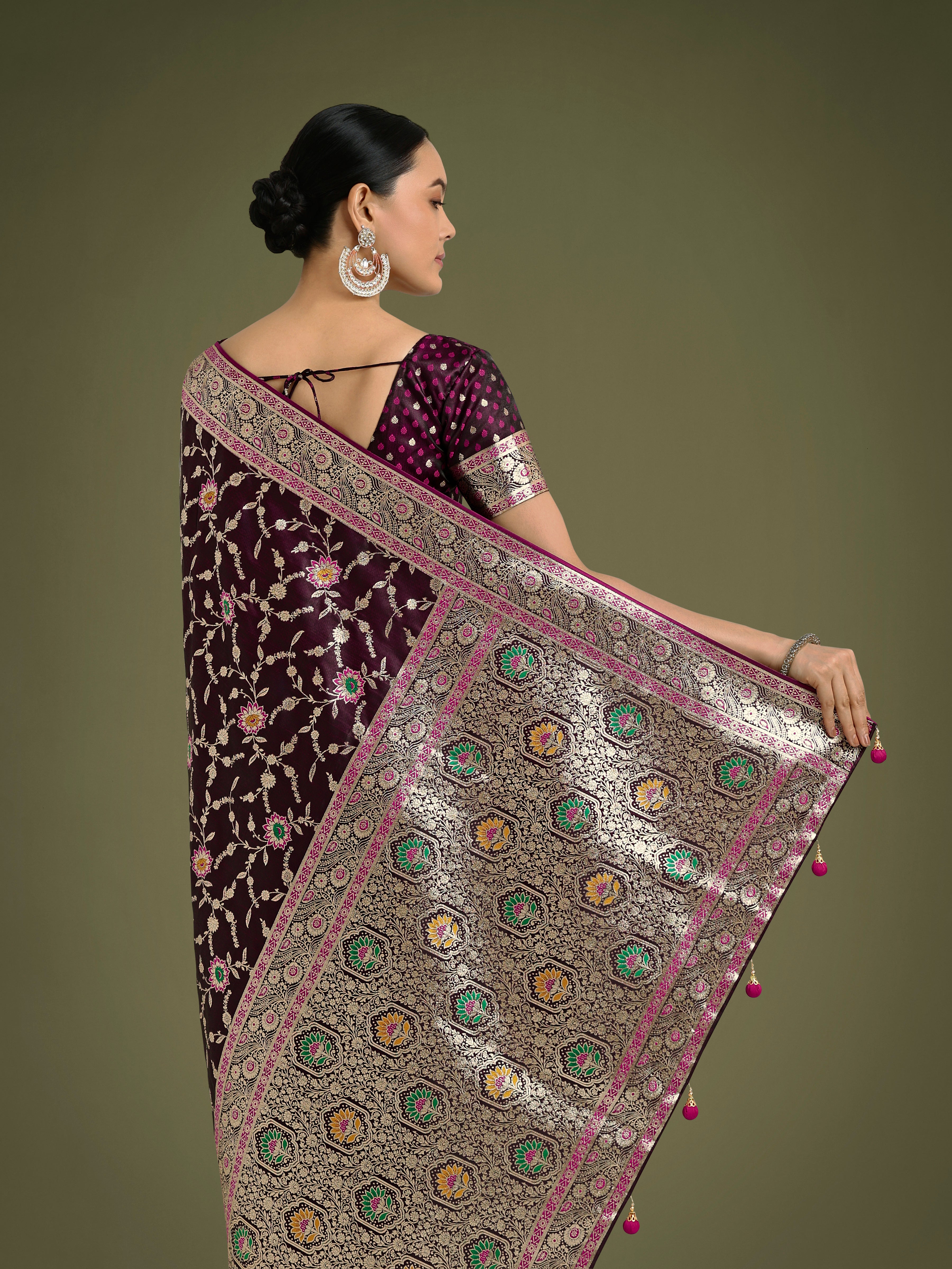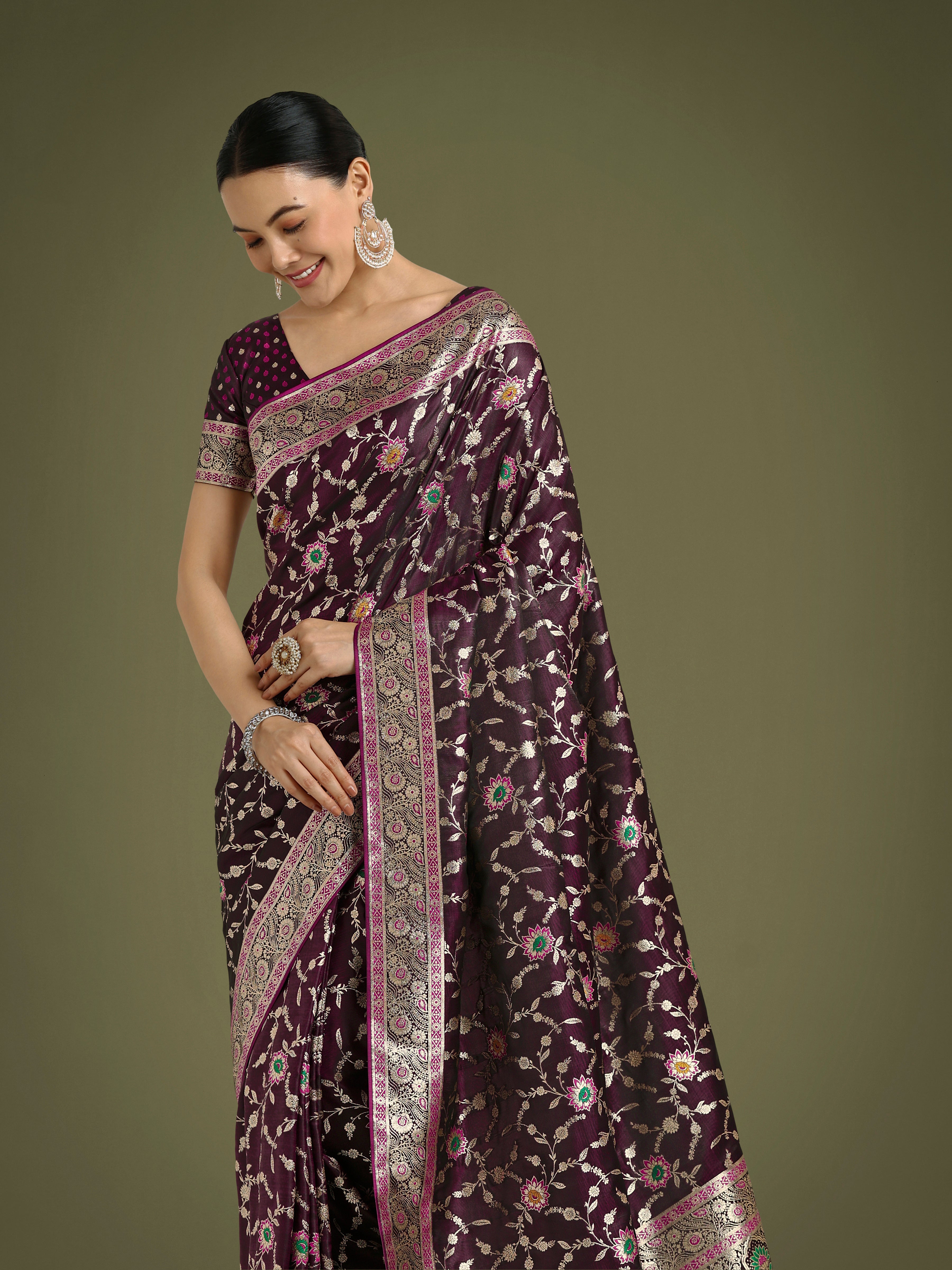 This brilliant array will make you the ultimate classic beauty at the next event you attend. Look ethnic in this affluent Wine Banarasi satin silktraditional saree. Beautified and stylized with border, fancy, weaving work and lace work to give you an attractive look. Comes with matching blouse. (Slight variation in color, fabric & work is possible. Model images are only representative.)