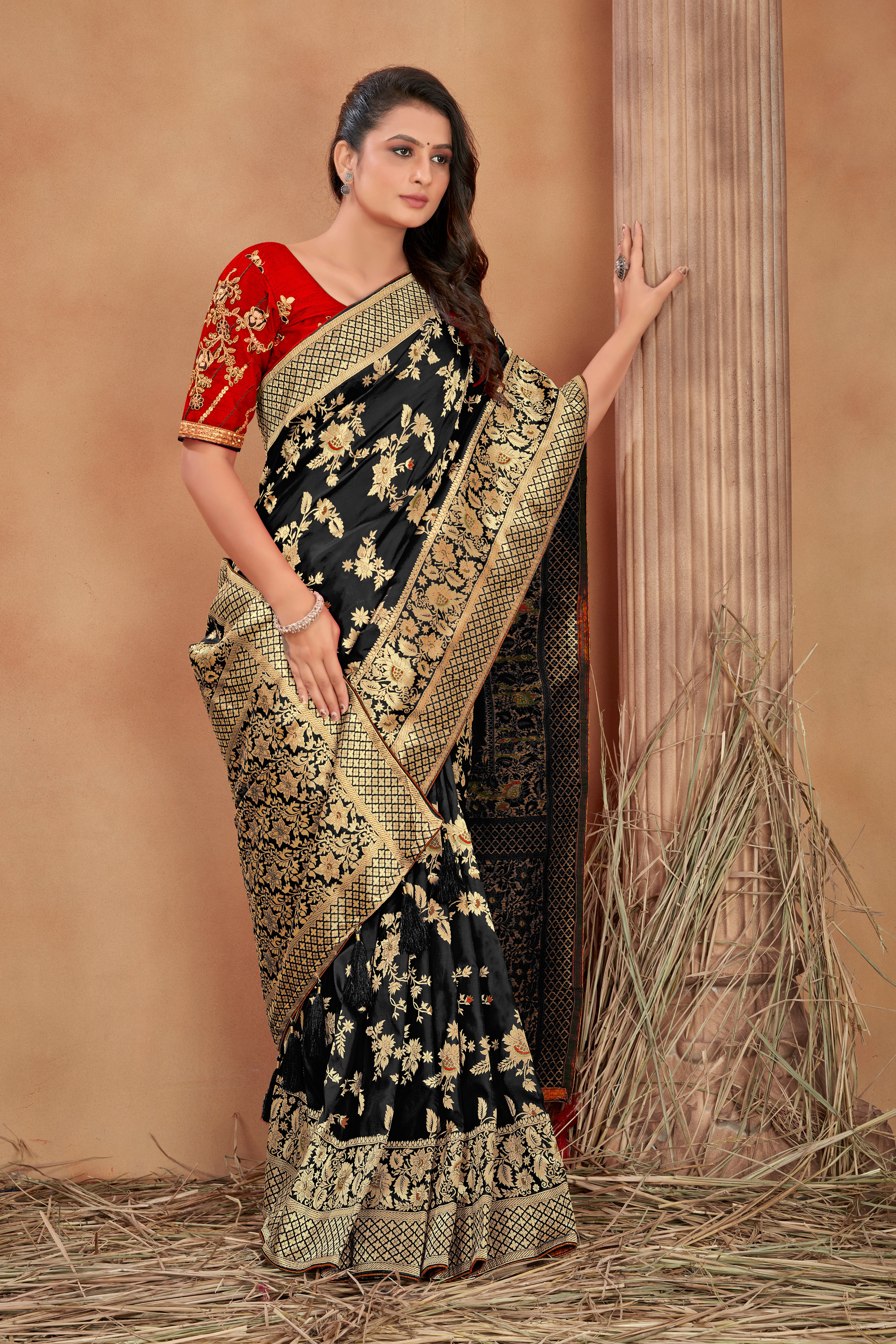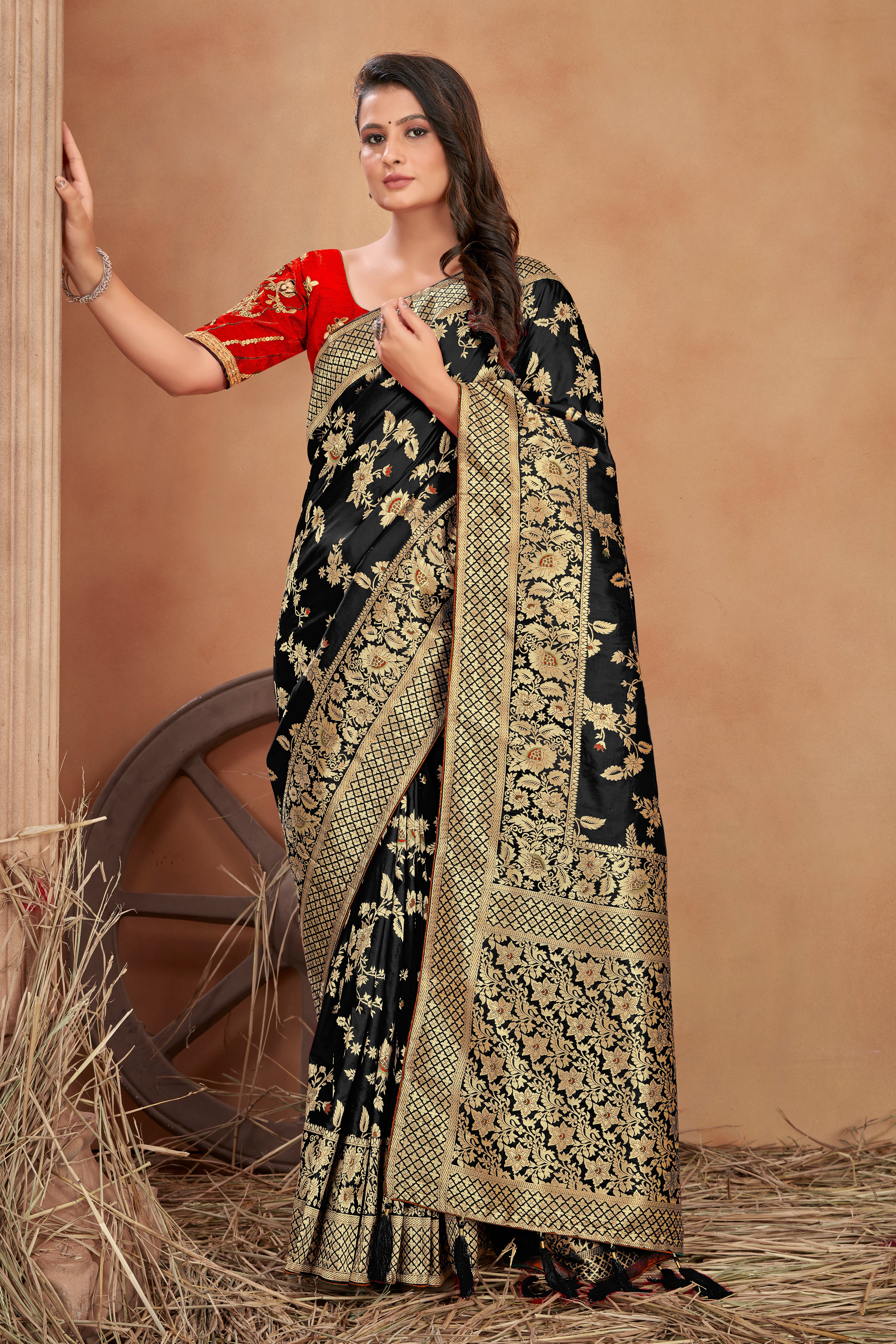 Monjolika fashion Presents Embrace understated elegance in our enchanting Black Banarasi silk saree, adorned with delicate floral motifs that add a touch of femininity to your look. The soft ivory hue lends a timeless charm, while the handwoven craftsmanship speaks volumes about your refined taste. Whether you're attending a day function or an evening soiree, this saree is sure to elevate your style quotient. The bold hue symbolizes auspiciousness and vitality, making it perfect for festive occasions or religious ceremonies. Elevate your ethnic look with this statement saree that exudes confidence and grace.