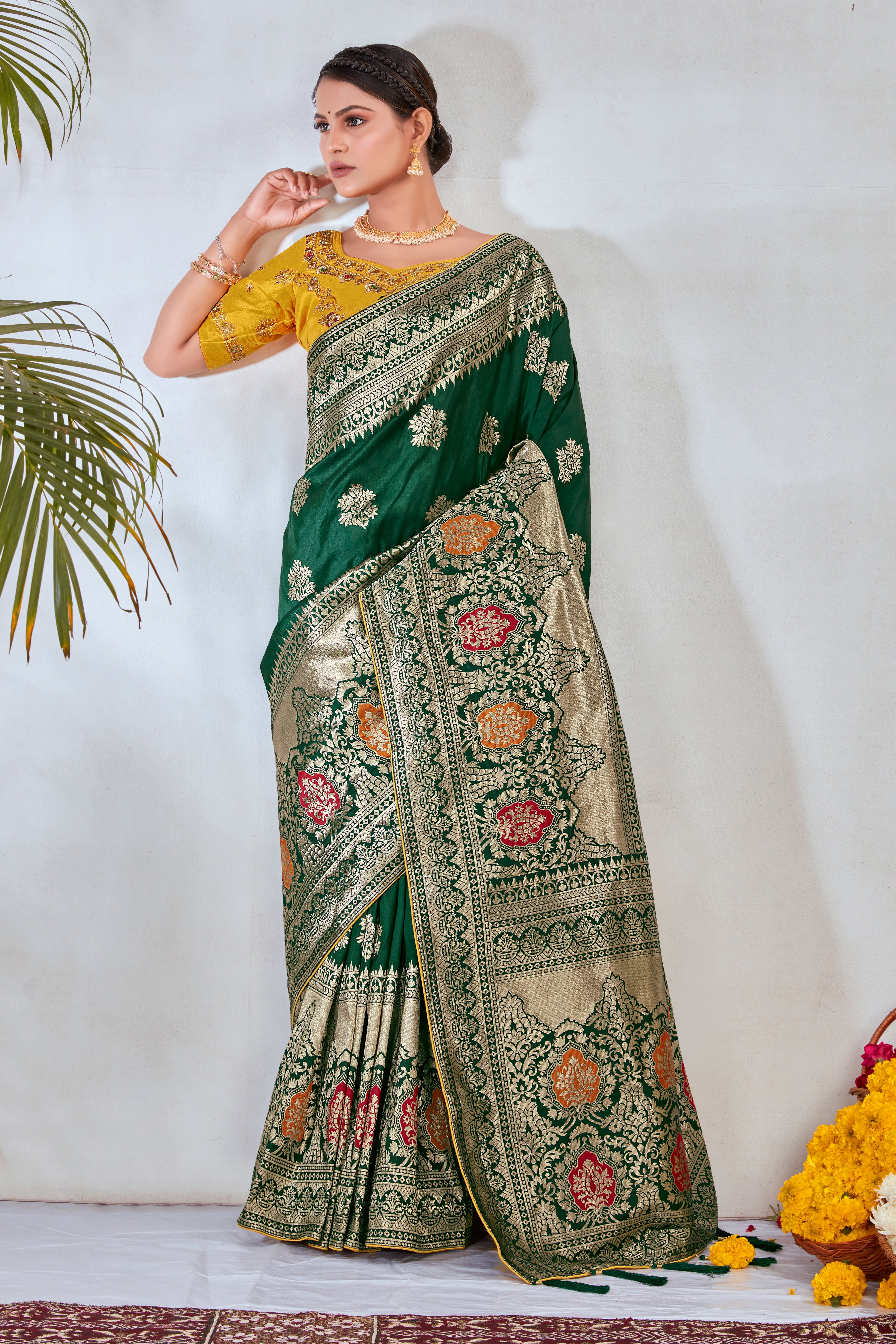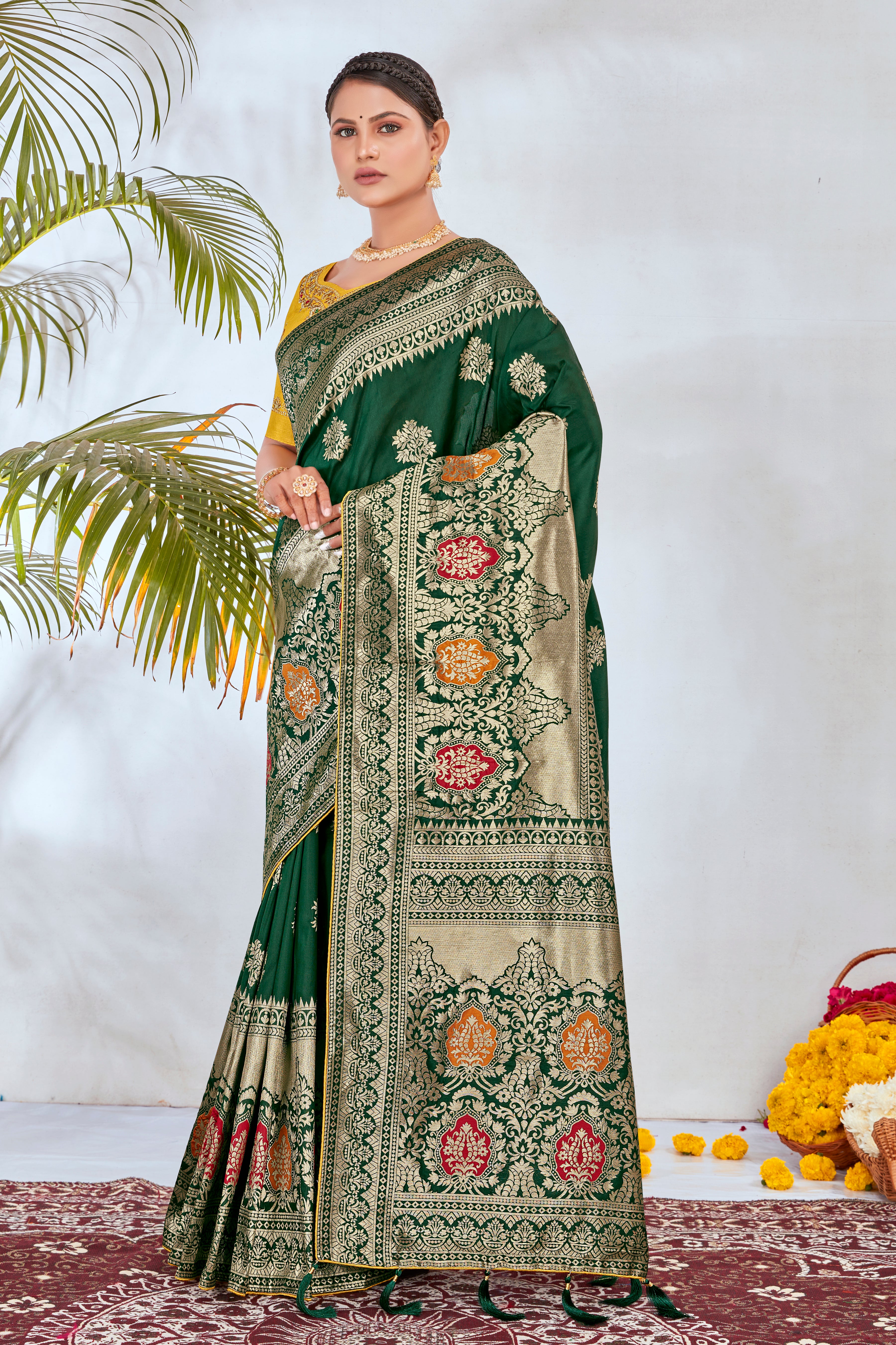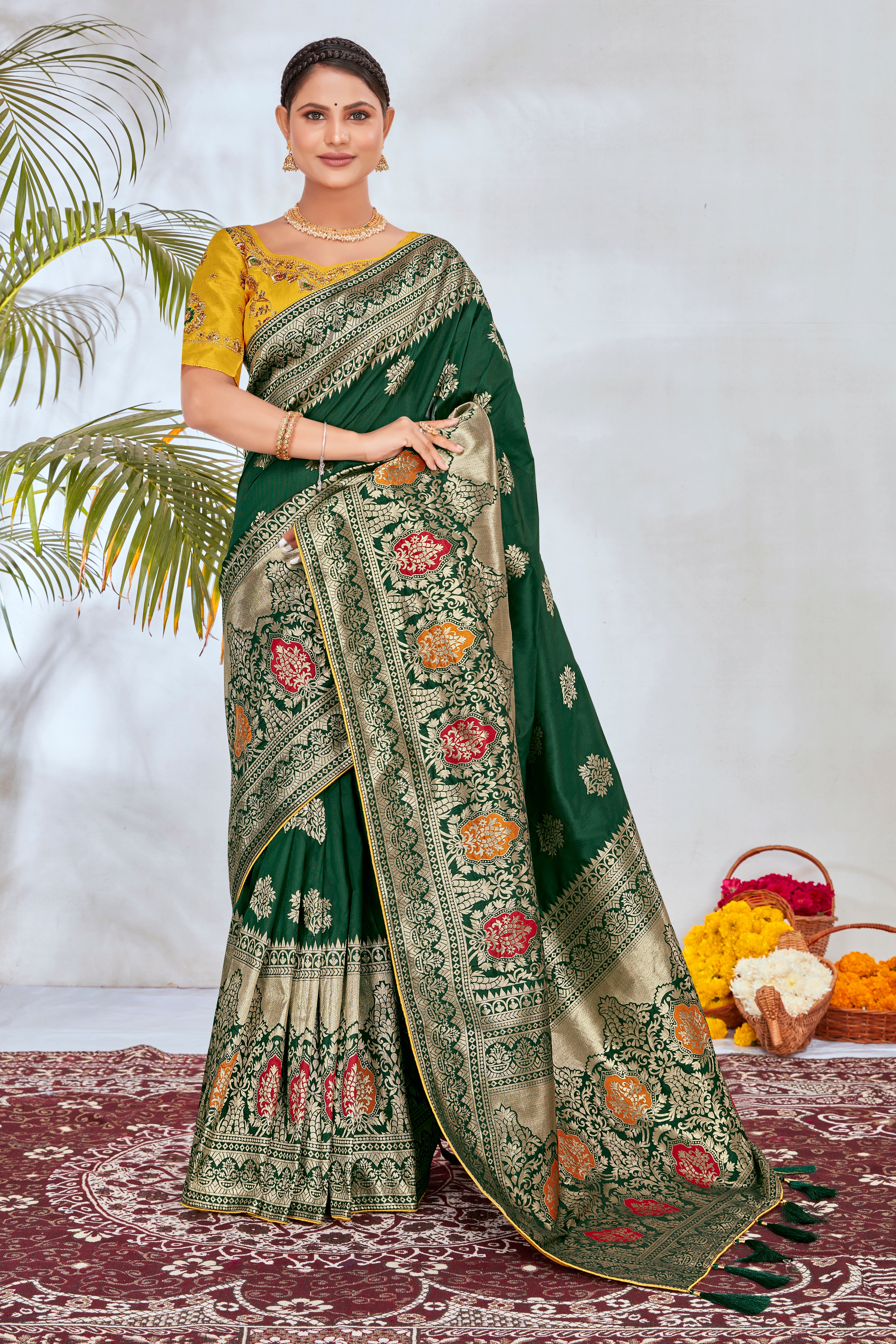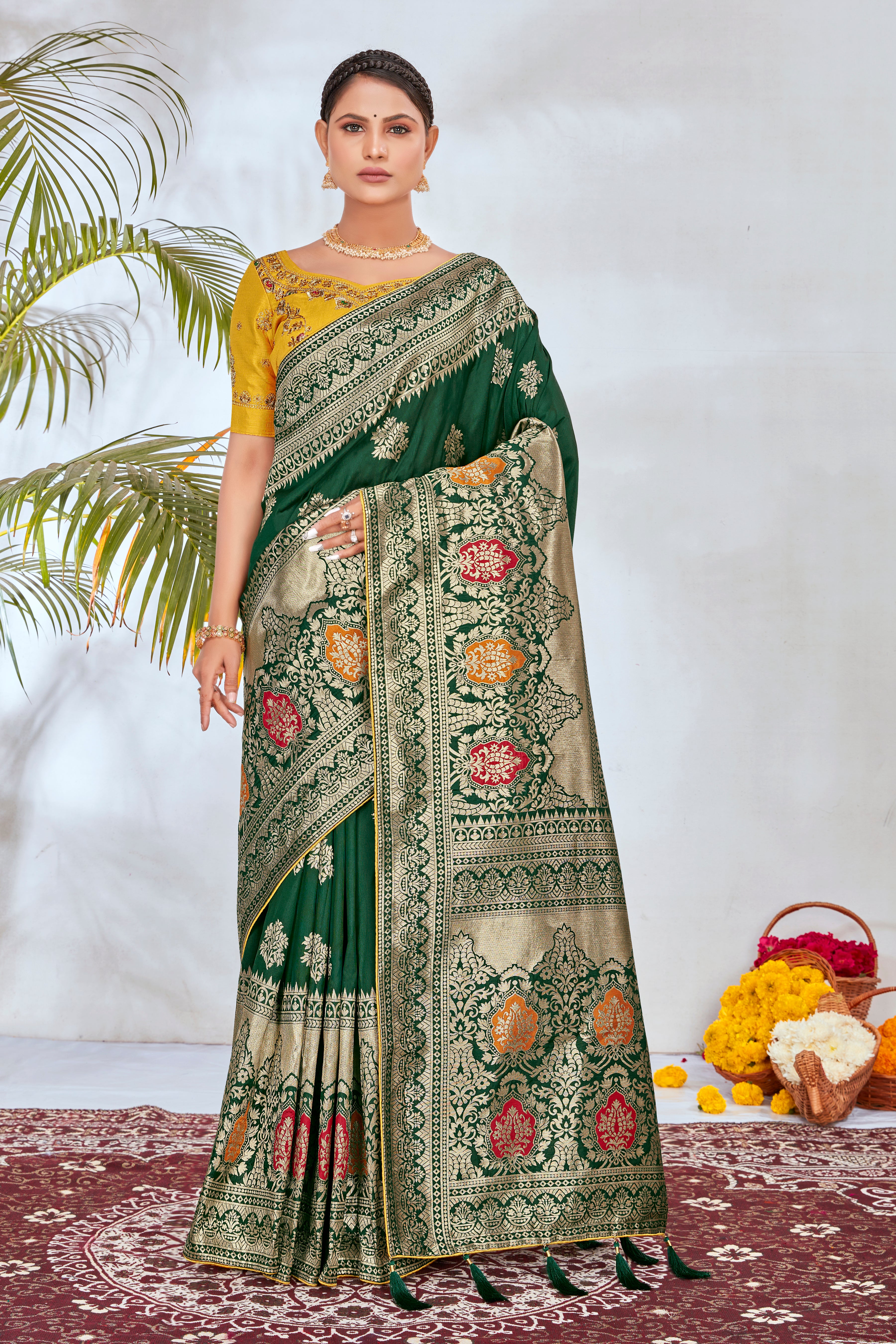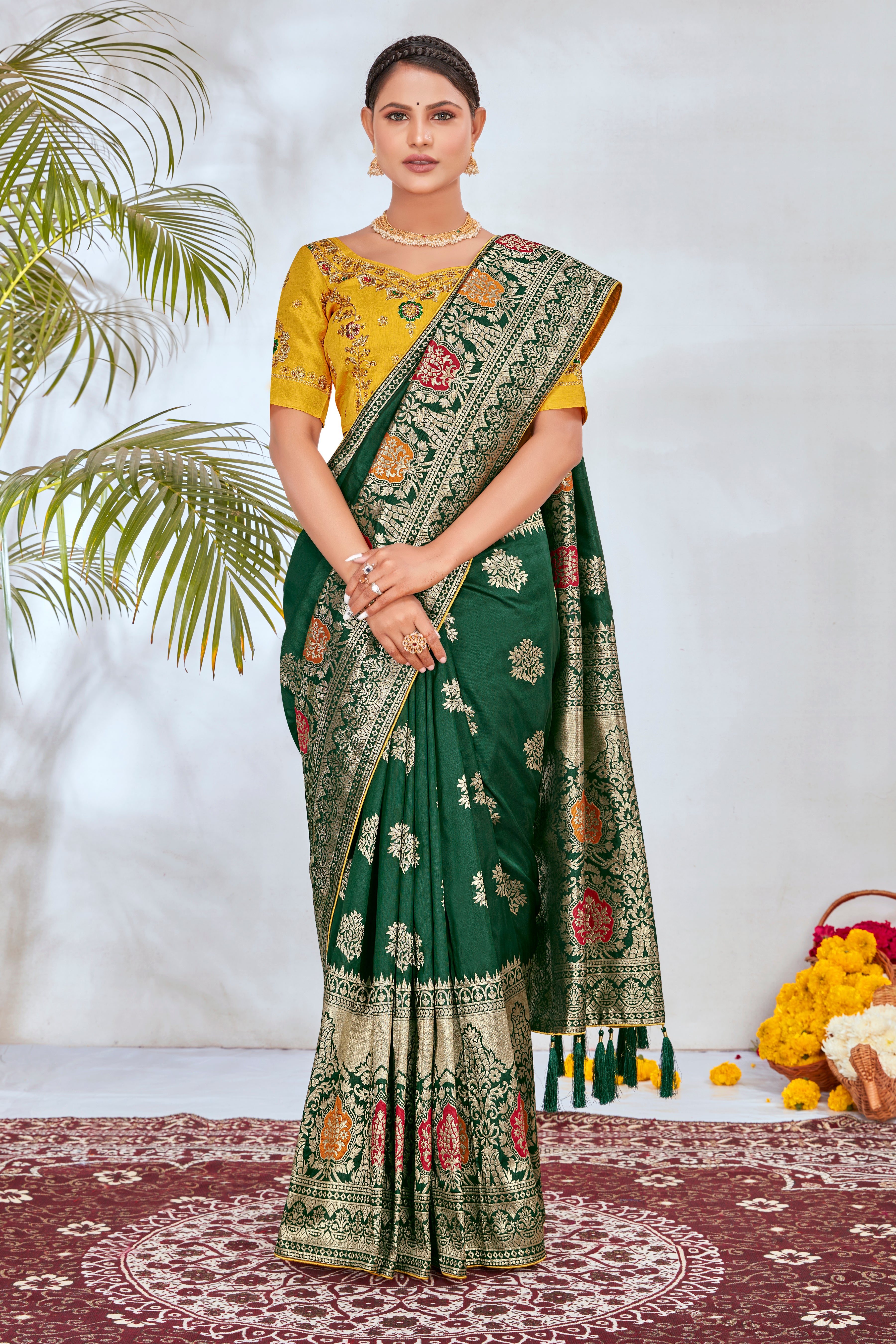Monjolika Fashion Presents Beautifully Designer Dark Green color Silk Blend Woven Saree.This Saree Comes With Silk Blouse Piece. Work, Design And Fabric Of This Sari Gives Elegant And Classy Look To You.The Saree length is 5.5 mtr and Comes With 0.80 Cm Separate Blouse Piece. It Is Unstitched And Can Be Altered According To Your Desired Style And Fit.Due to the high and fragile quality of the material, dry cleaning is the best method to take care of the fabric. Especially in cases of stains, it is advisable to seek professional assistance.