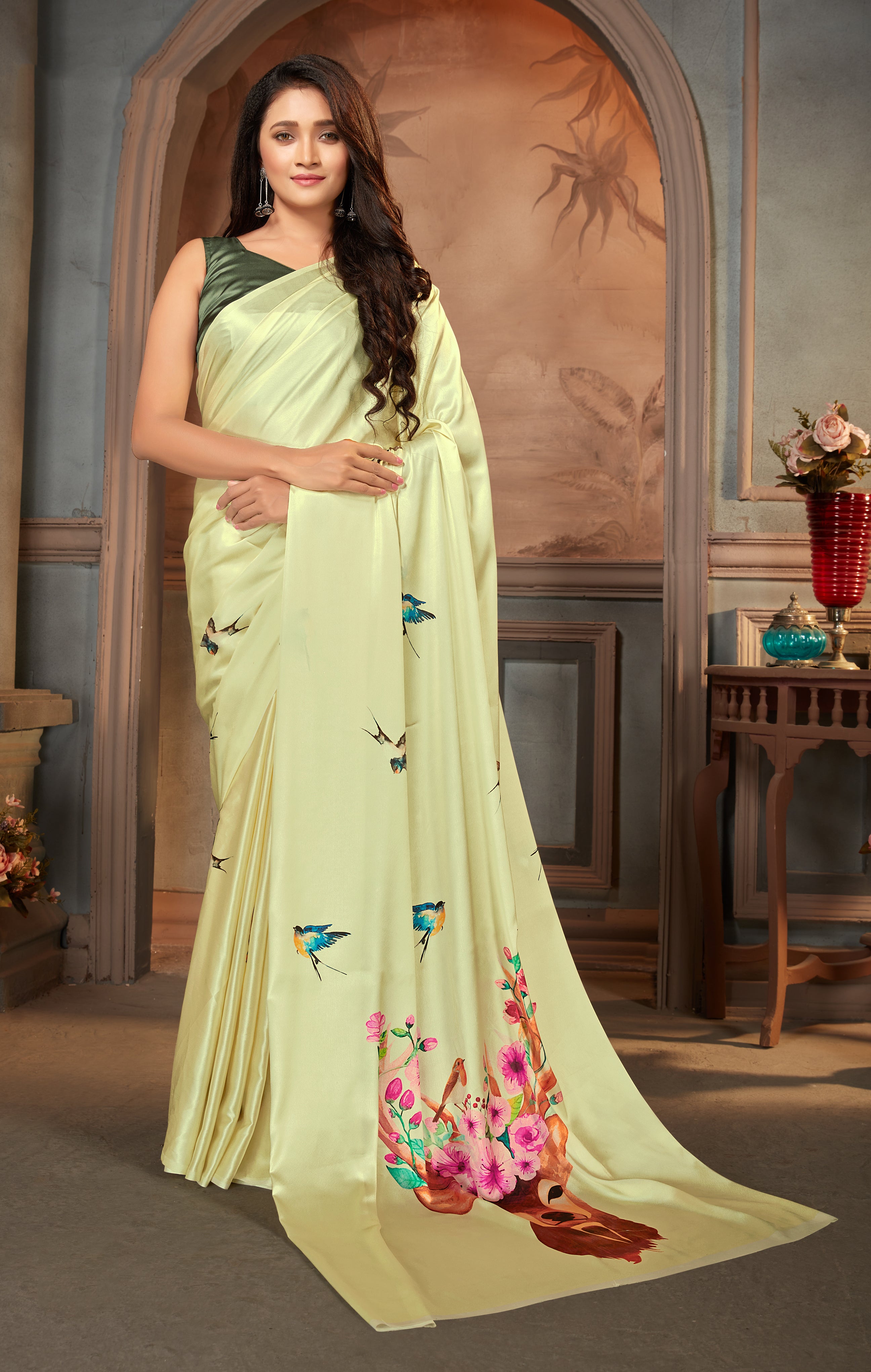 Monjolika Fashion Presents An Outstanding Light Yellow Color Satin Crepe Fabric Trendy Saree Will Make You Look Very Stylish And Graceful. The Beautiful Digital Print Work A Intensive Characteristic Of This Attire. Comes With Matching White Color Satin Crepe Blouse.