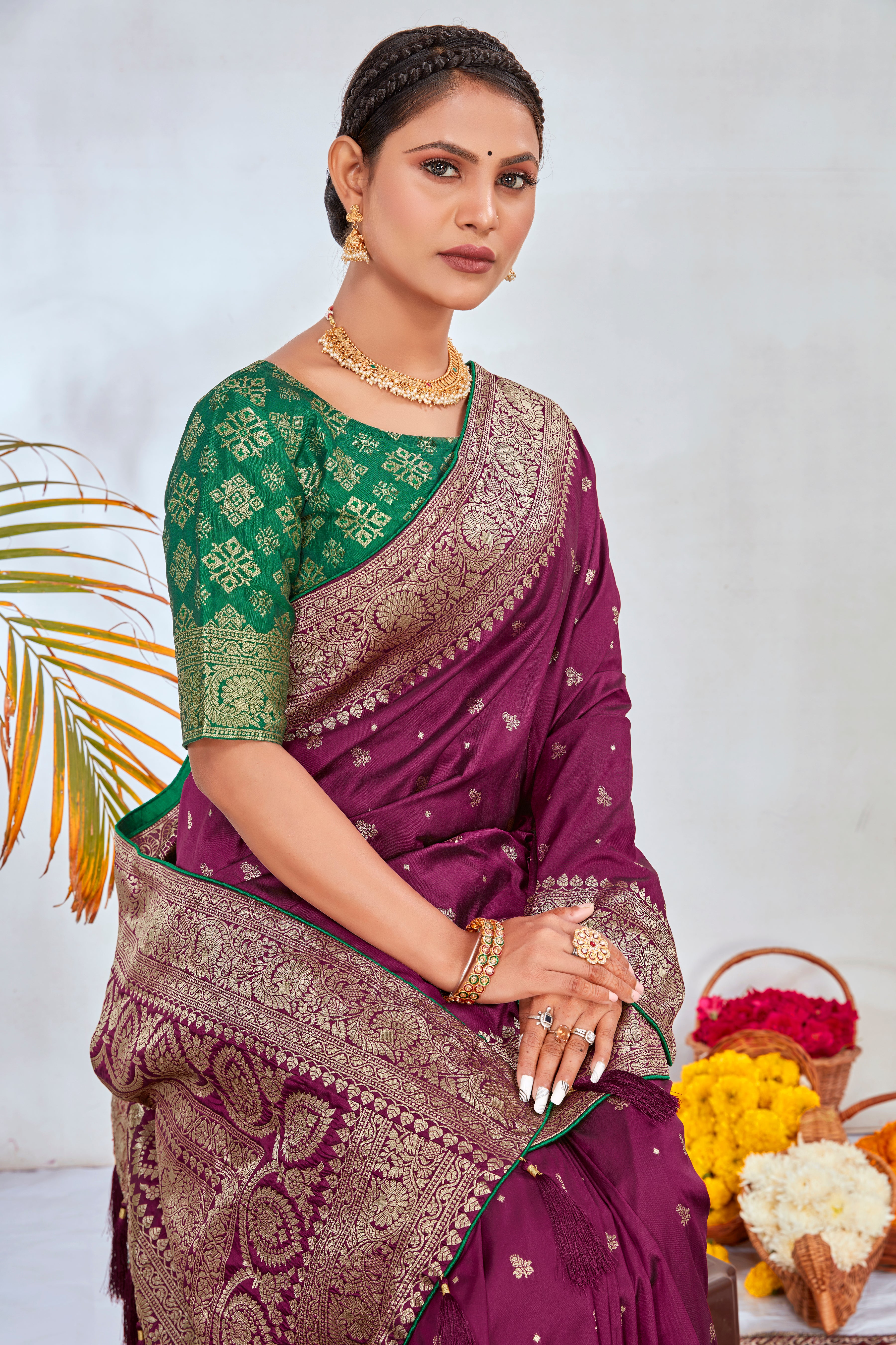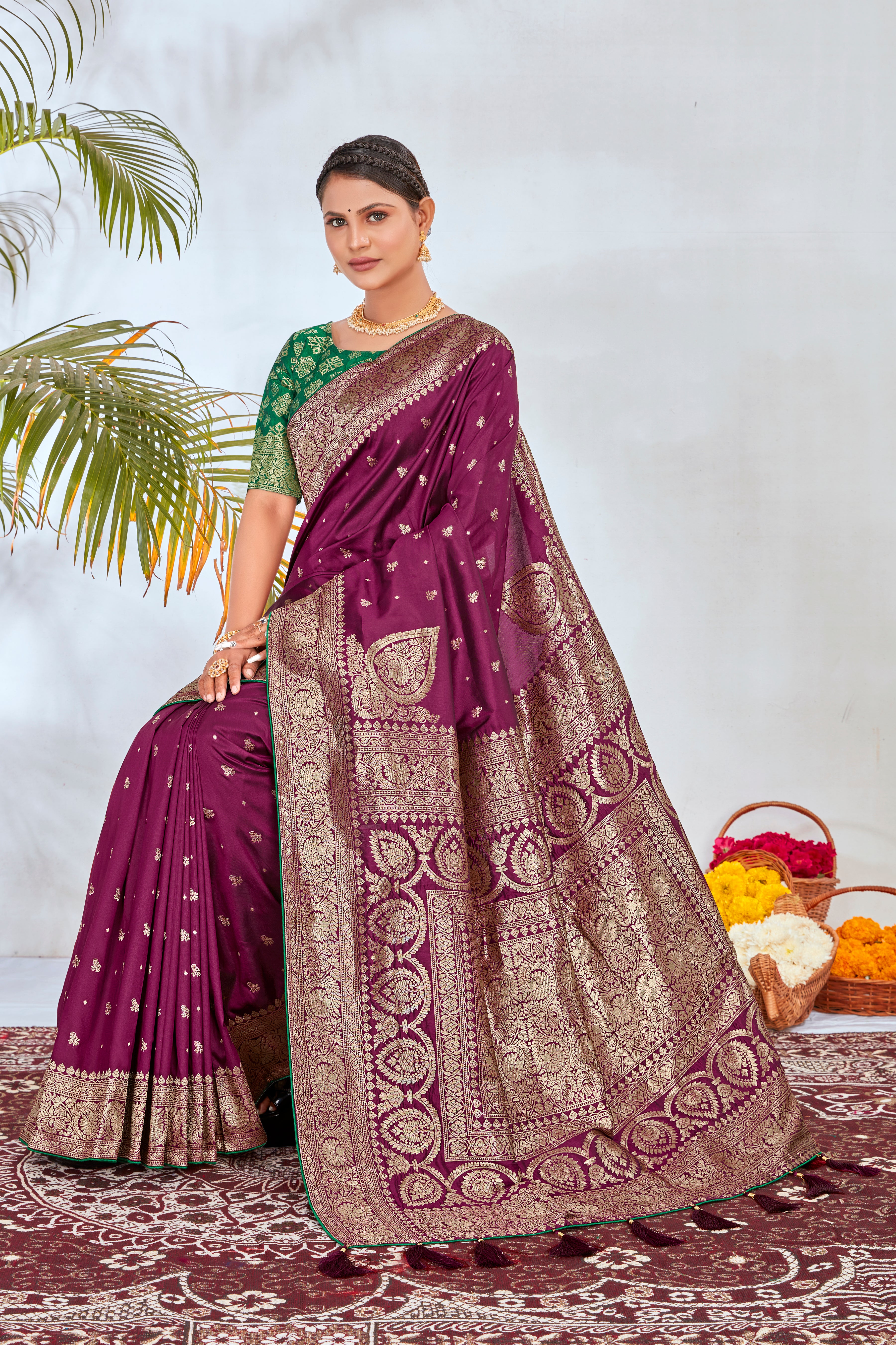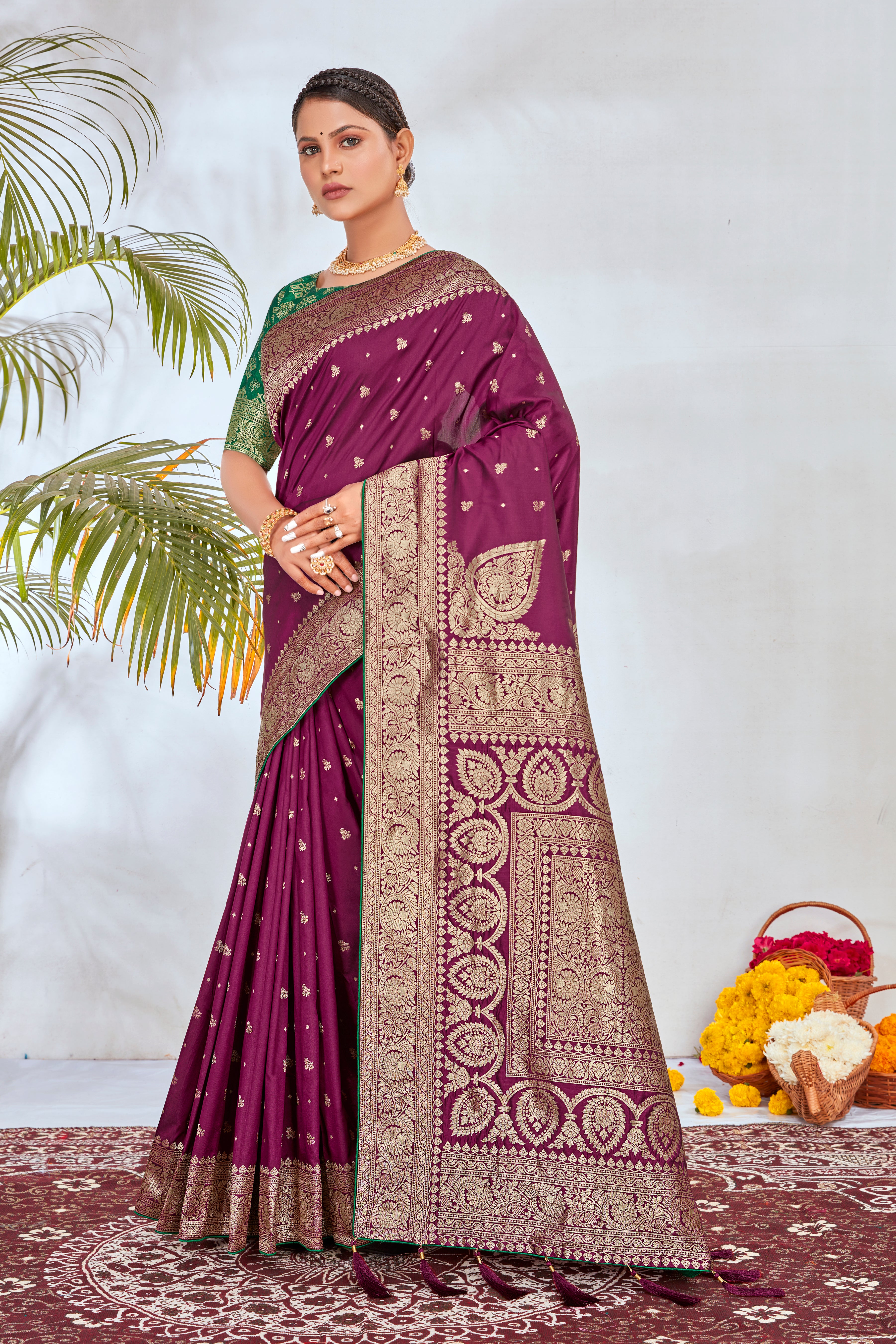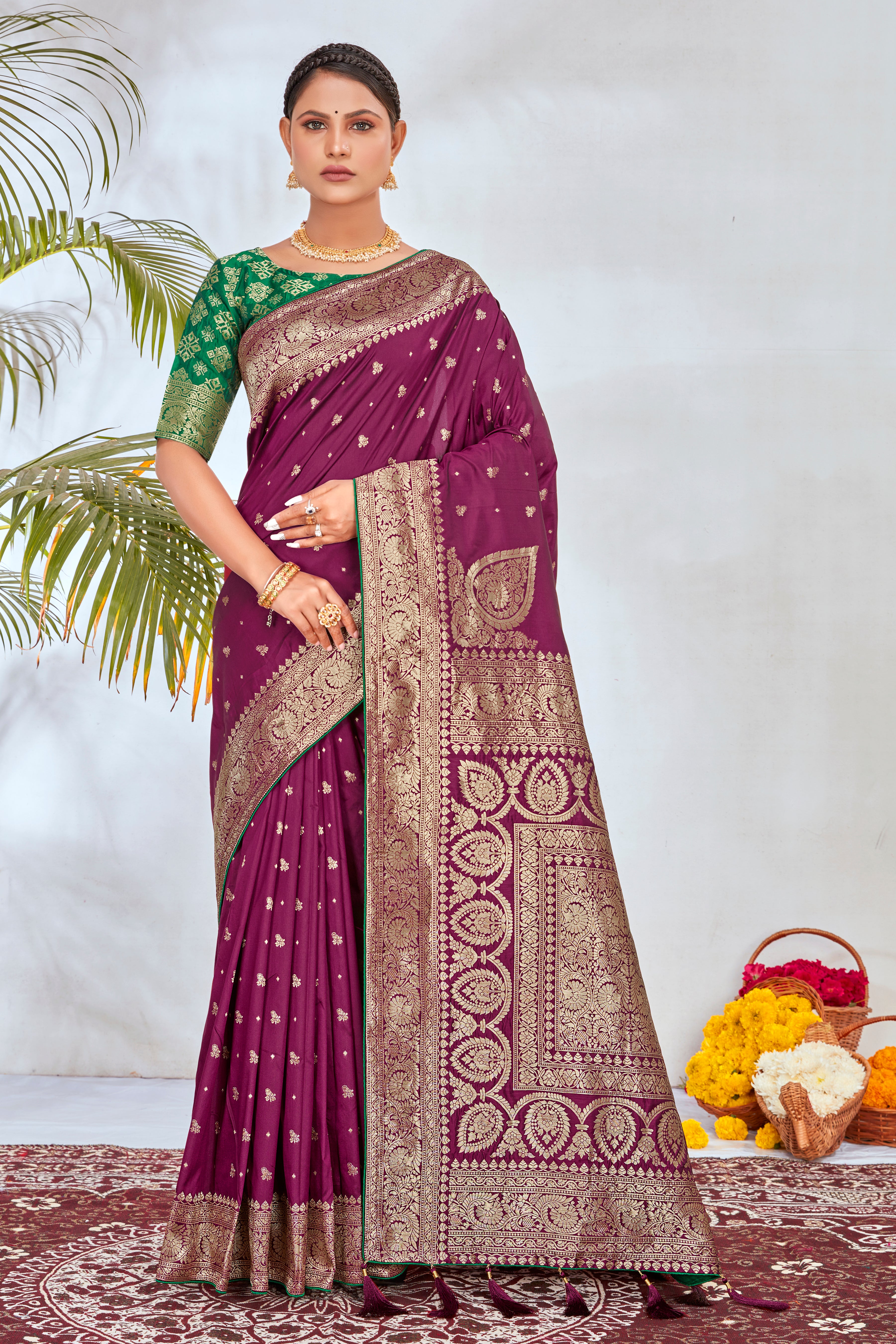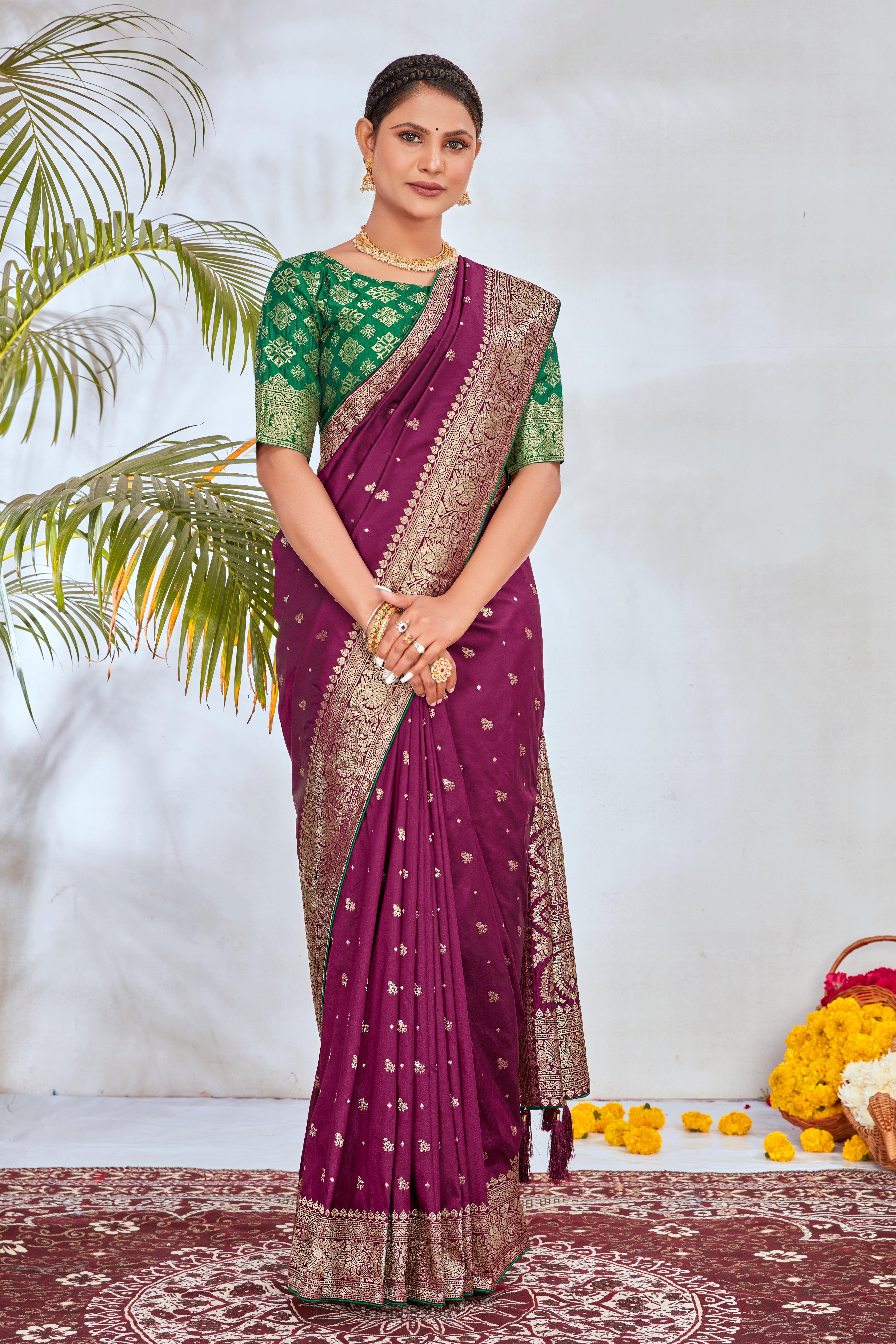 Monjolika Fashion Presents Beautifully Designer Silk Blend Woven Saree. Work, Design And Fabric Of This Saree Gives Elegant And Classy Look To You. Add grace and charm to your appearance in this beautiful Magenta combination banarasi silk traditional designer saree. You can see some fascinating patterns done with woven work. It Is Unstitched And Can Be Altered According To Your Desired Style And Fit. Banarasi Silk saree in a soft smooth texture. The saree is adorned with colorful woven borders, and intricate motifs all over the body. The pretty patterns appear to float on the sheer body of the sarees, creating a mystical look. The fine, soft texture makes it a pleasure to drape it.