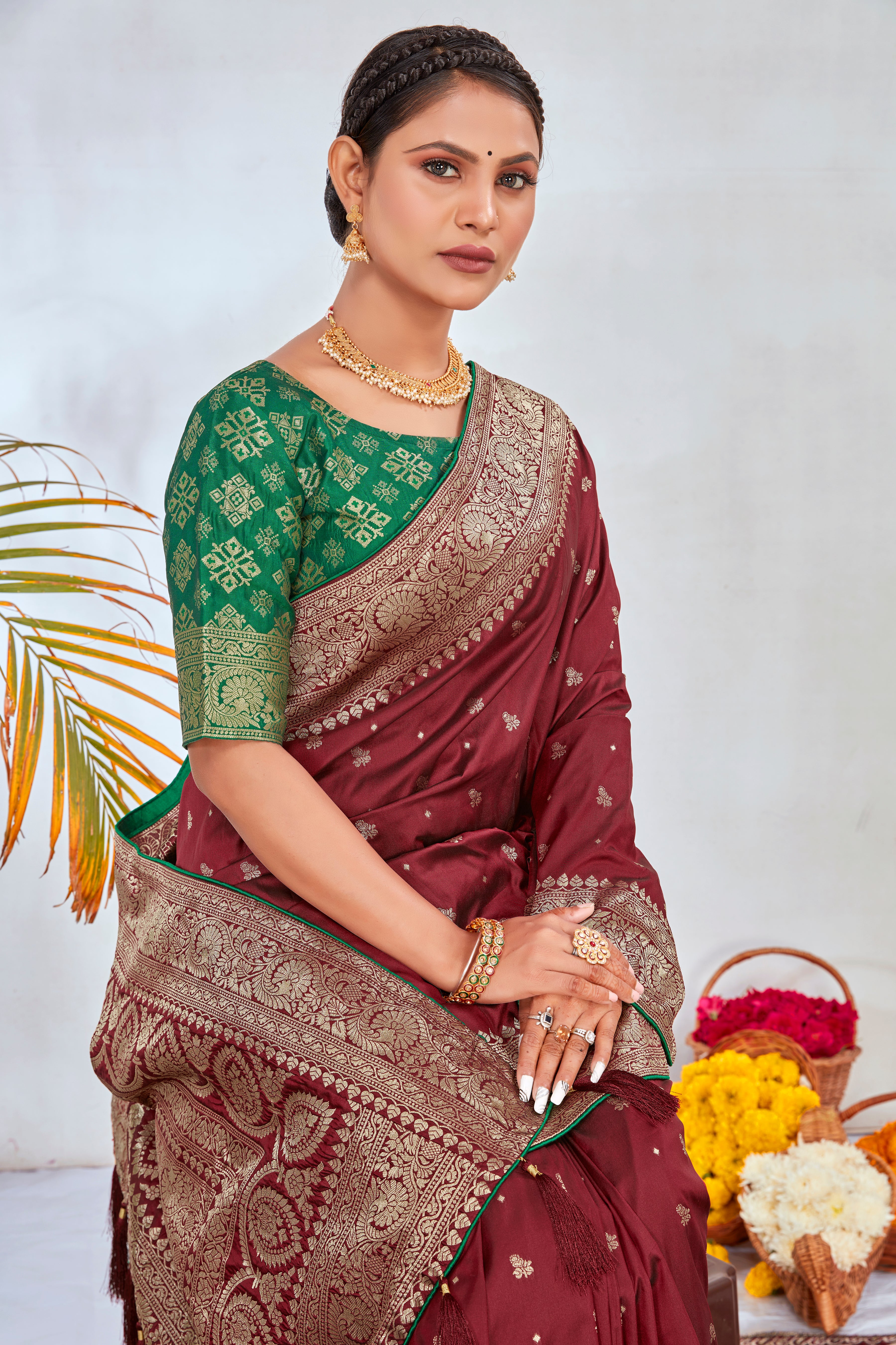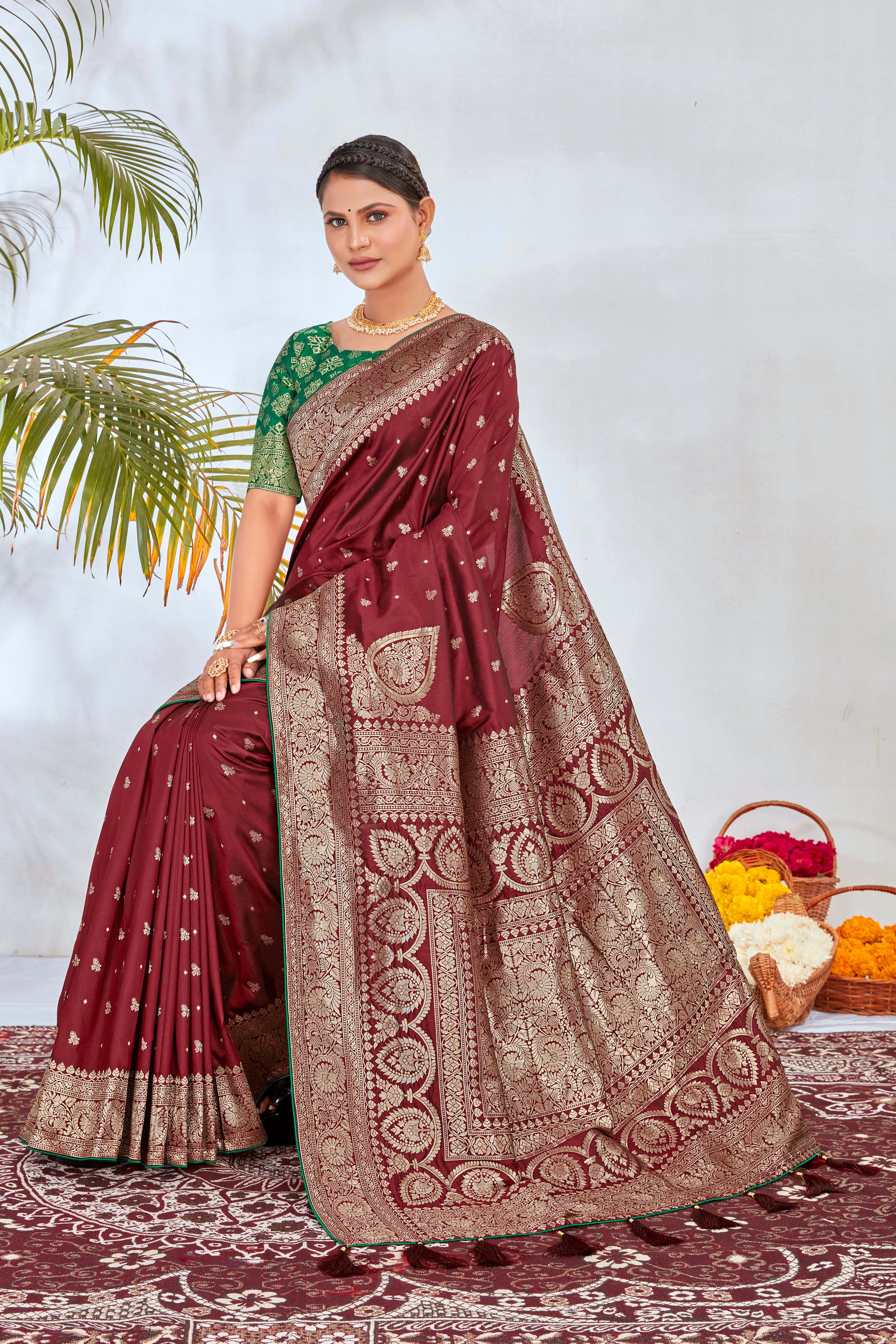 Monjolika Fashion Presents Beautifully Designer Silk Blend Woven Saree. Work, Design And Fabric Of This Saree Gives Elegant And Classy Look To You. Add grace and charm to your appearance in this beautiful Maroon combination banarasi silk traditional designer saree. You can see some fascinating patterns done with woven work. It Is Unstitched And Can Be Altered According To Your Desired Style And Fit. Banarasi Silk saree in a soft smooth texture. The saree is adorned with colorful woven borders, and intricate motifs all over the body. The pretty patterns appear to float on the sheer body of the sarees, creating a mystical look. The fine, soft texture makes it a pleasure to drape it.