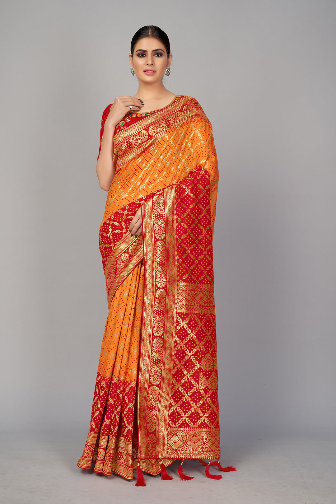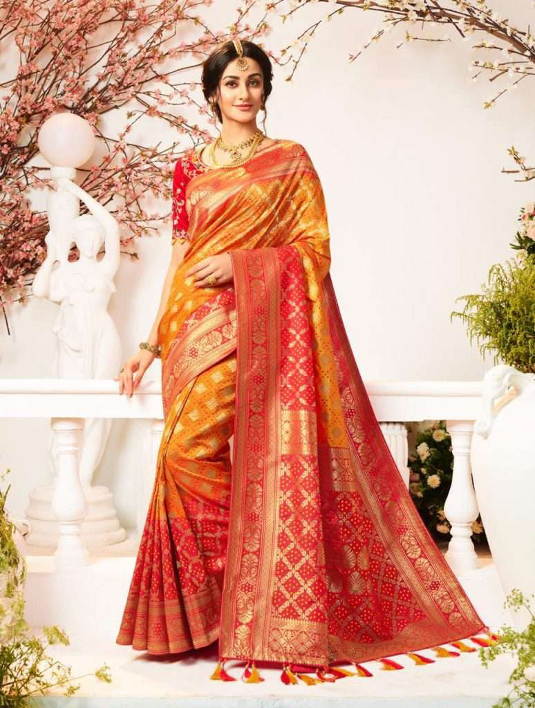Monjolika Fashion Presents An Outstanding Orange And Red Color Silk Blend Trendy Saree Will Make You Look Very Stylish And Graceful. The Beautiful Weaving Work A Intensive Characteristic Of This Attire. Comes With Matching Red Color Silk Heavy Embroidered Work Blouse.