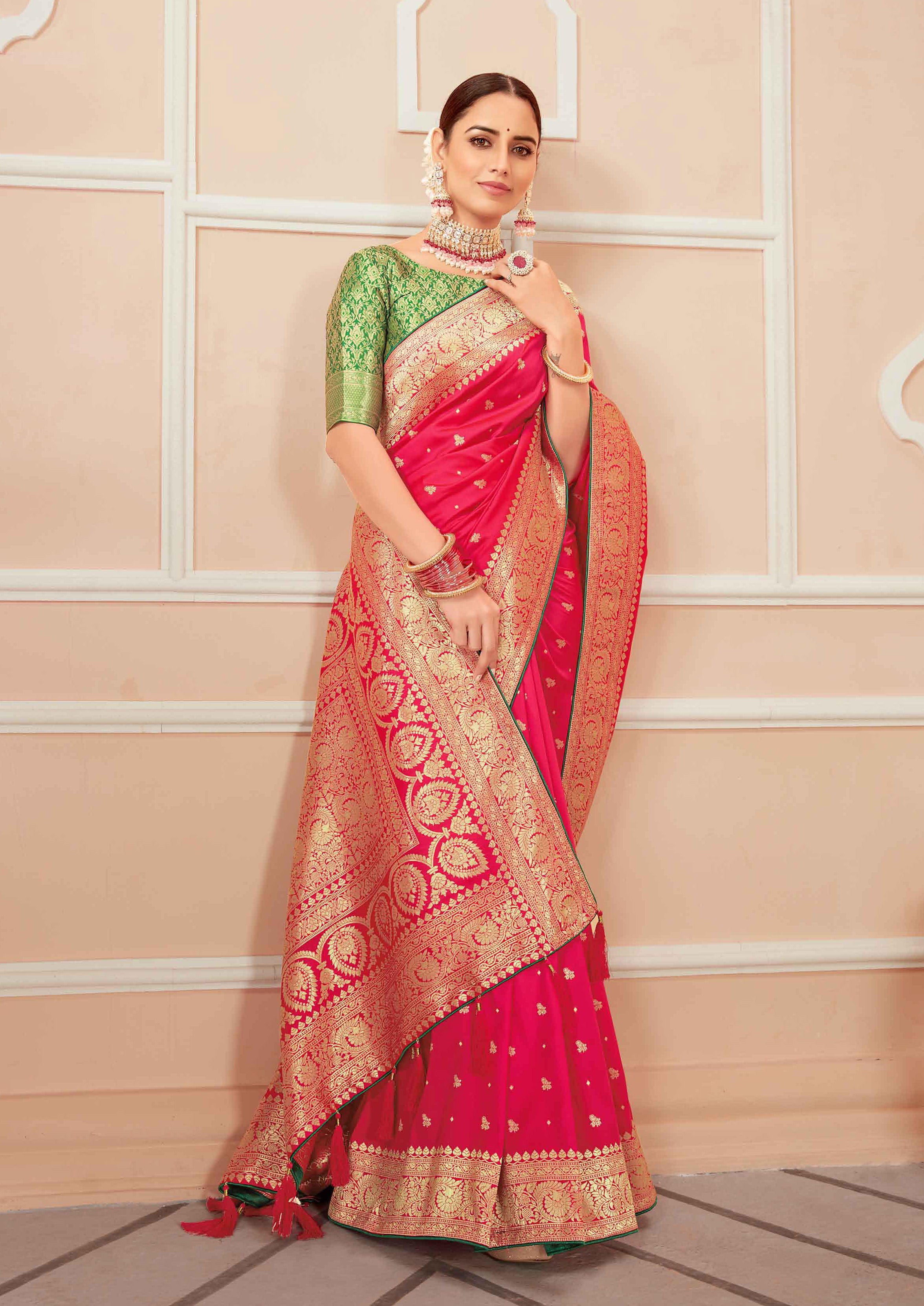 Monjolika Fashion Presents Beautifully Designer Pink color Silk Blend Woven Saree. Work, Design And Fabric Of This Saree Gives Elegant And Classy Look To You. Add grace and charm to your appearance in this beautiful Pink combination banarasi silk traditional designer saree. You can see some fascinating patterns done with woven work. It Is Unstitched And Can Be Altered According To Your Desired Style And Fit. Banarasi Silk saree in a soft smooth texture. The saree is adorned with colorful woven borders, and intricate motifs all over the body. The pretty patterns appear to float on the sheer body of the sarees, creating a mystical look. The fine, soft texture makes it a pleasure to drape it.
