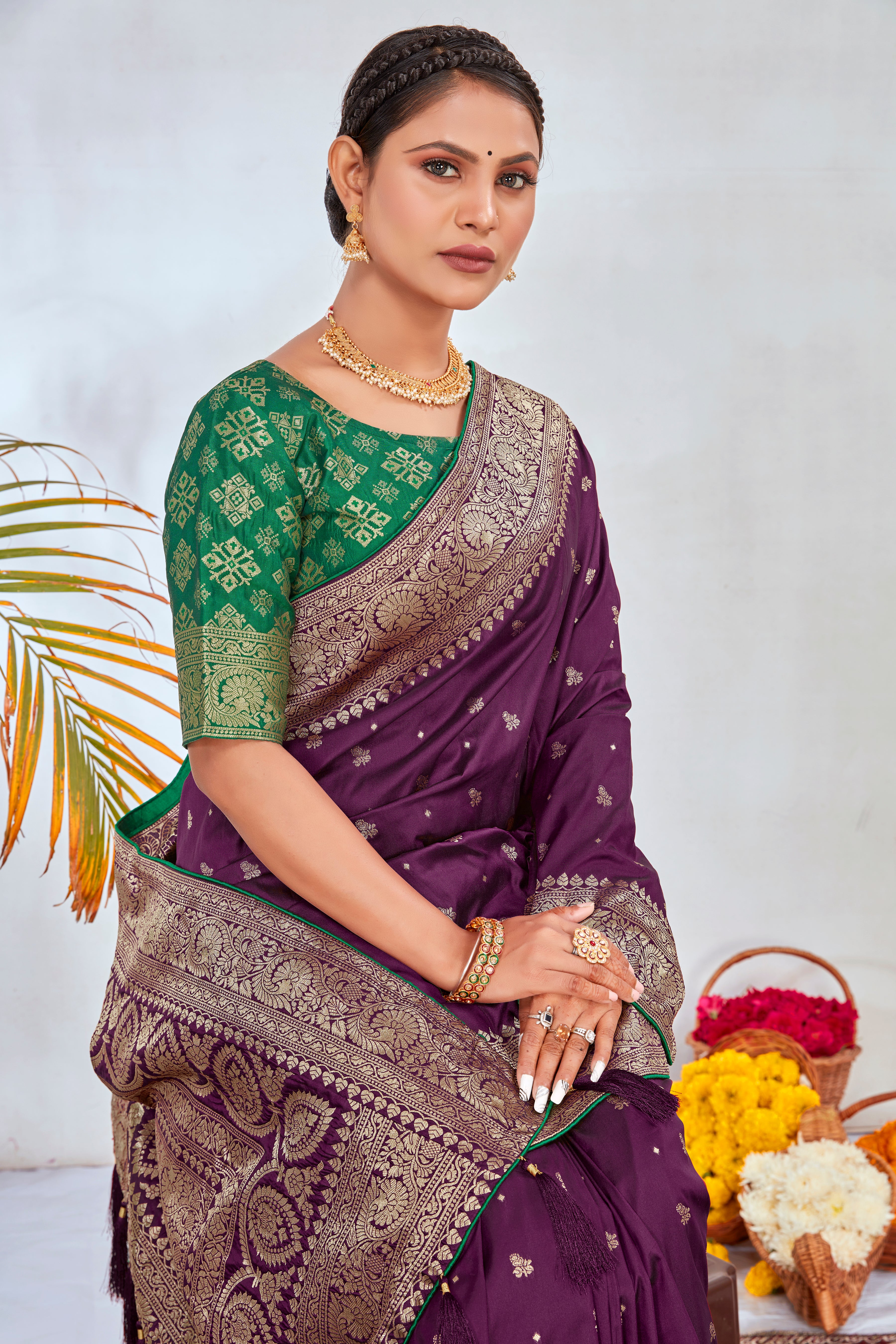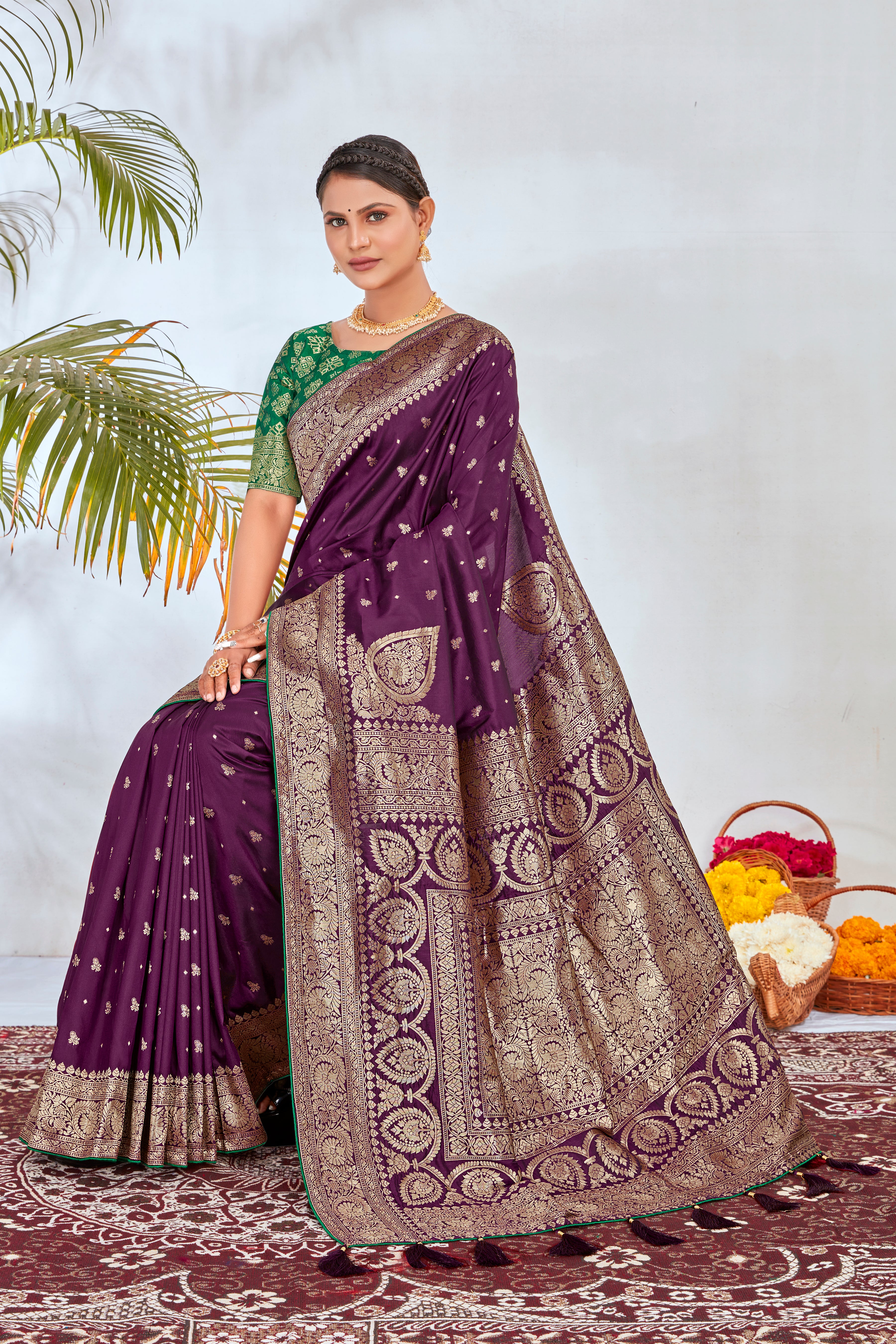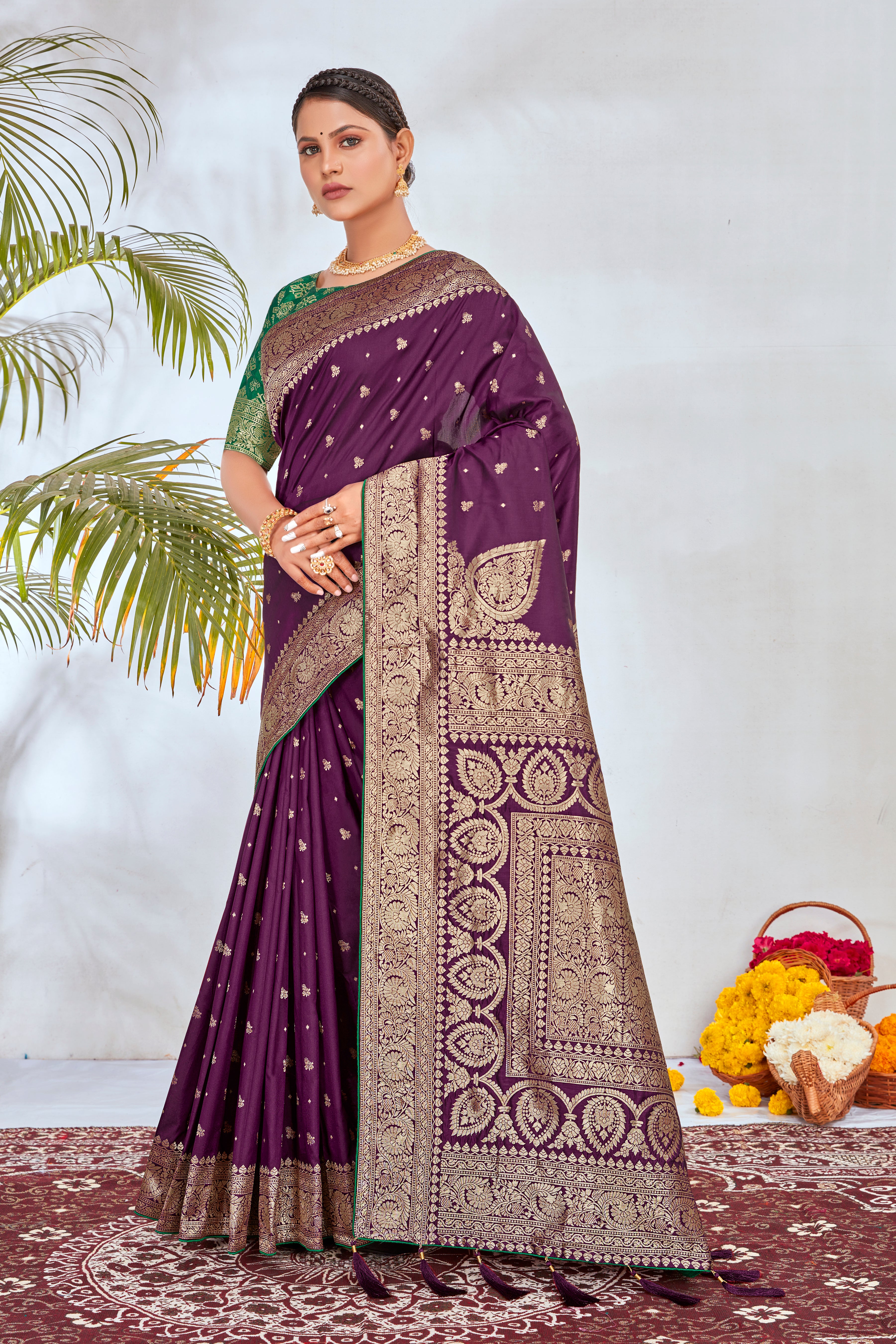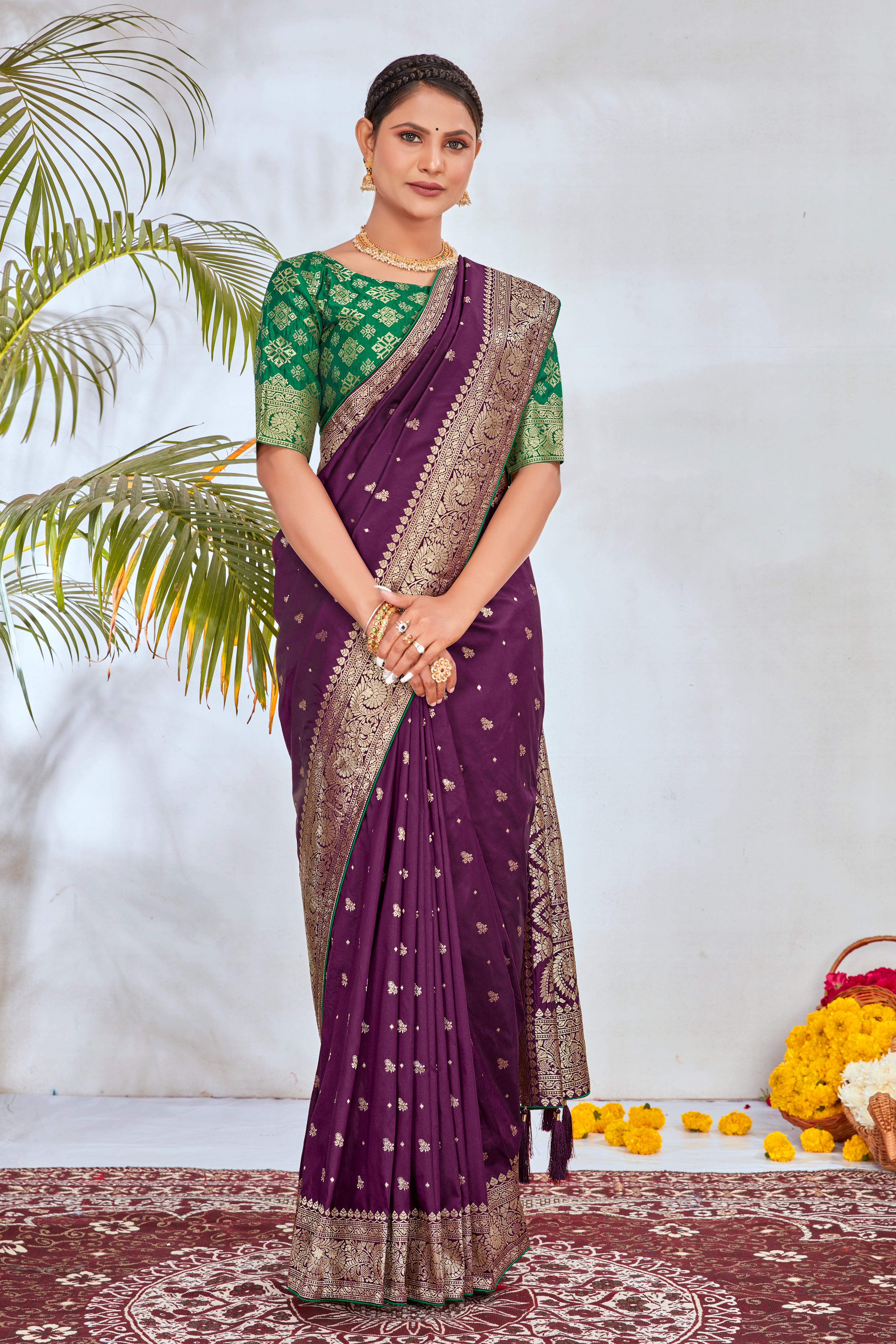 Monjolika Fashion Presents Beautifully Designer Silk Blend Woven Saree. Work, Design And Fabric Of This Saree Gives Elegant And Classy Look To You. Add grace and charm to your appearance in this beautiful Purple combination banarasi silk traditional designer saree. You can see some fascinating patterns done with woven work. It Is Unstitched And Can Be Altered According To Your Desired Style And Fit. Banarasi Silk saree in a soft smooth texture. The saree is adorned with colorful woven borders, and intricate motifs all over the body. The pretty patterns appear to float on the sheer body of the sarees, creating a mystical look. The fine, soft texture makes it a pleasure to drape it.