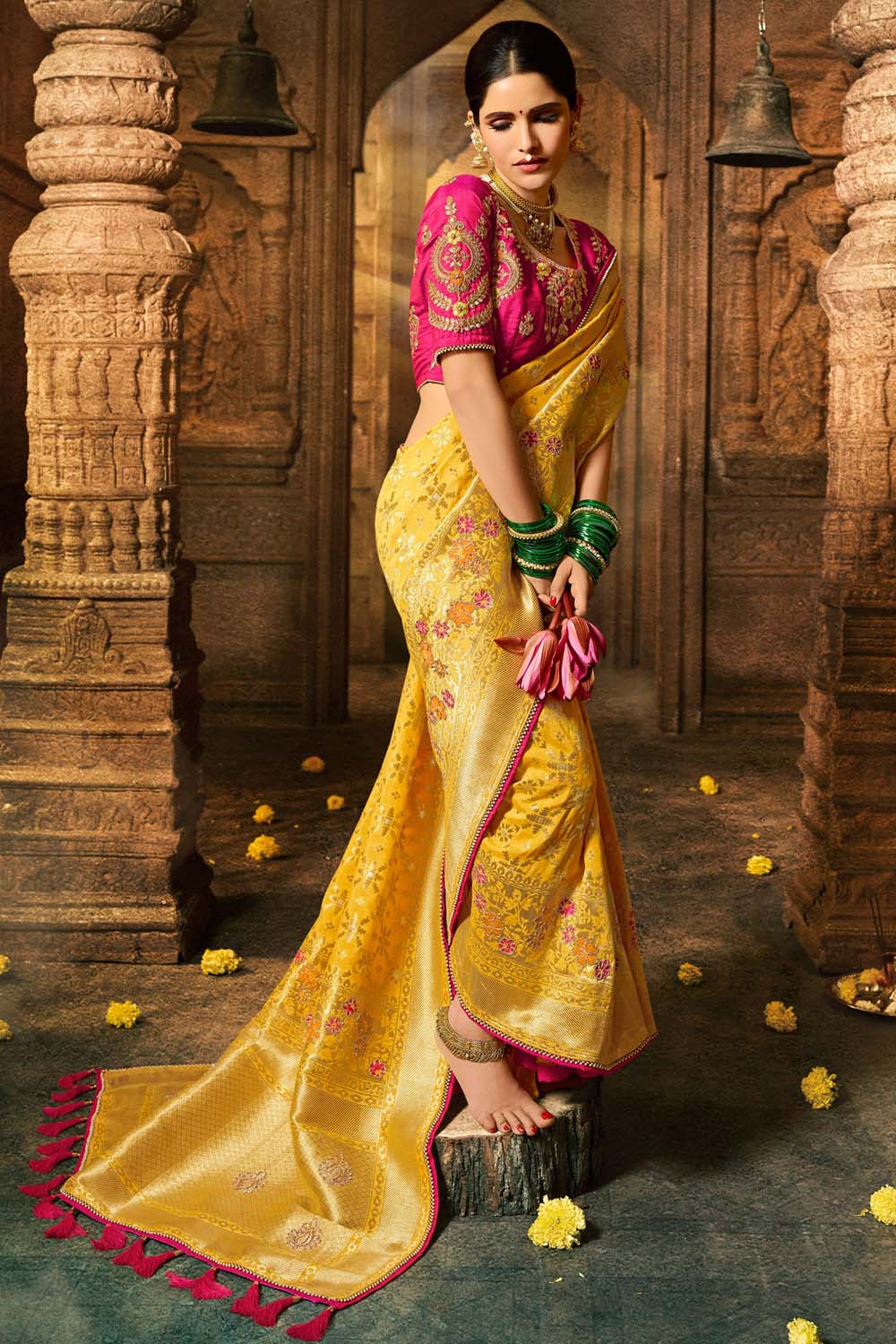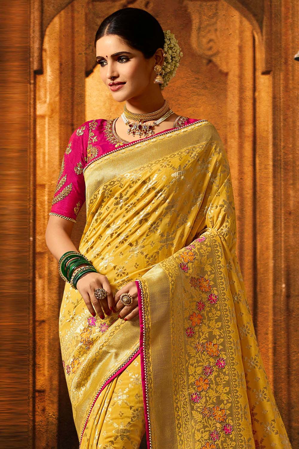 "Monjolika Fashion presents Mesmerize everyone around by draping into this designer saree. This Traditional wear Yellow color banarasi silk saree is decorated with fancy Woven work. The saree comes along with unstitched Pink color Embroidered blouse piece."